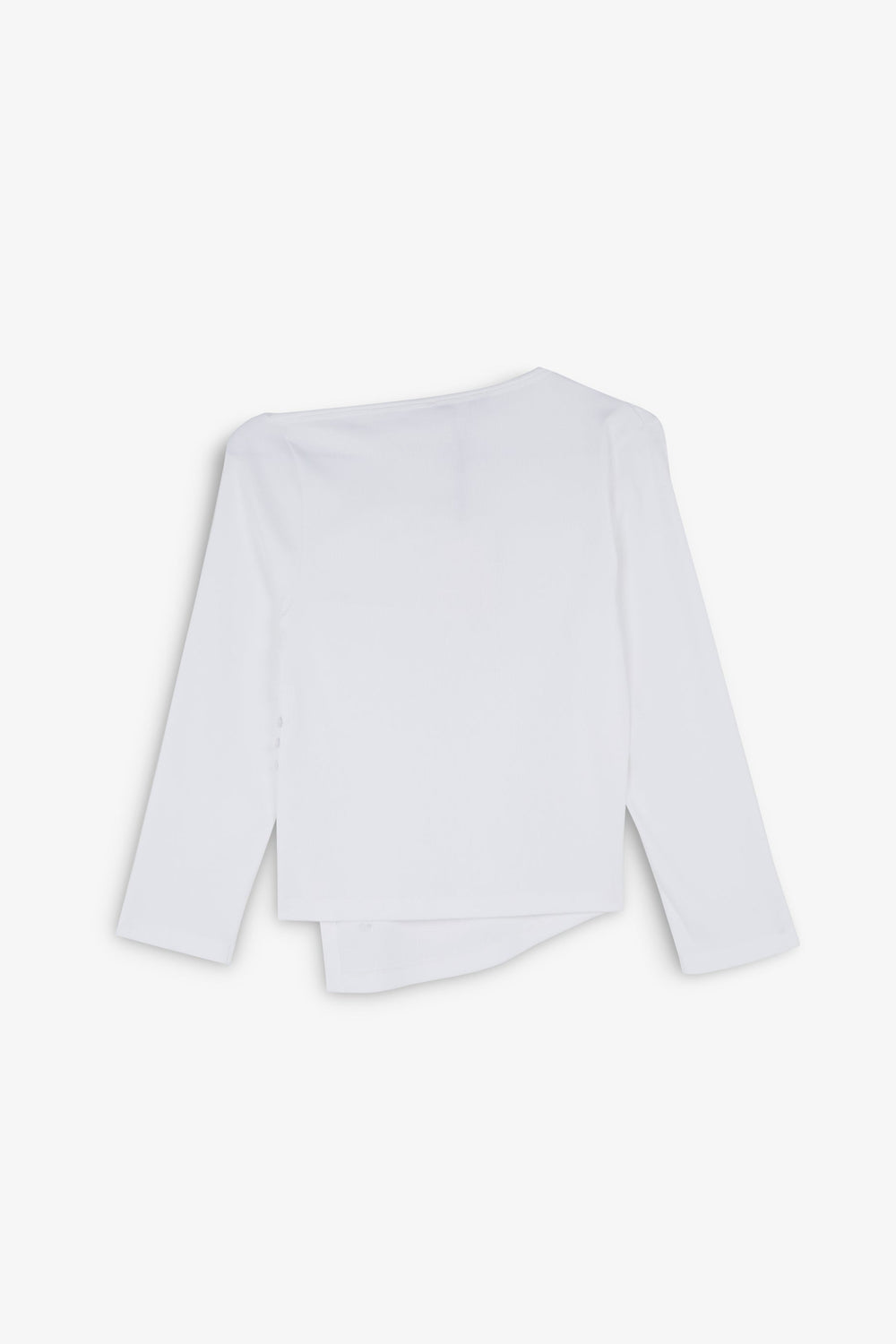T-shirt made of 100% BCI cotton. Slim fit, open asymmetric neck and three quarter length sleeves. Asymmetric hem with button details.