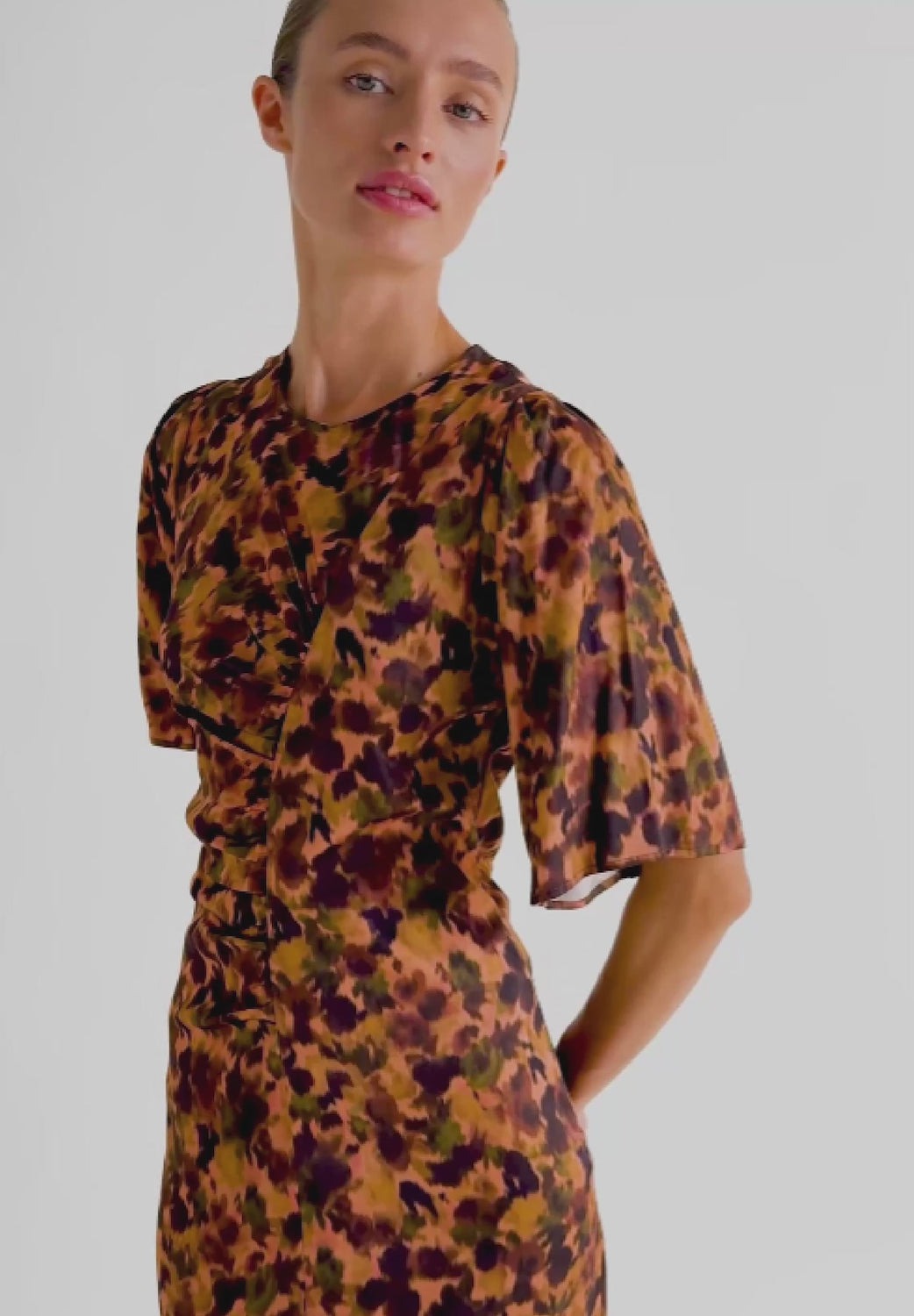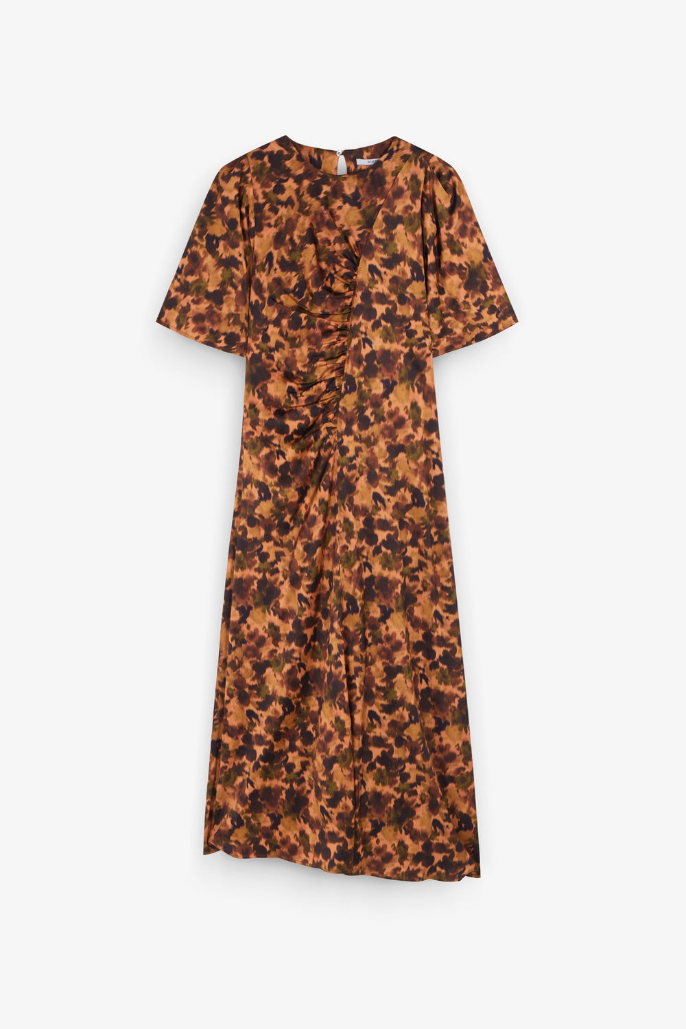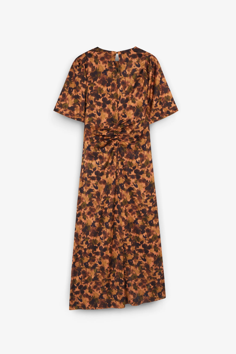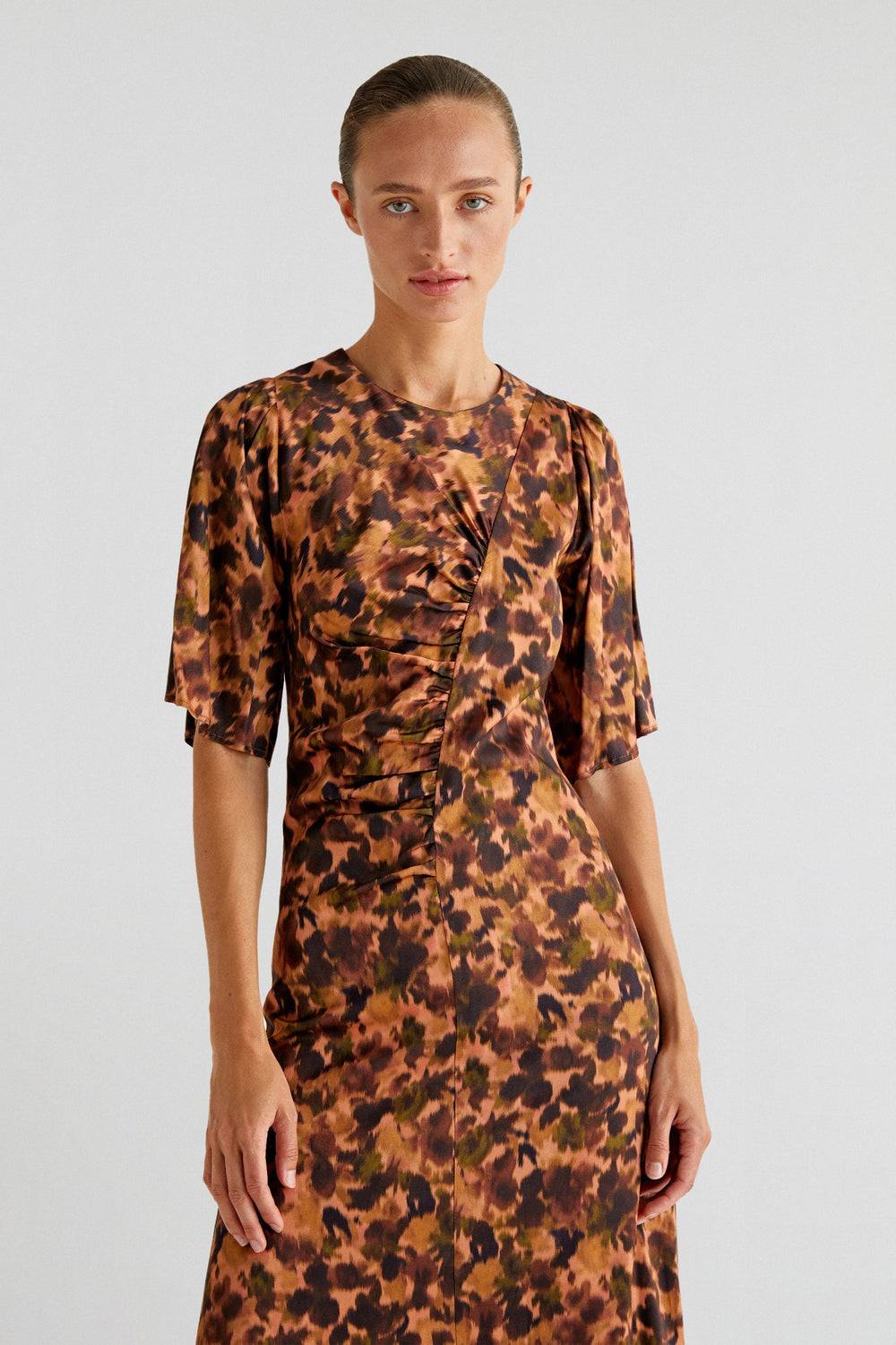 Draped midi dress with central seam. Short sleeves and back button eyelets.