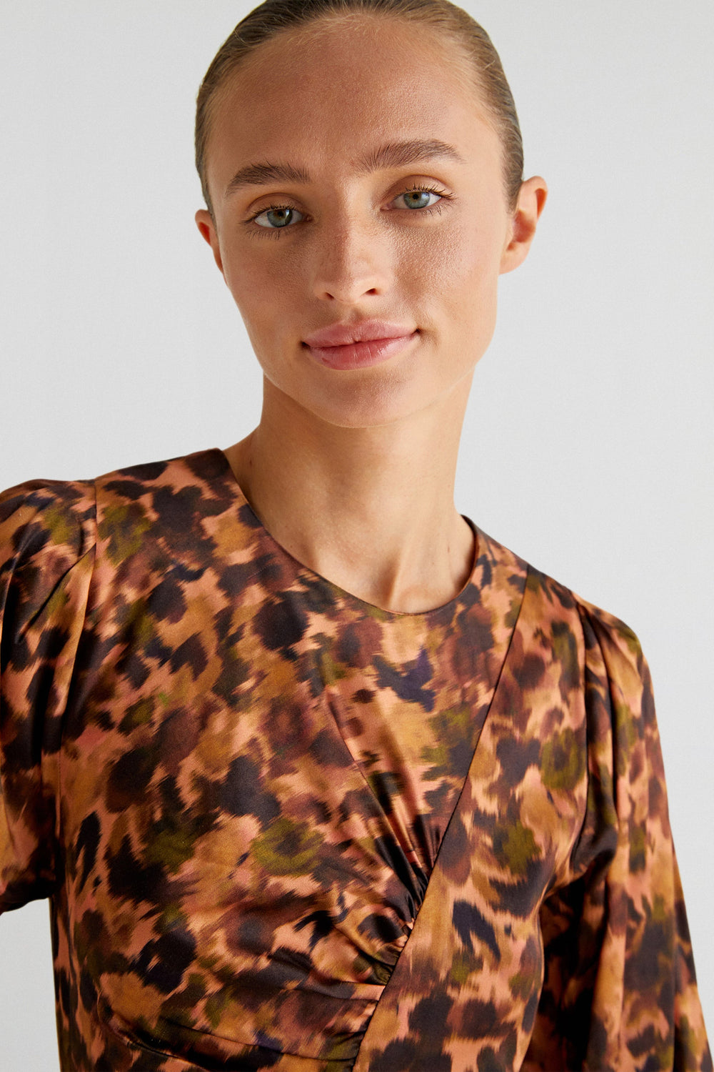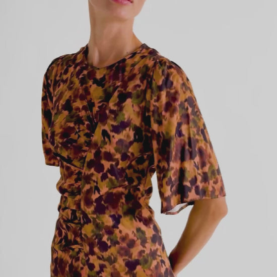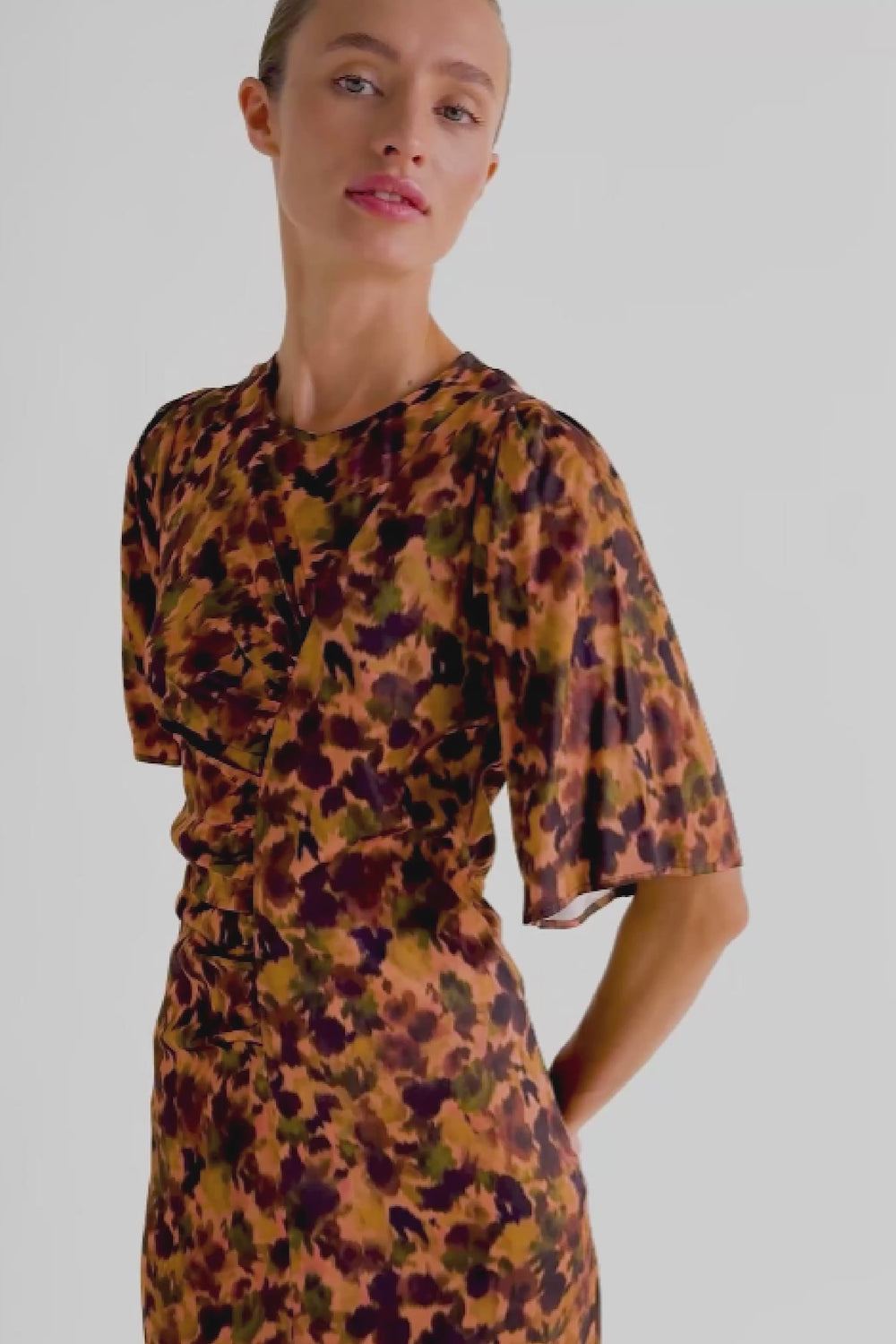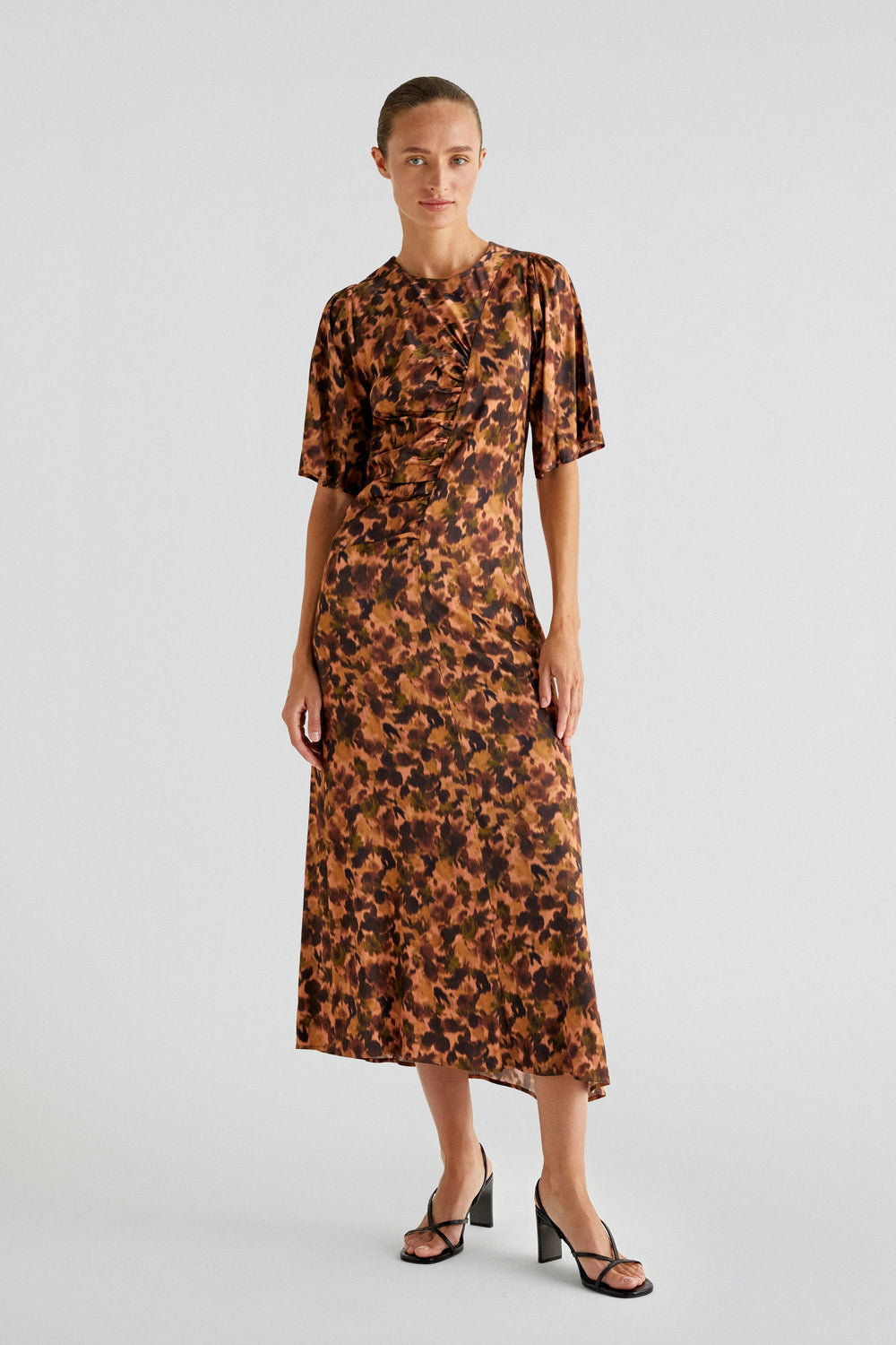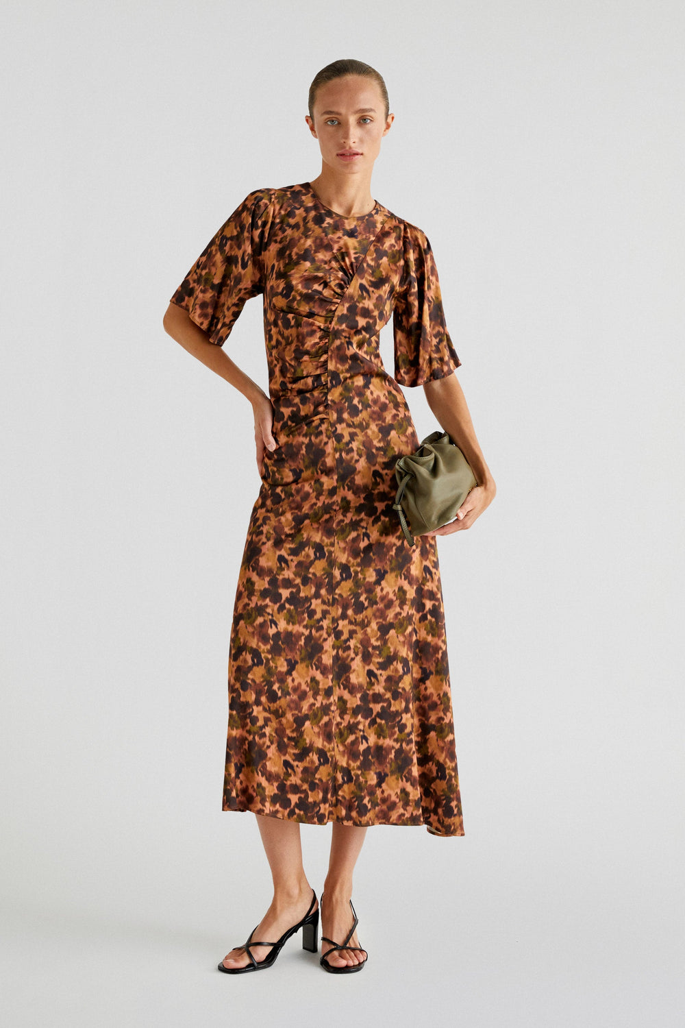 Draped midi dress with central seam. Short sleeves and back button eyelets.
