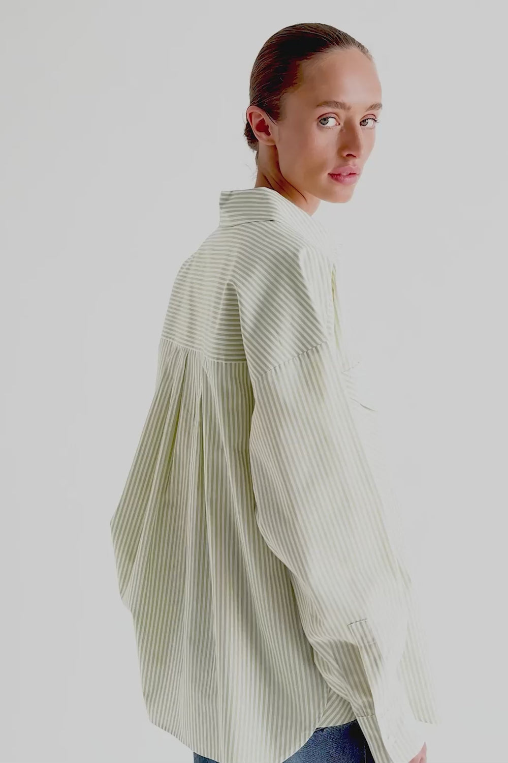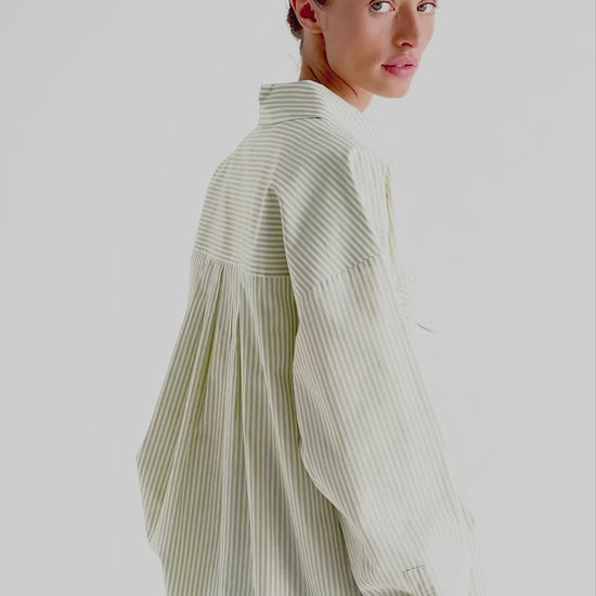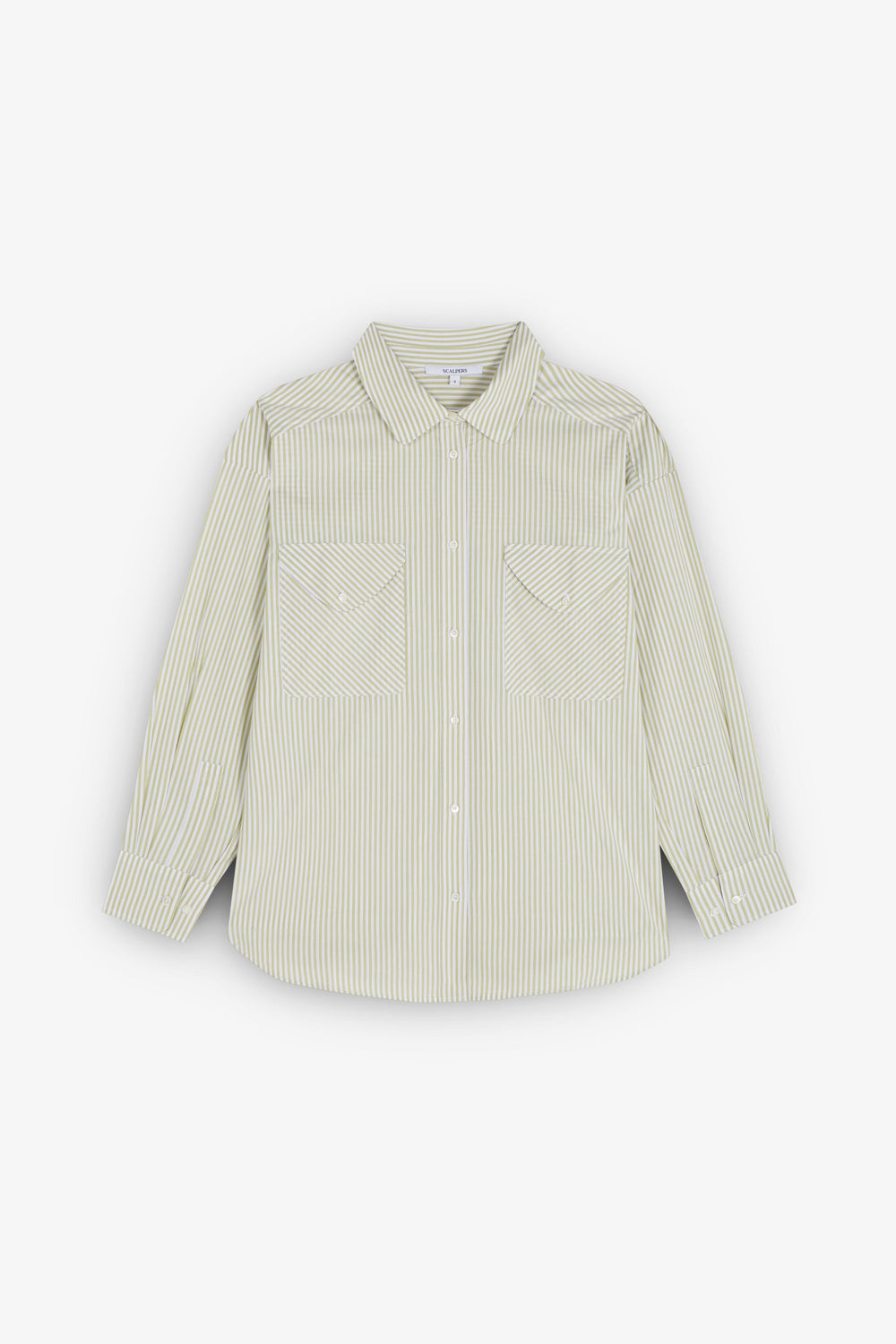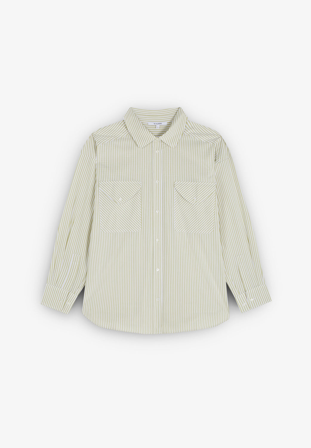 Striped shirt with front pockets. Oversize fit. Made of 100% cotton. Lapel collar. Front button fastening. Long sleeves with buttoned cuffs. Front chest flap pockets.
