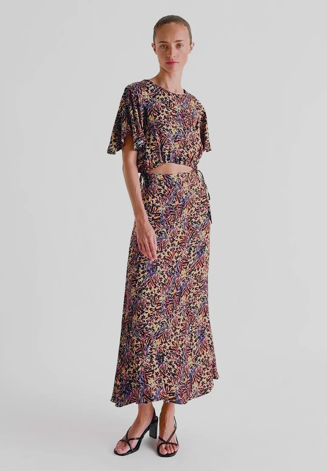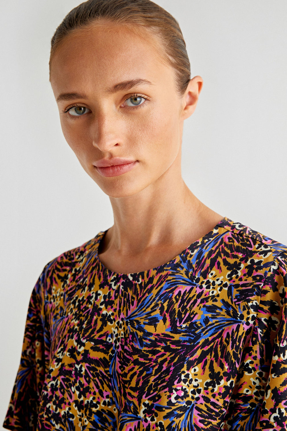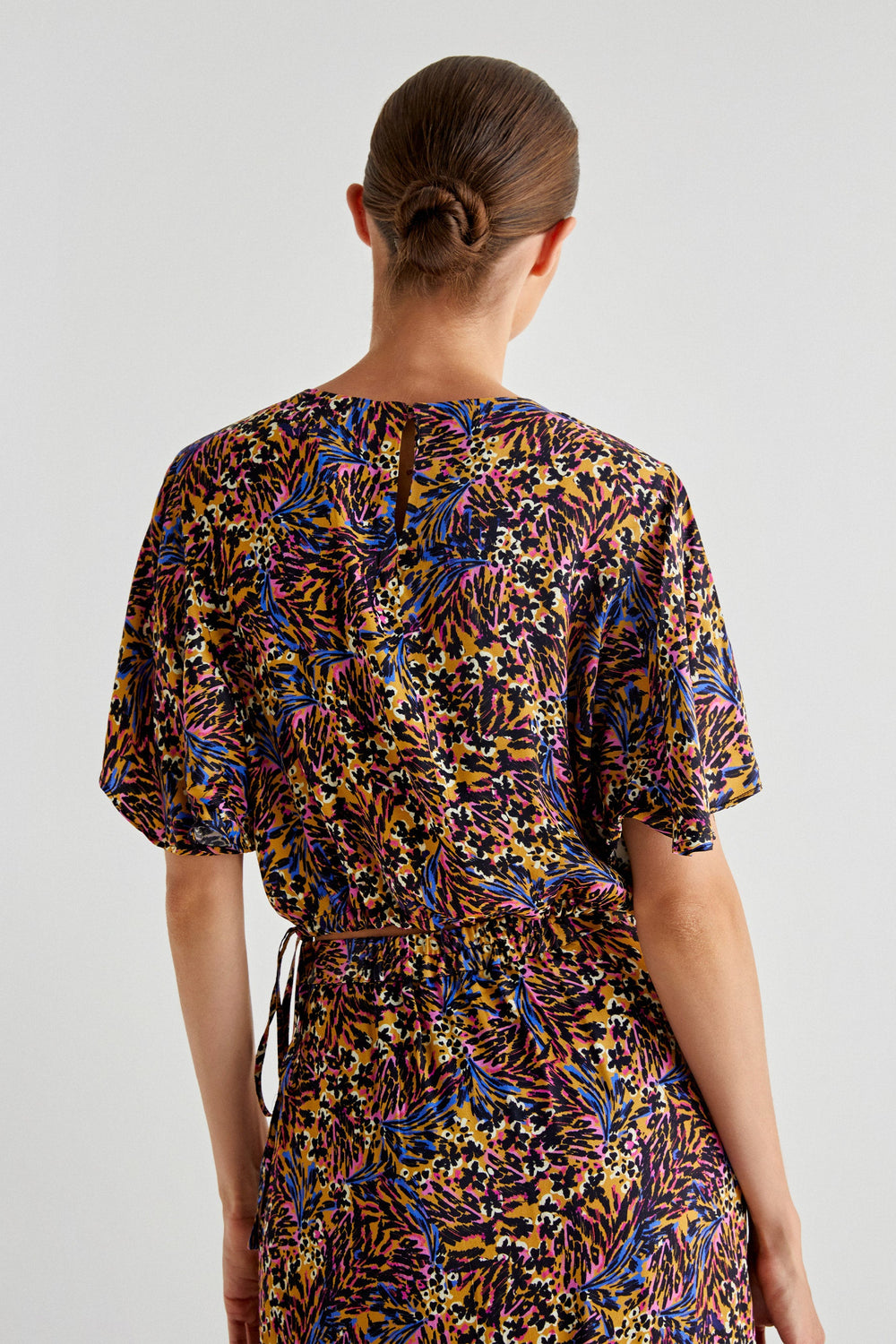 Printed crop top. Regular fit, back button fastening. Short sleeves and adjustable drawstring at the hem.