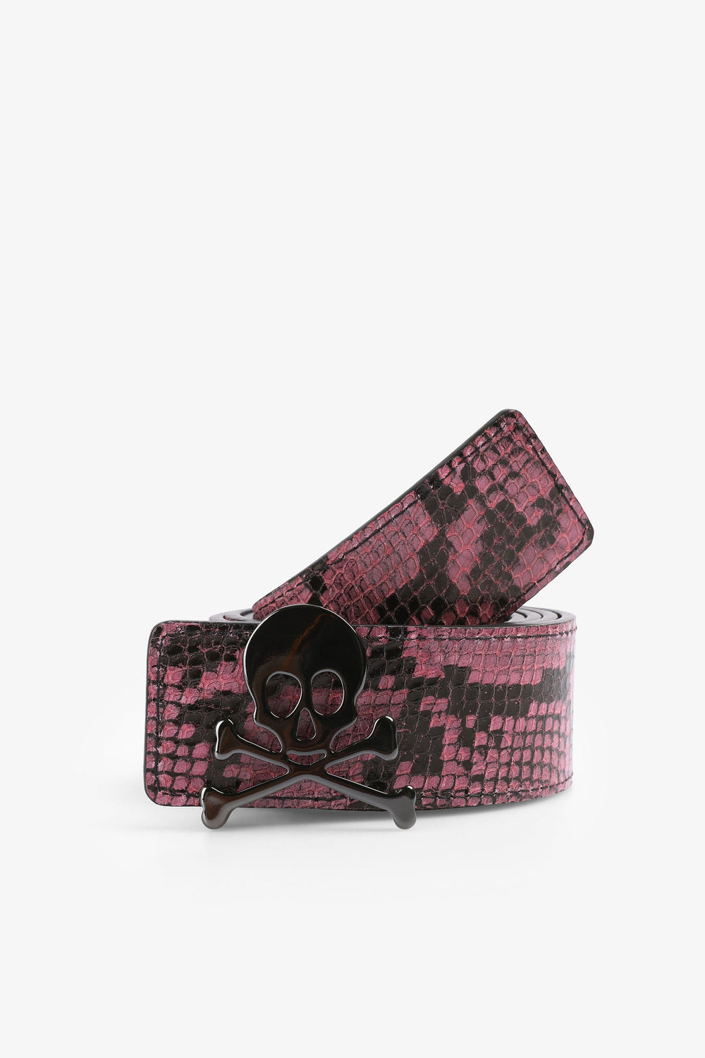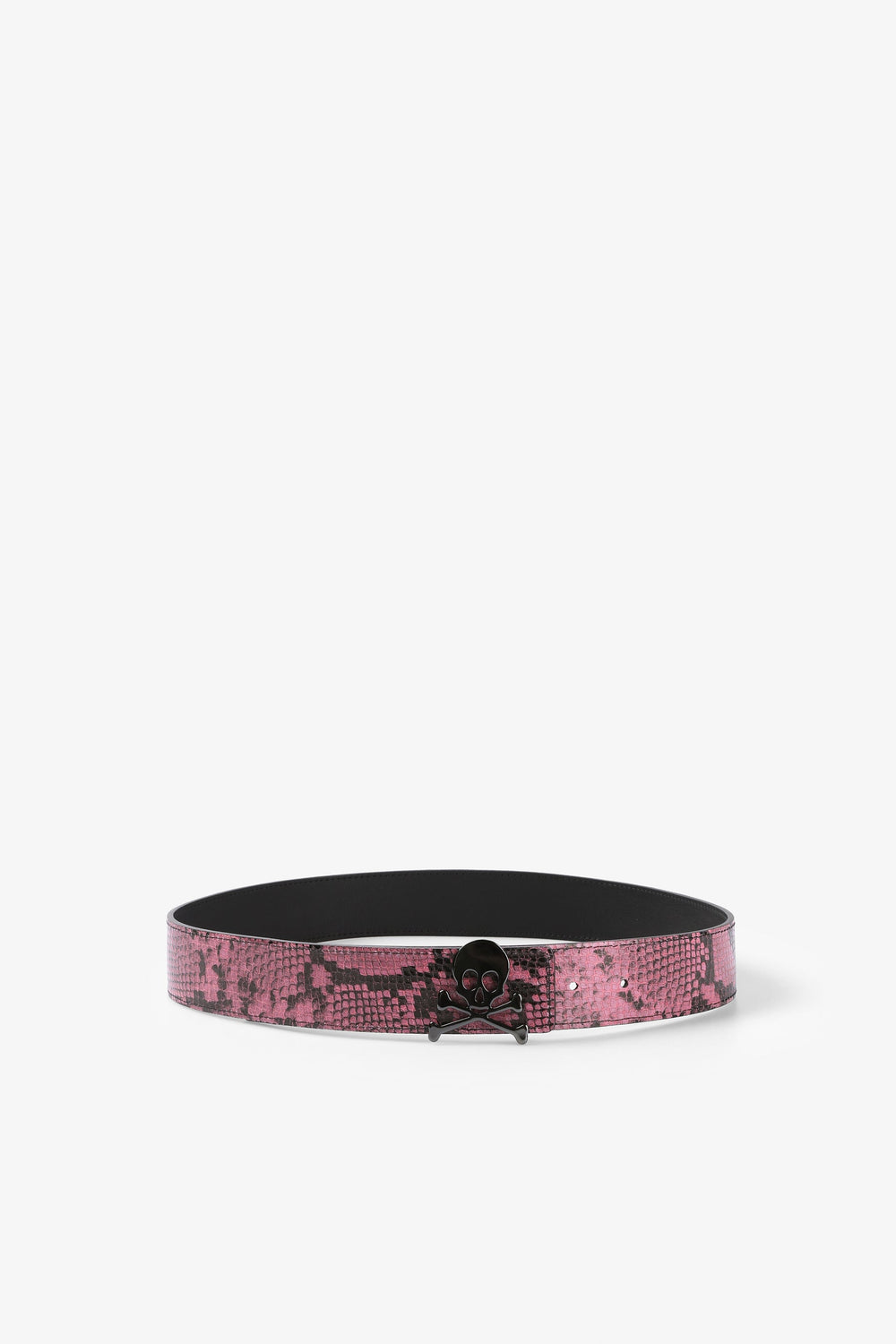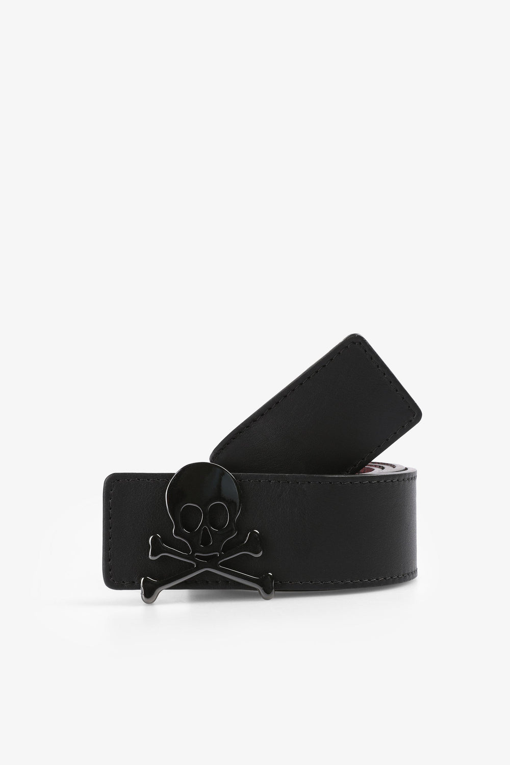 Metallic reversible belt. Made from 100% leather. Snap fastening. Metallic skull on the front.