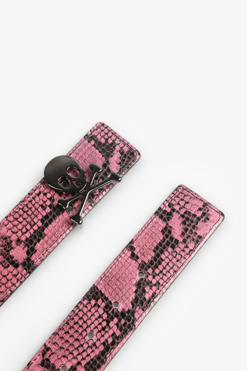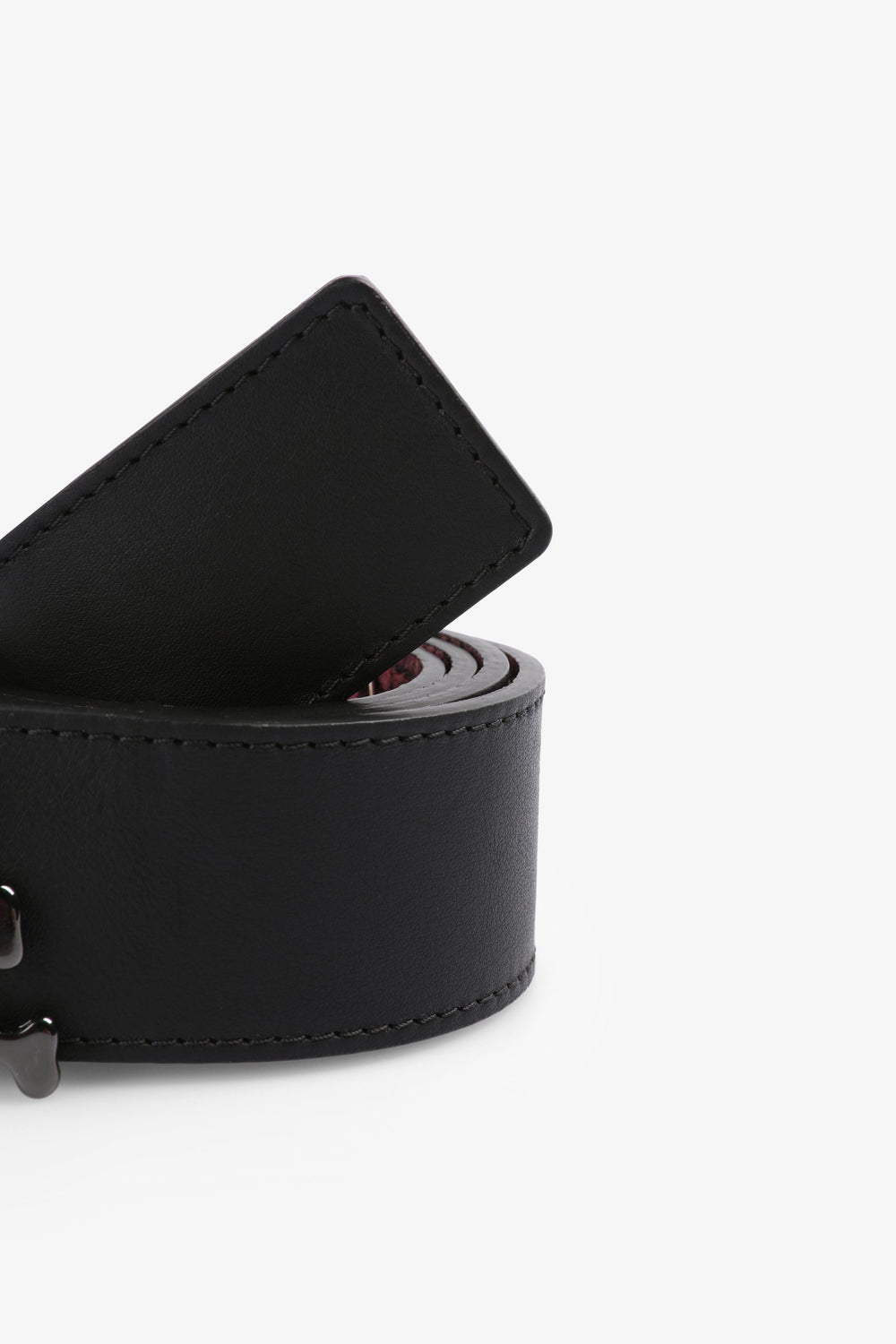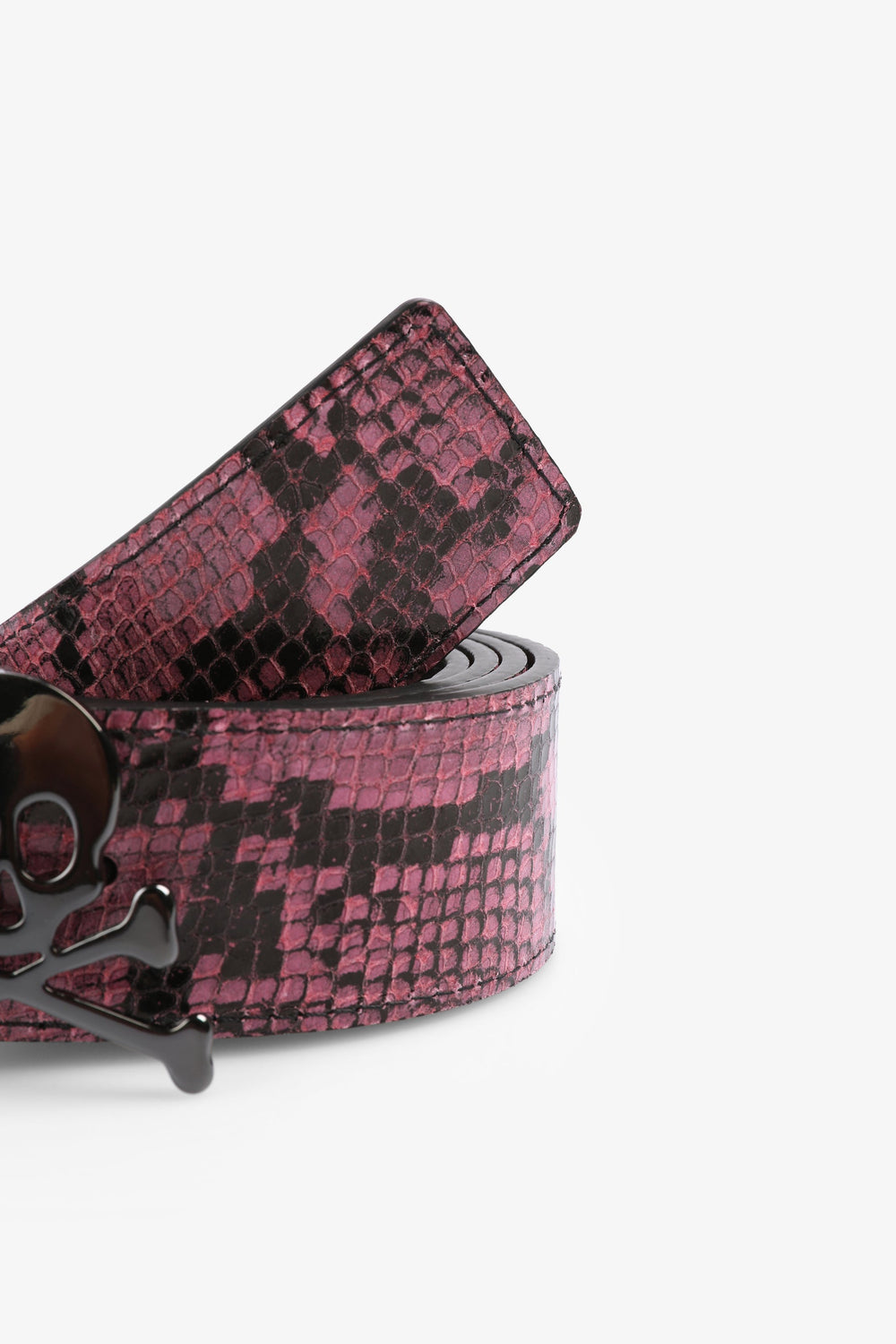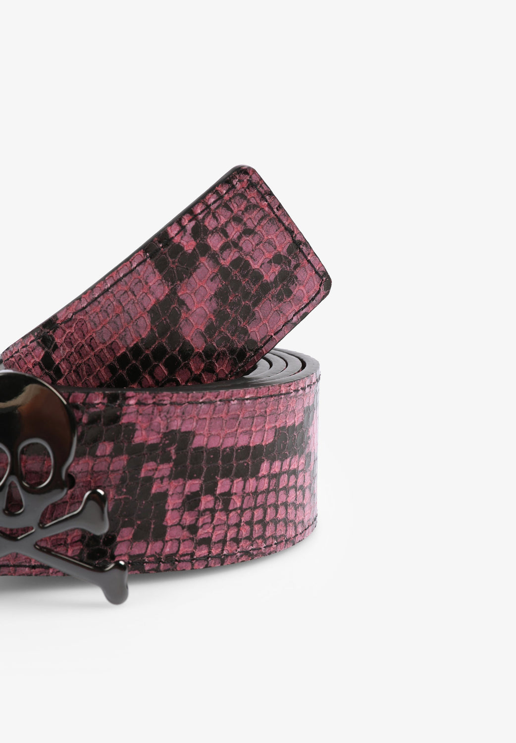 Metallic reversible belt. Made from 100% leather. Snap fastening. Metallic skull on the front.