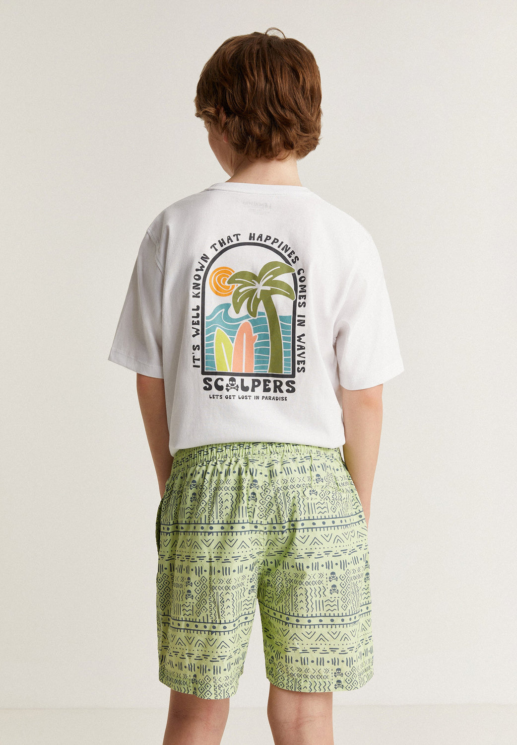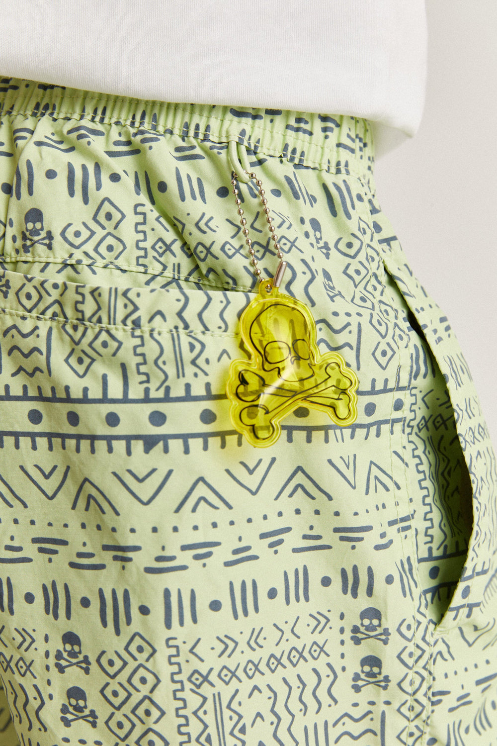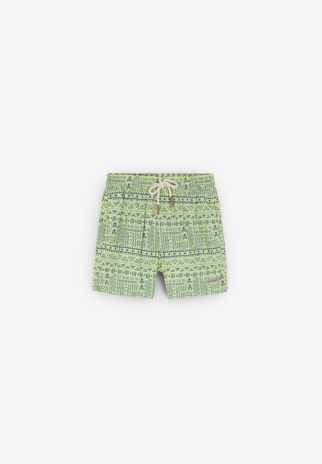 Swimming trunks with an ethnic print and all over skulls detail.