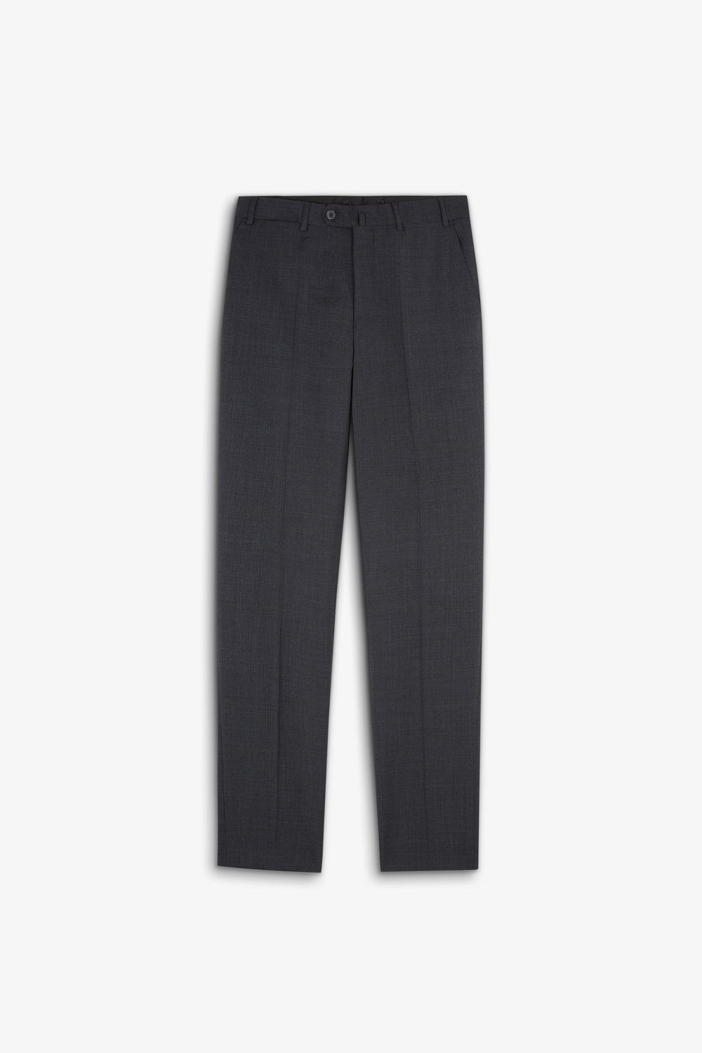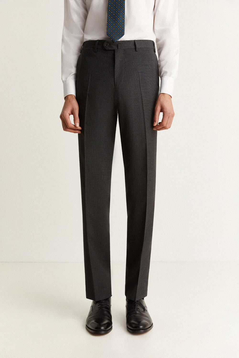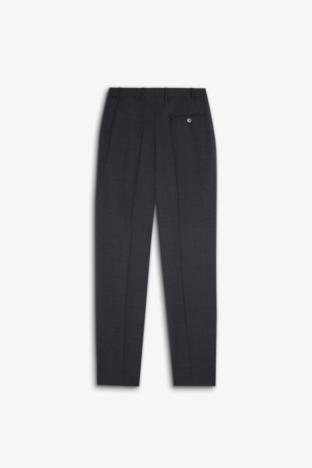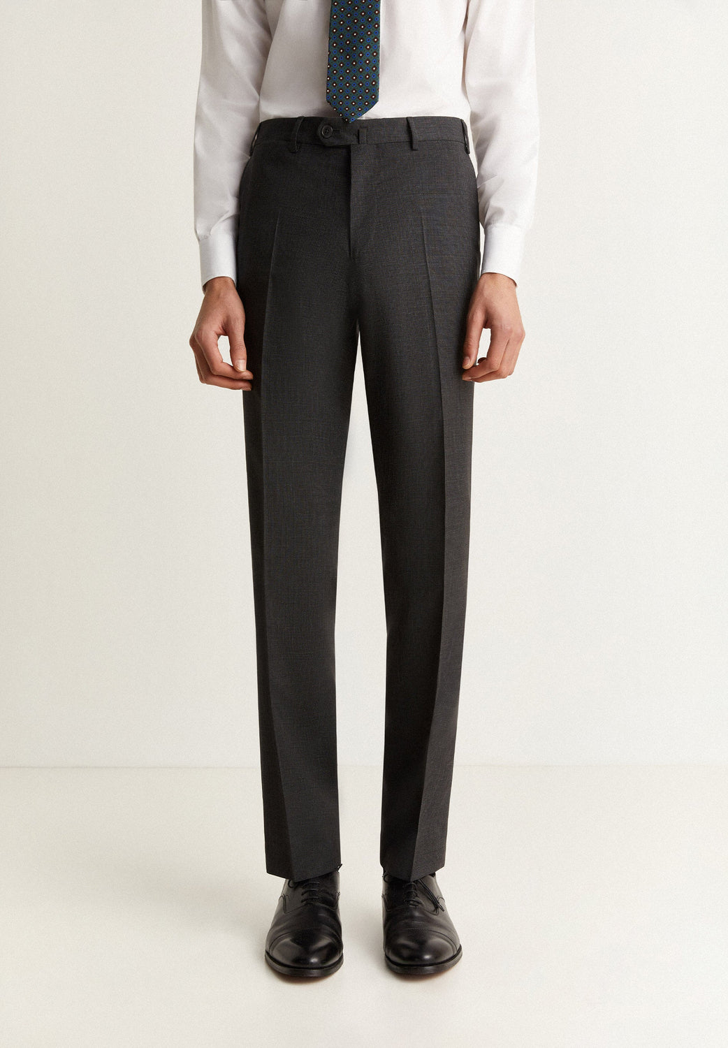 - Straight trousers with an extended button-up fastening at the waist and a zip. Inner button for braces. Side pockets