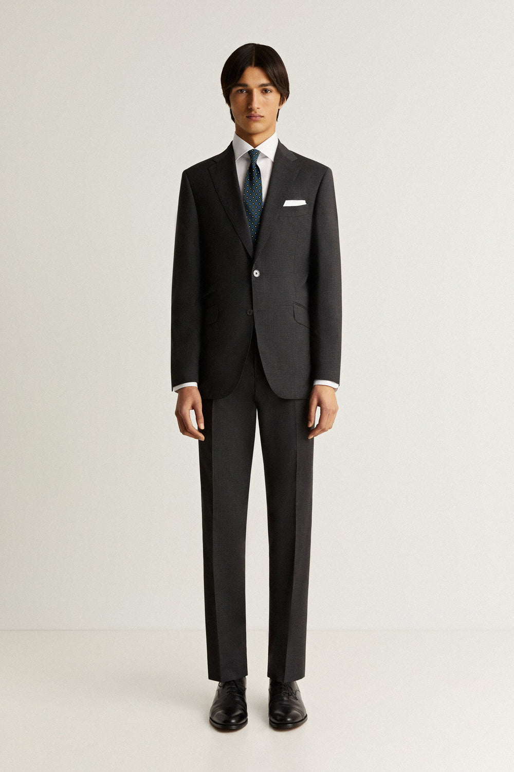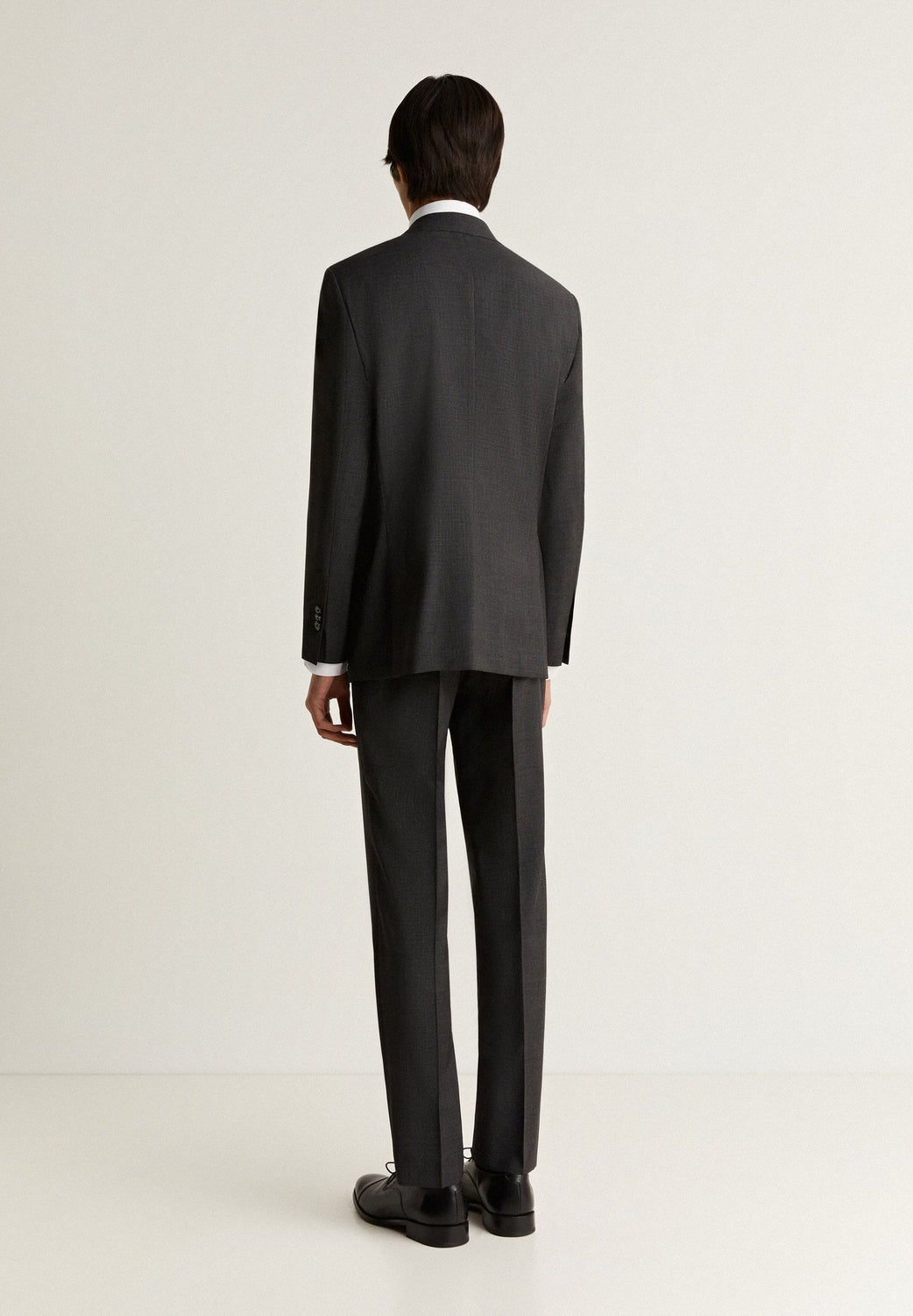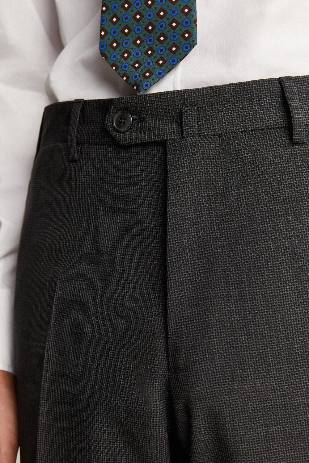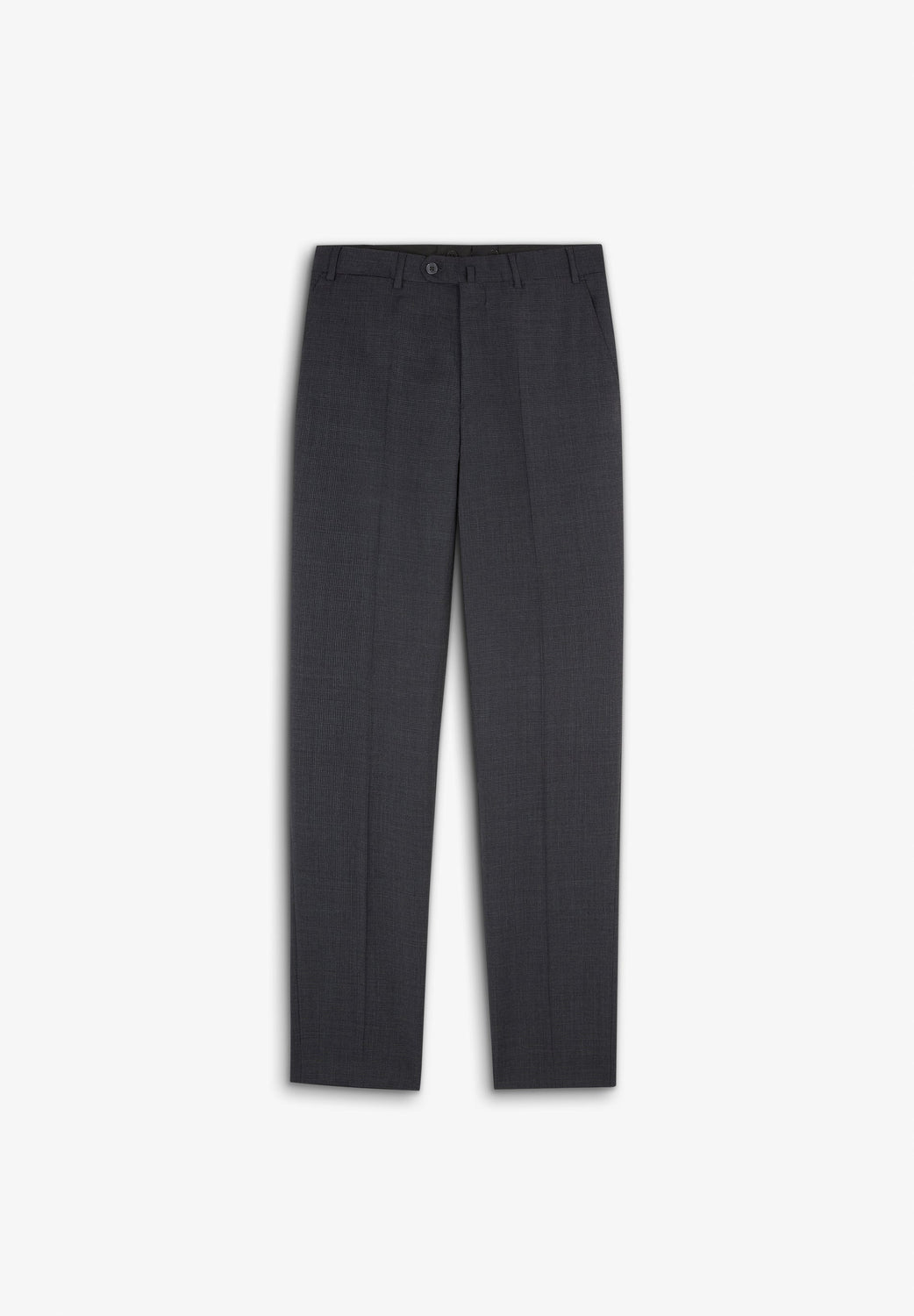 - Straight trousers with an extended button-up fastening at the waist and a zip. Inner button for braces. Side pockets