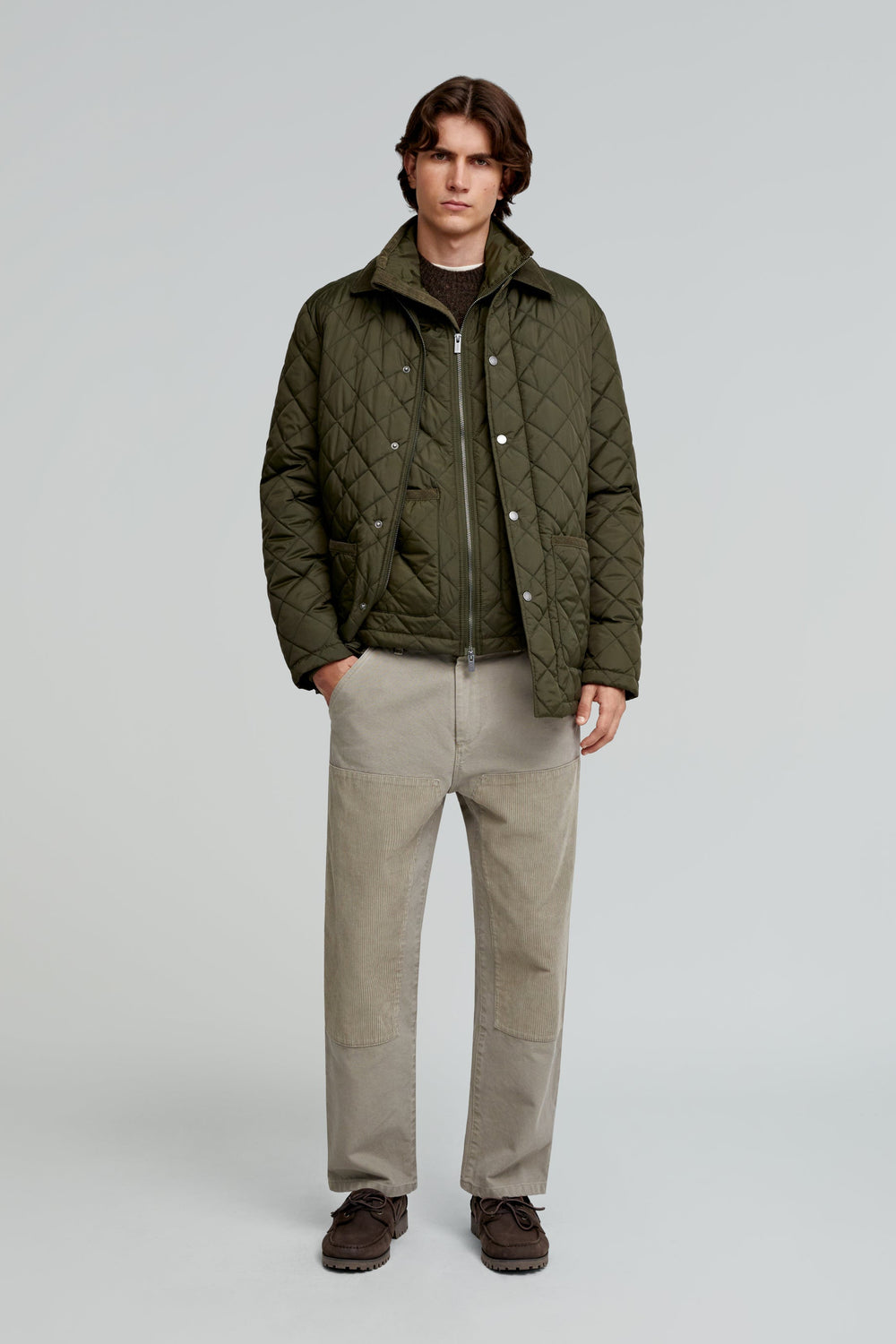 Quilted jacket made of technical fabric. Regular fit, corduroy collar and zip and snap button fastenings. Long sleeves with elasticated cuffs and front and inner pockets.