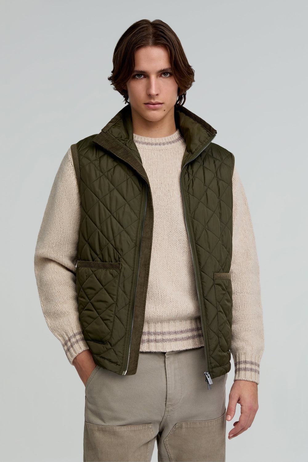 Premium puffer gilet made of recycled fabric. Regular fit, high collar and double slider zip fastening. Sleeveless with front pockets.