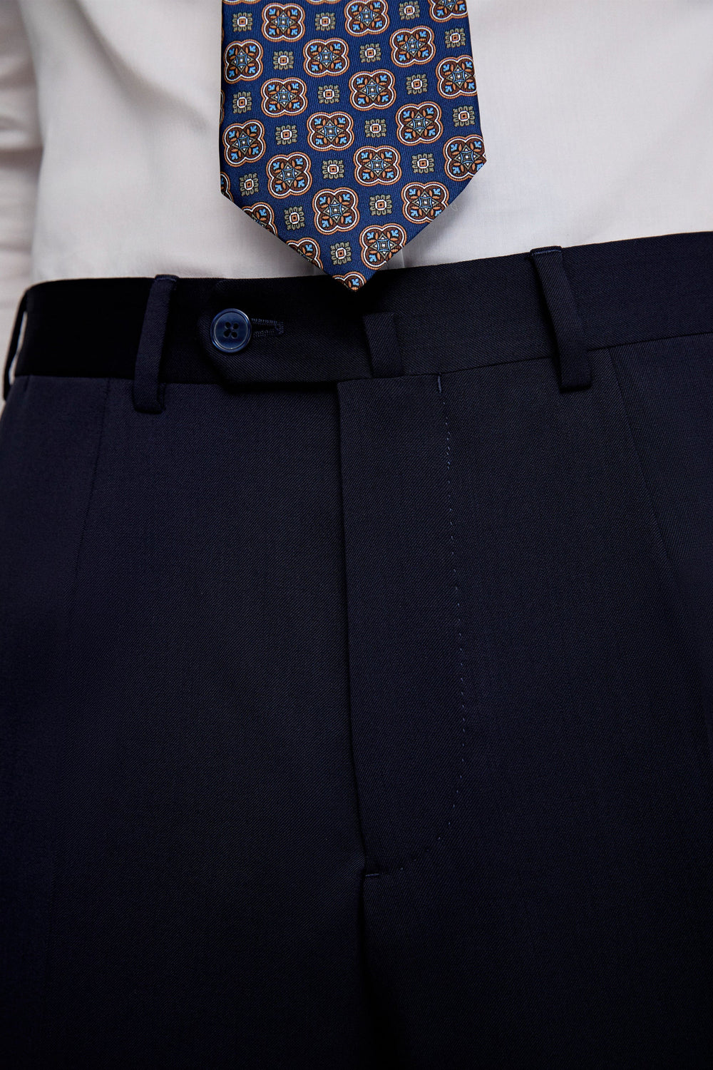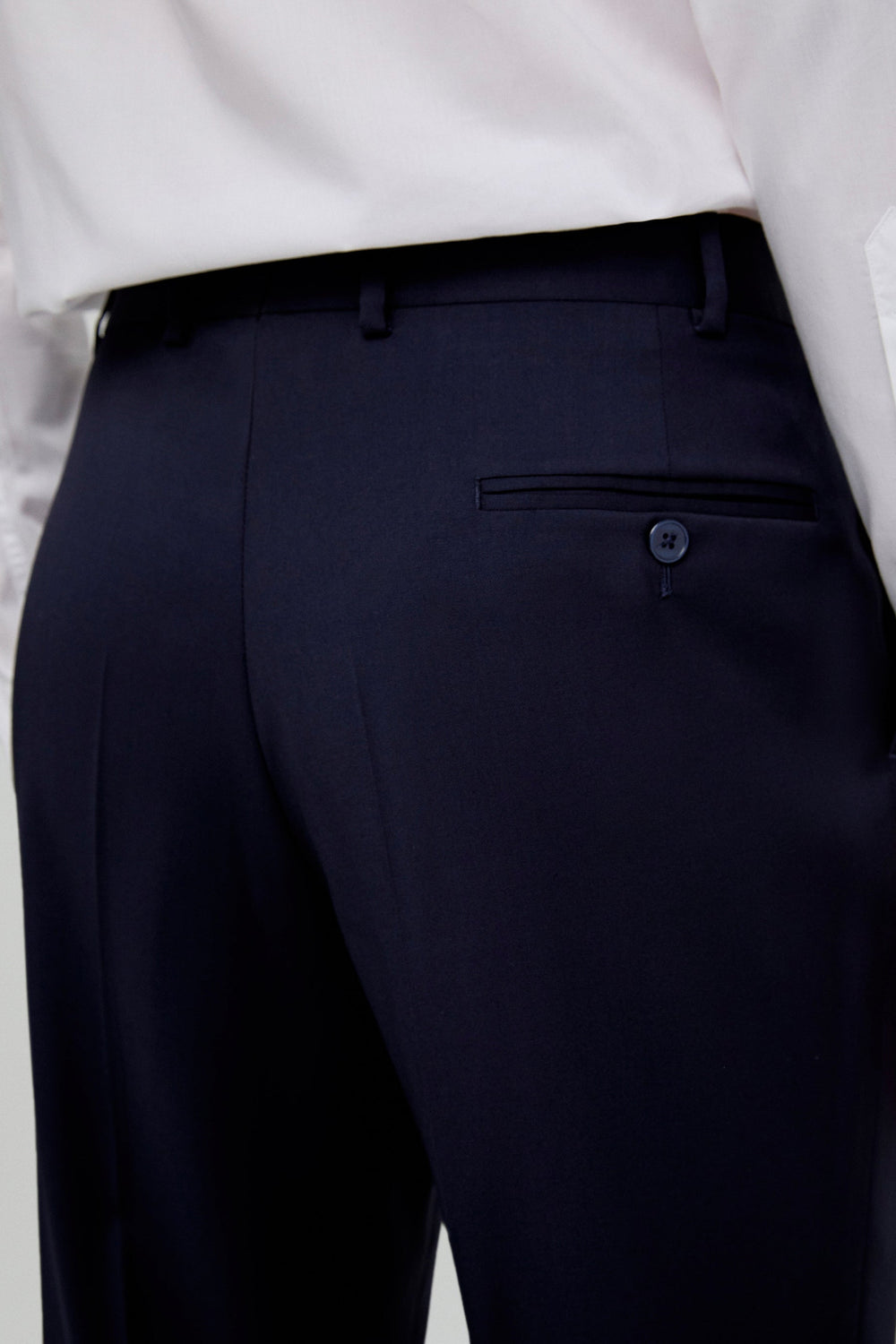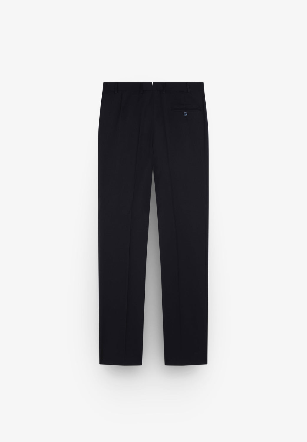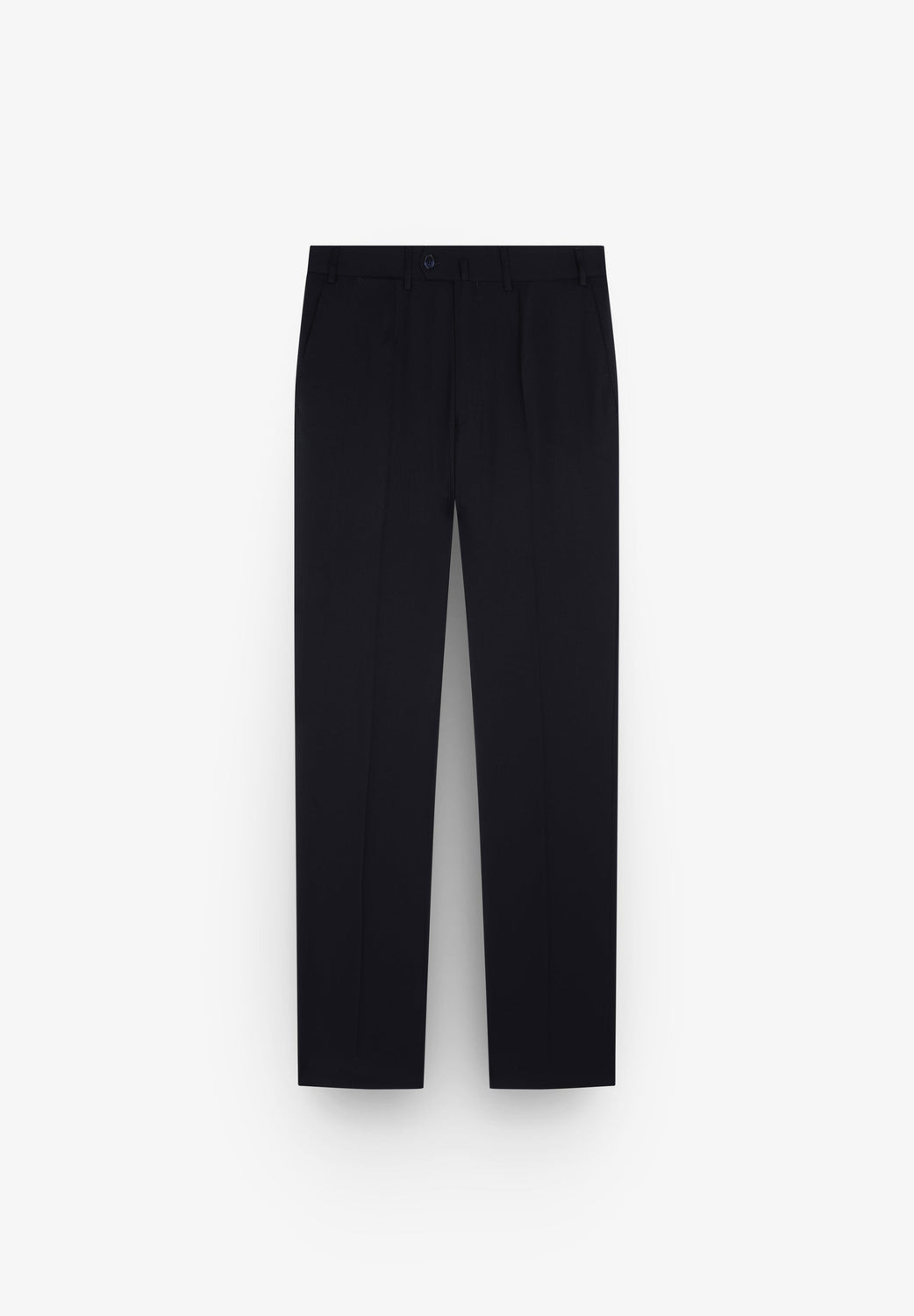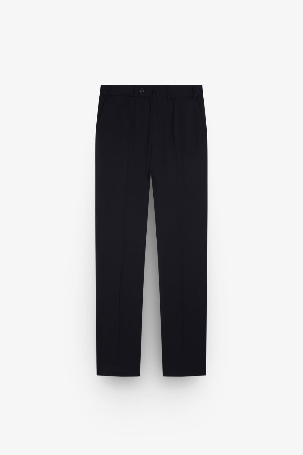 - Pantalón recto con cierre de botón prolongado en cintura y cremallera. Trabillas en cintura y bajo sencillo