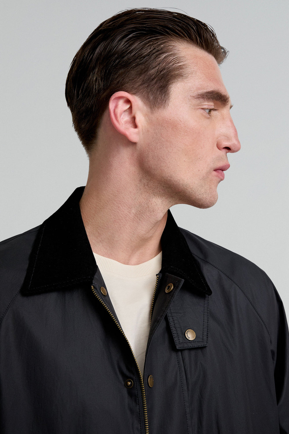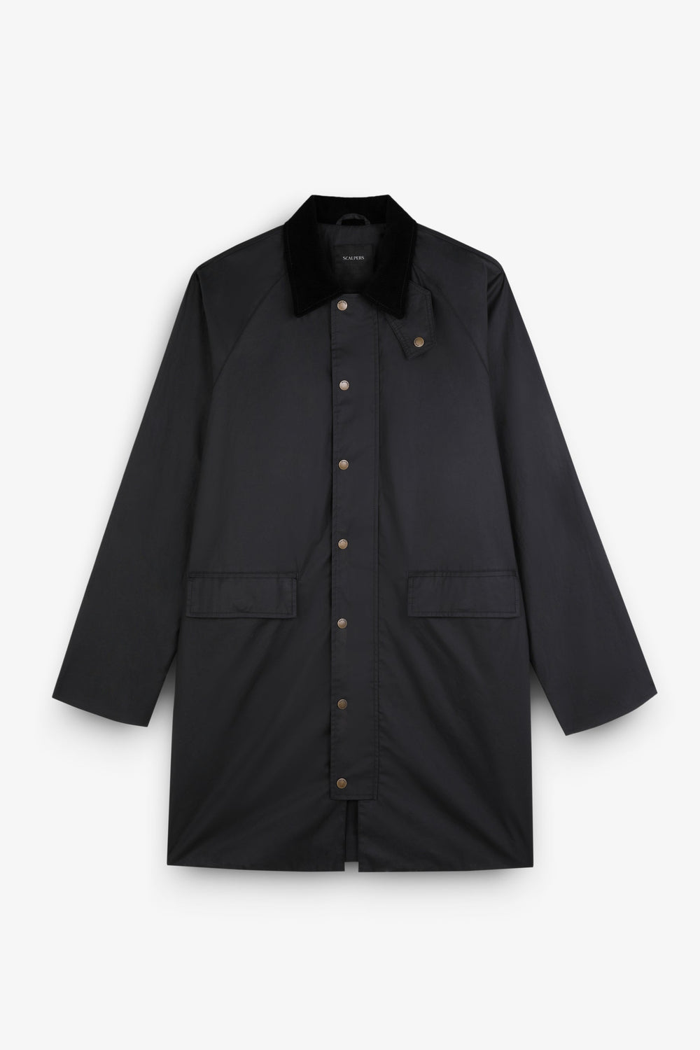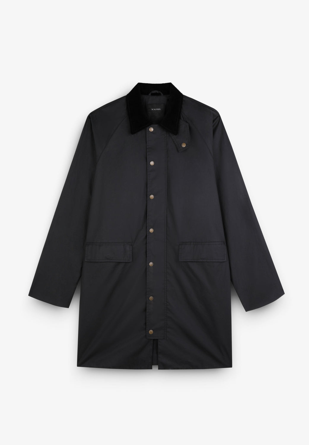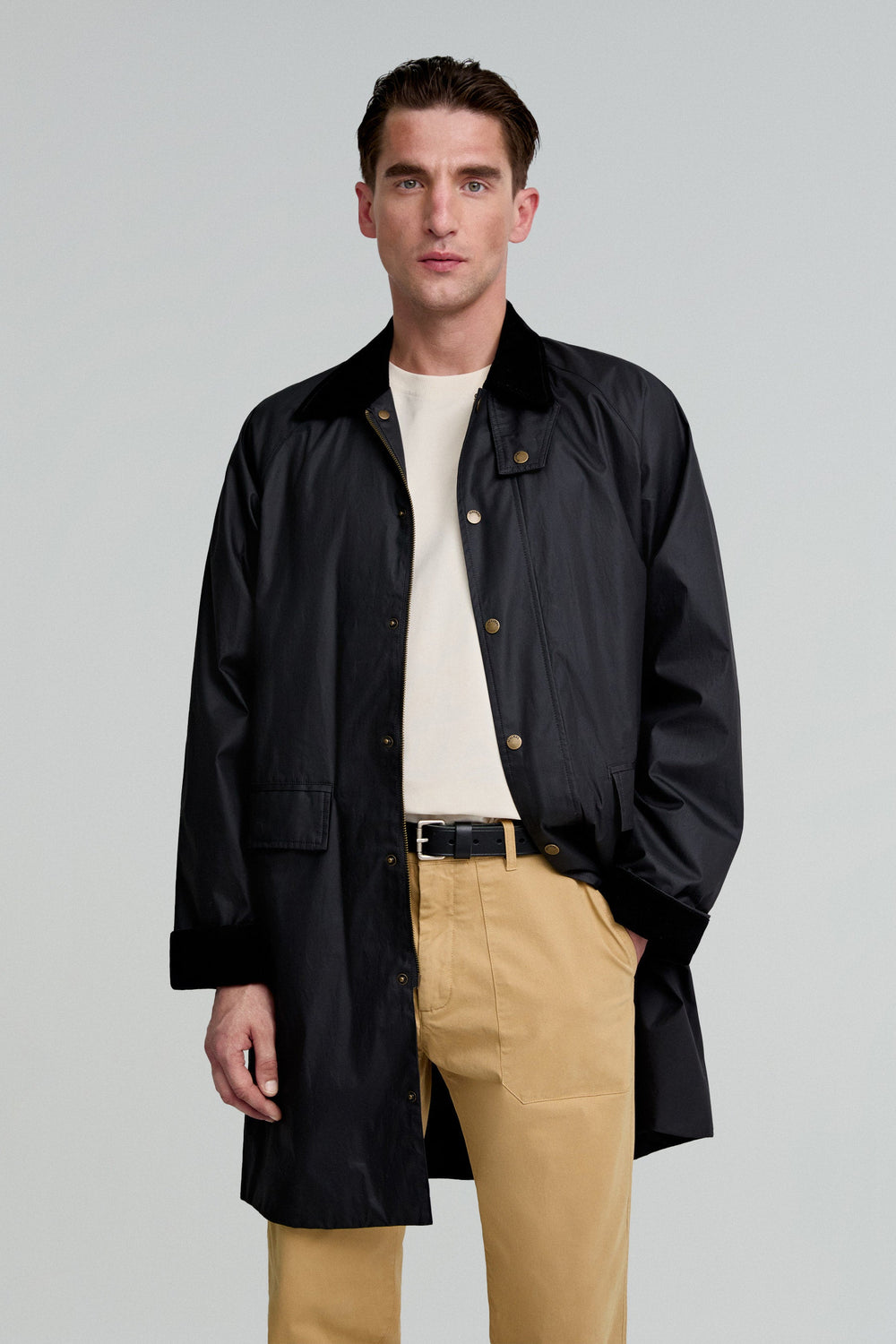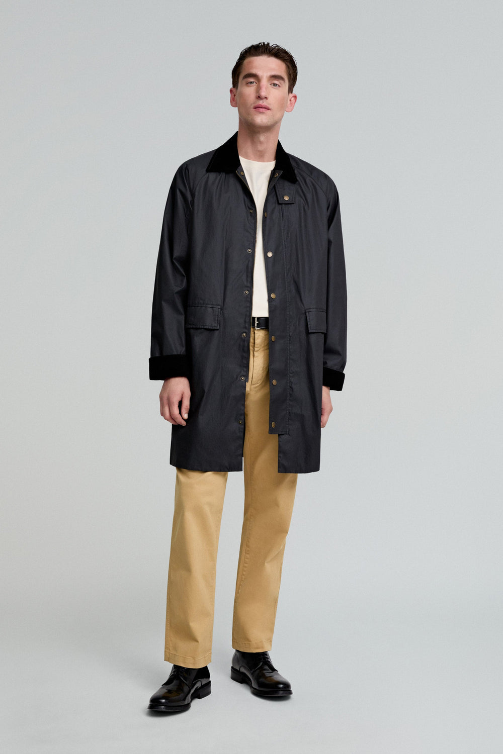 Waxed parka made of water-repellent technical fabric. Regular fit, corduroy collar and snap-button and zip fastening. Long sleeves and back vents with snap buttons. Flap pockets and inner zipped pocket. Snap button fastening at the neck.