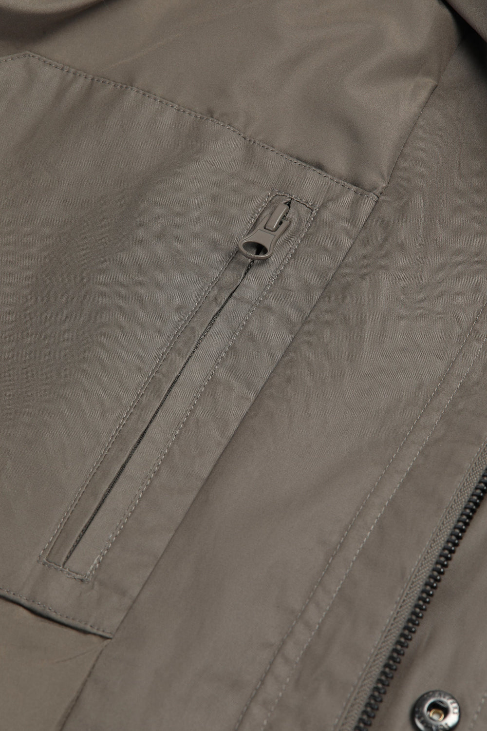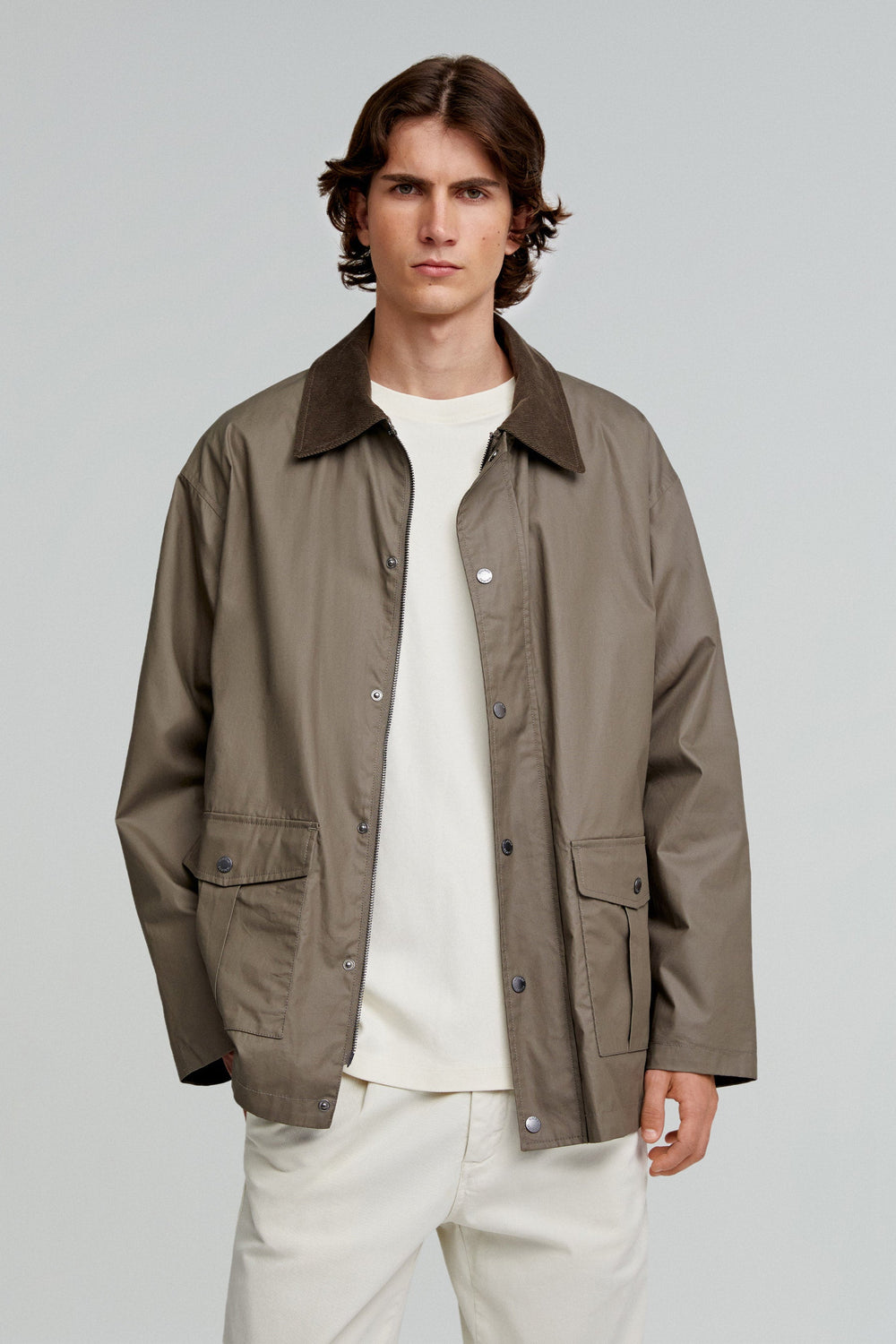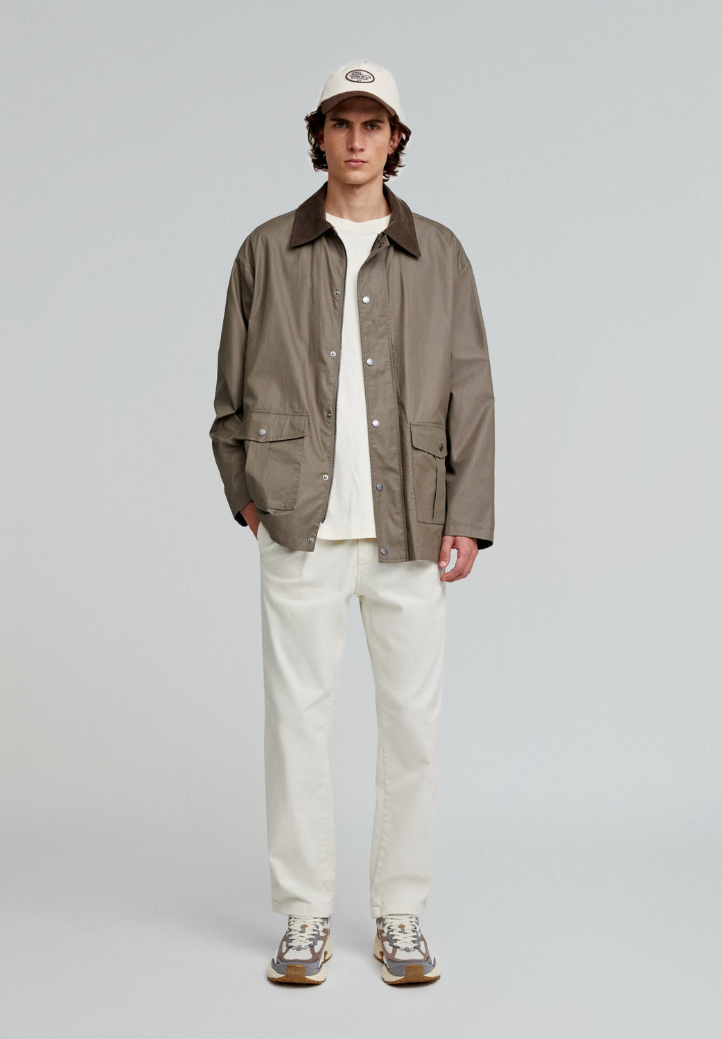 Waxed jacket made of 100% BCI cotton. Regular fit, corduroy collar and zip fastening with snap-button placket. Long sleeves and patch pockets with snap buttons.