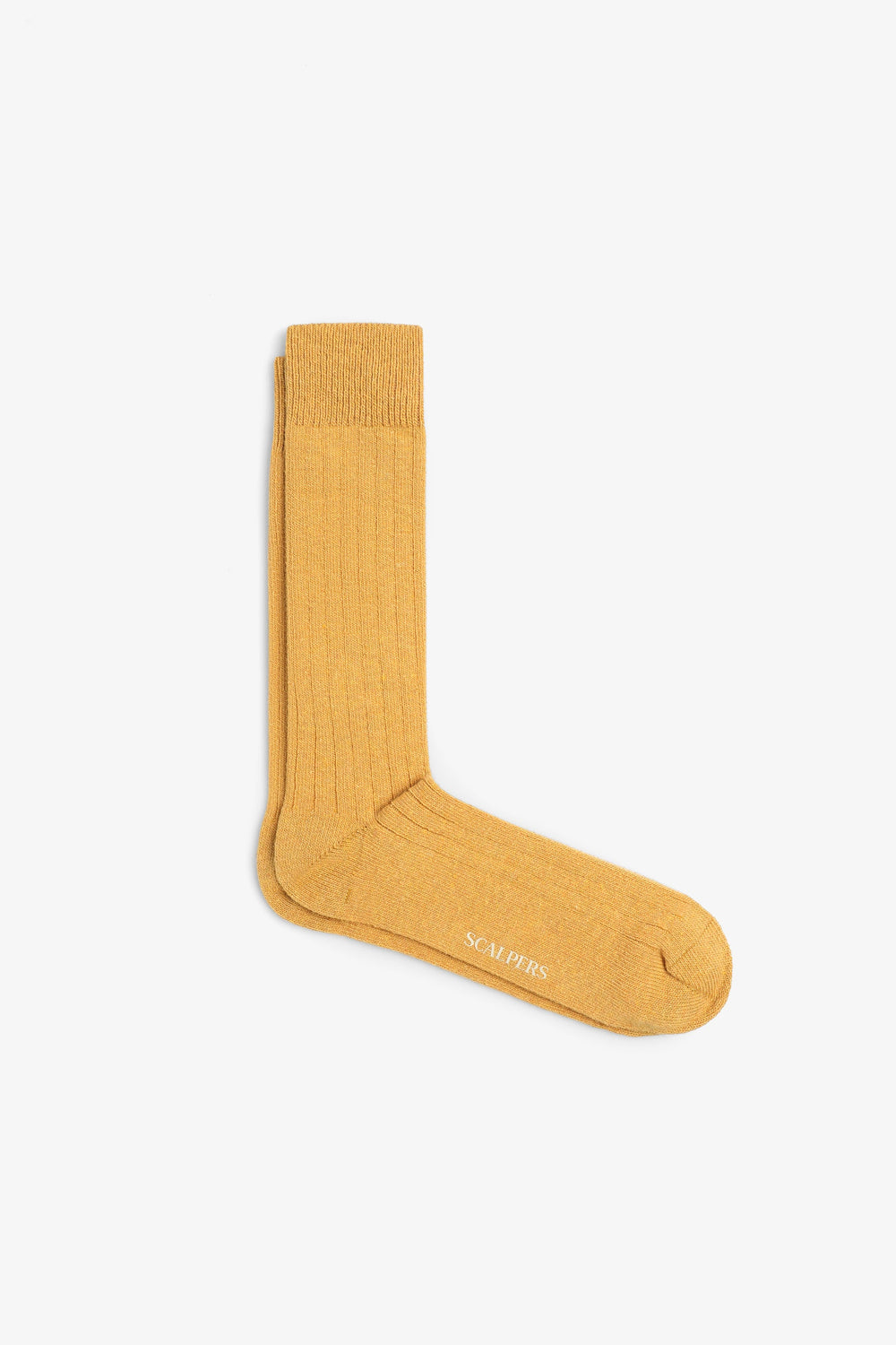Calcetines confeccionados con tejido en mezcla de Cashmere y Lana. Logitud media. Ajuste cómodo. No aprieta el tobillo. Canalé fino. Detalle de logo en planta.
