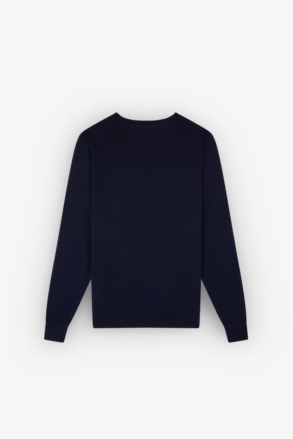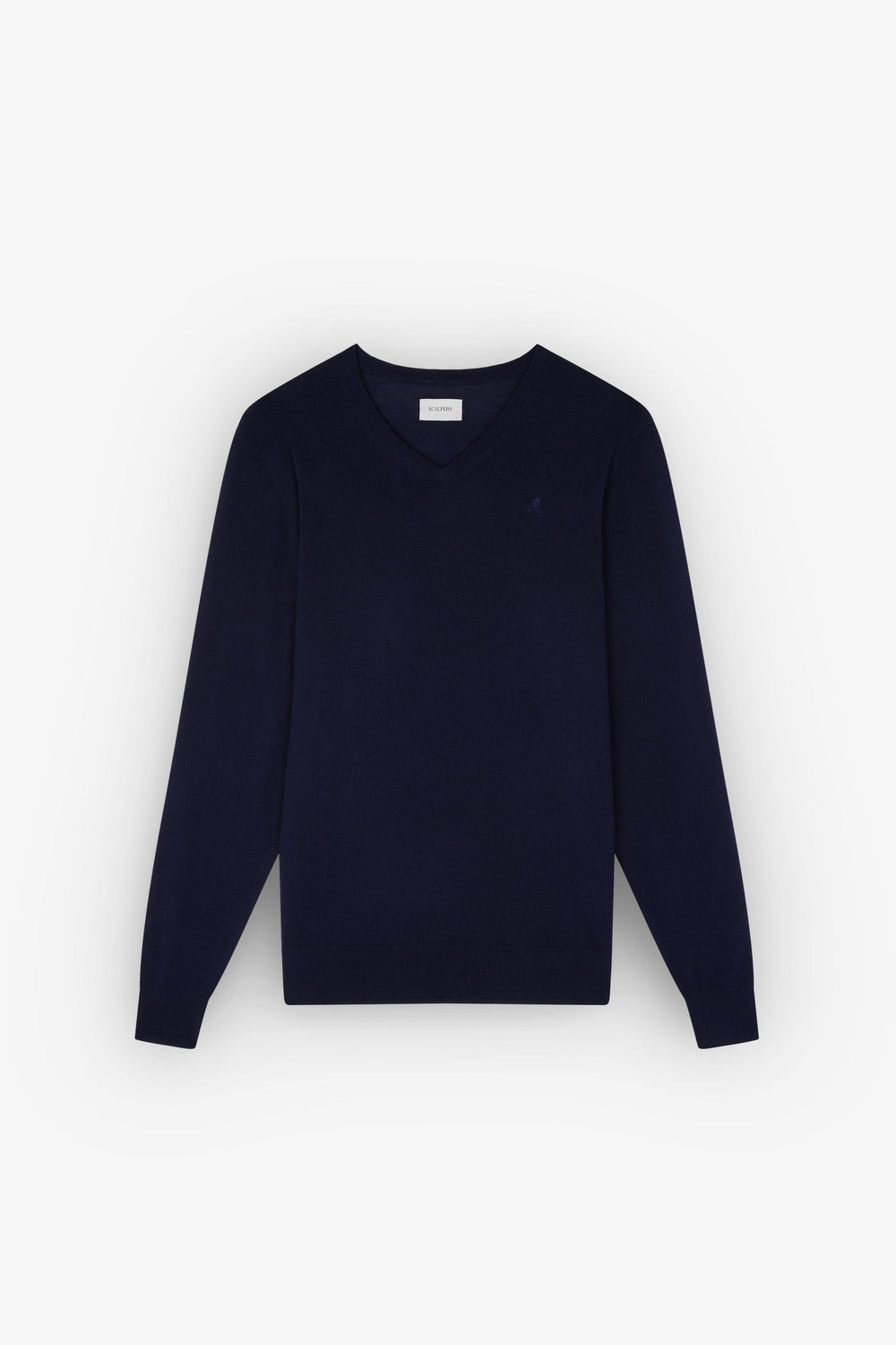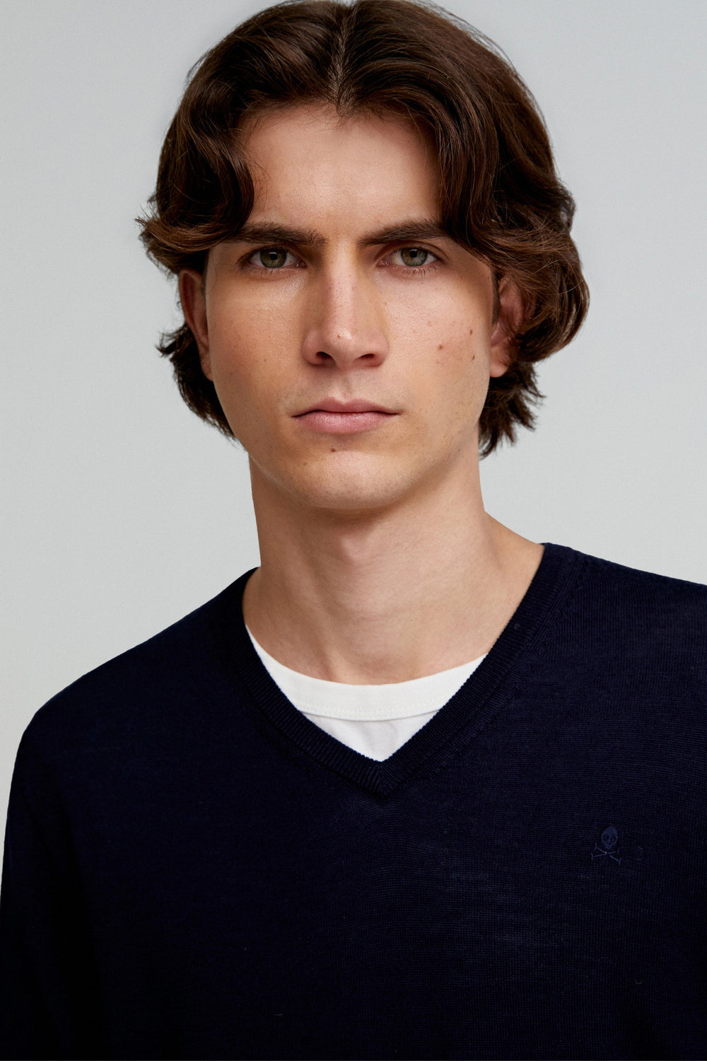 Sweater made of 100% merino wool. Regular fit, V-neck and long sleeves. Matching embroidered skull.