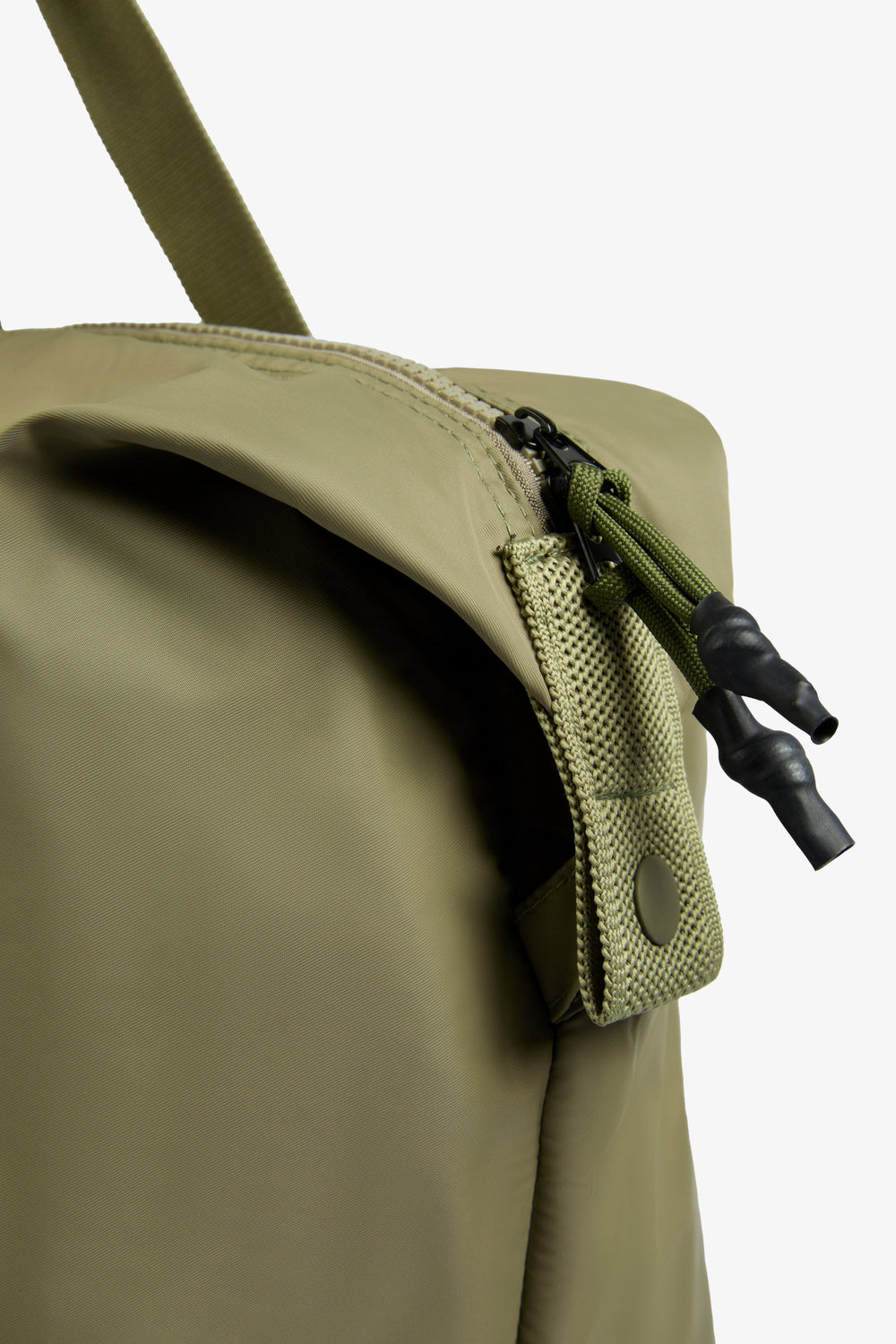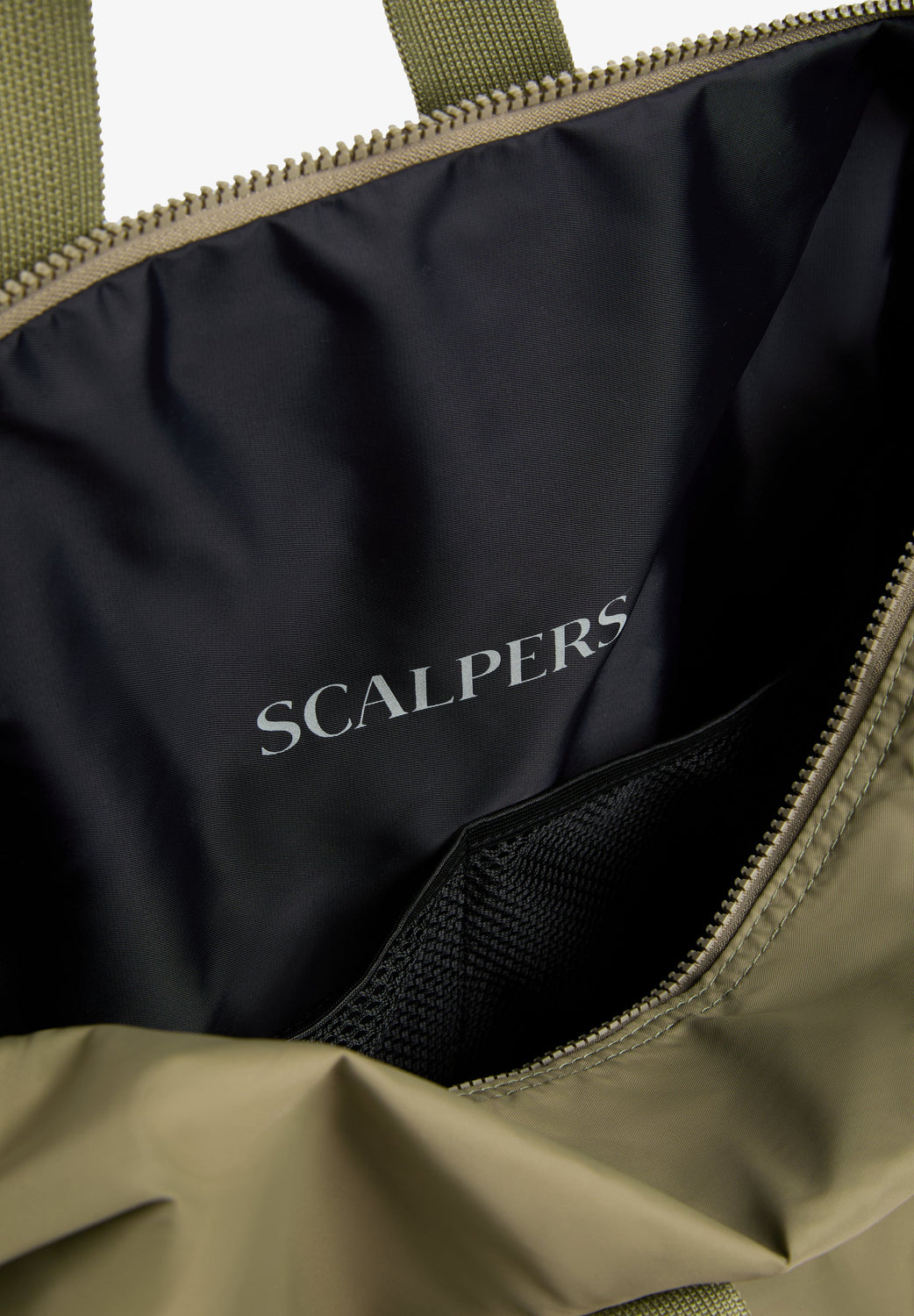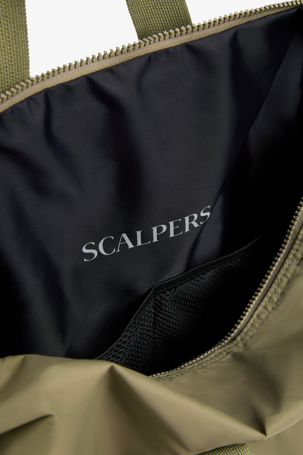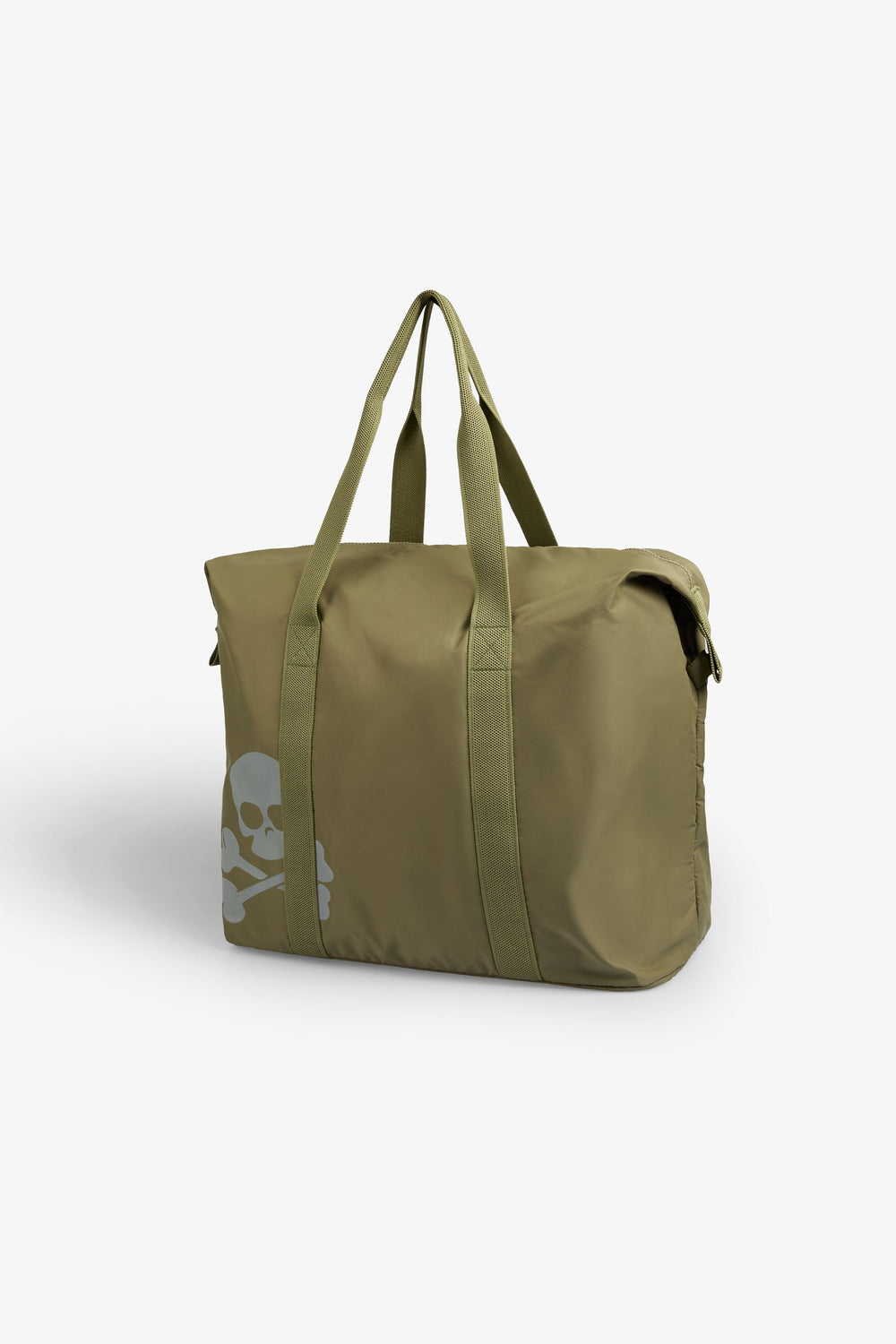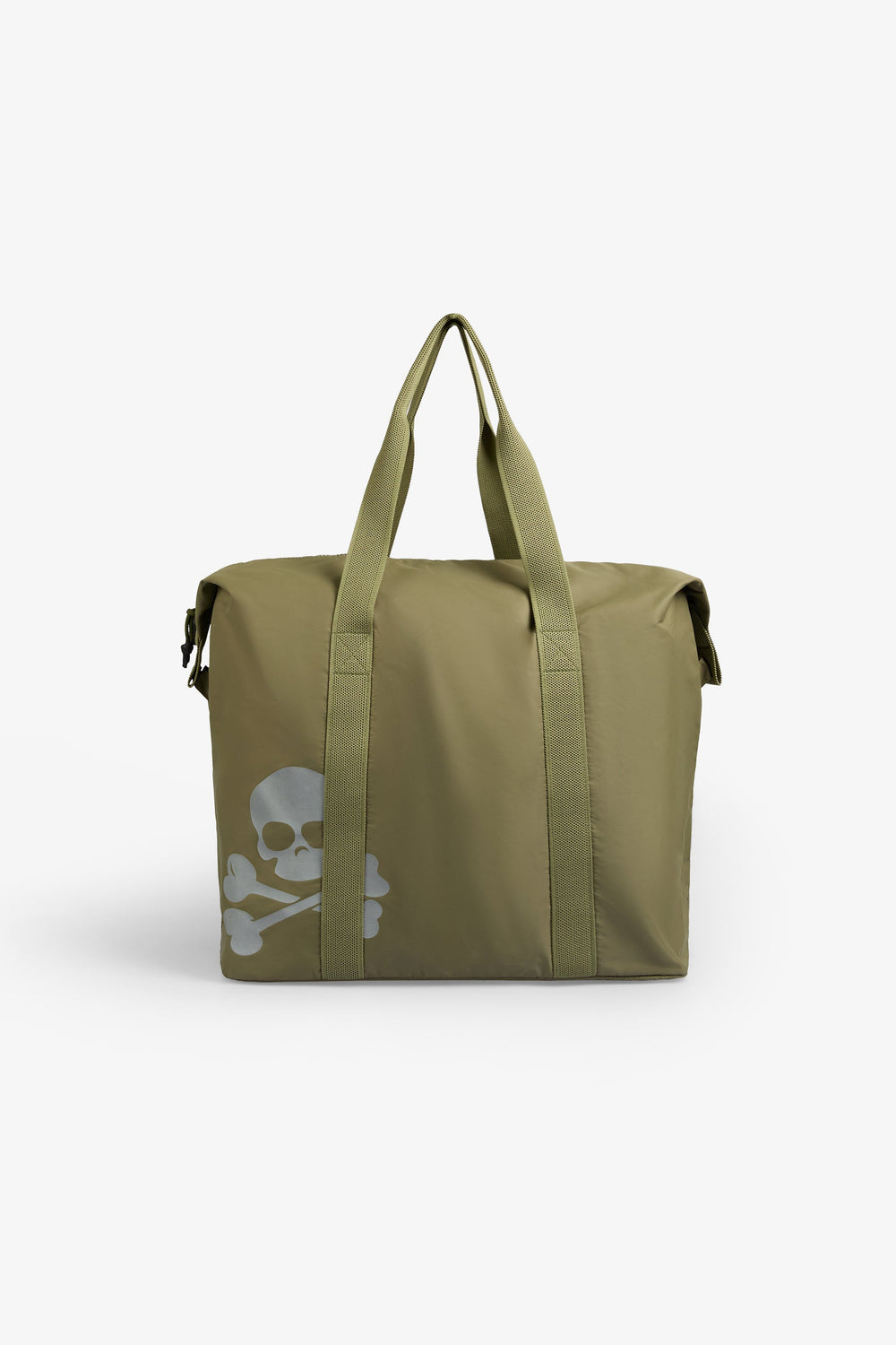 Travel bag. Made of recycled materials. Zip fastening. Side adjusters. Top handles. Multiple inner pockets. Rubber patch detail with skull on the front