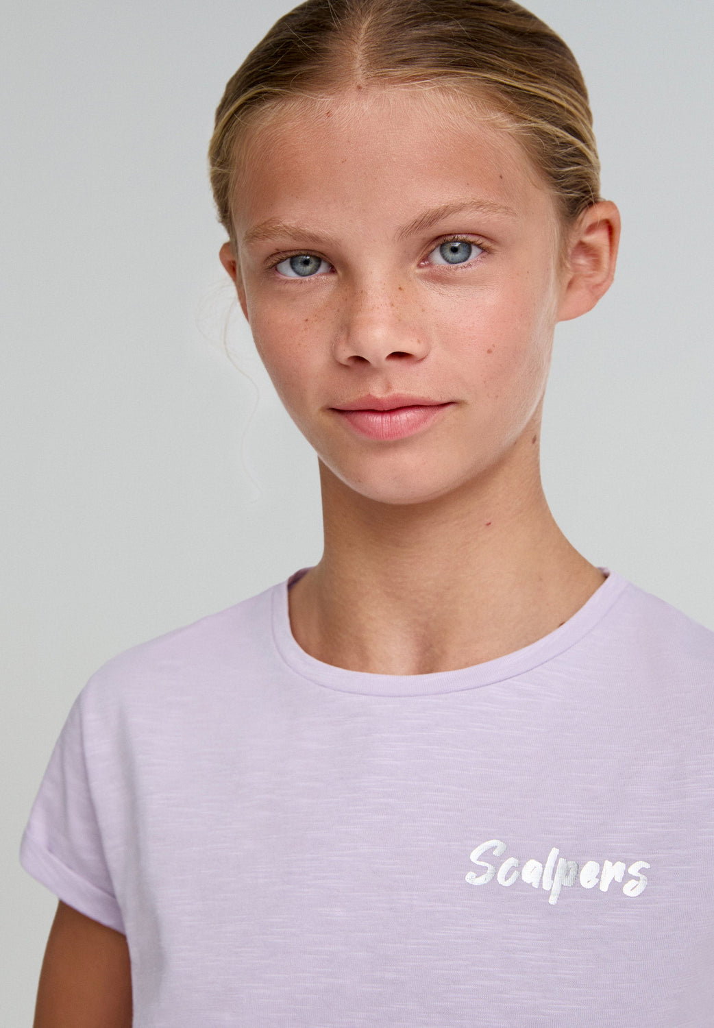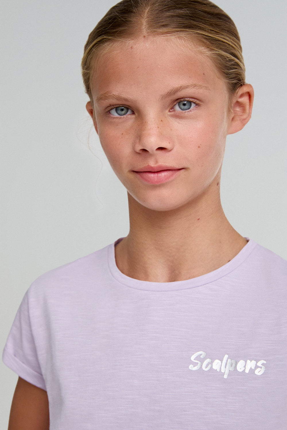 T-shirt in slub knit fabric with iridescent back print. Made of 100% BCI cotton. Regular fit. Round collar. Short sleeve with turn-up. Contrast front logo detail.