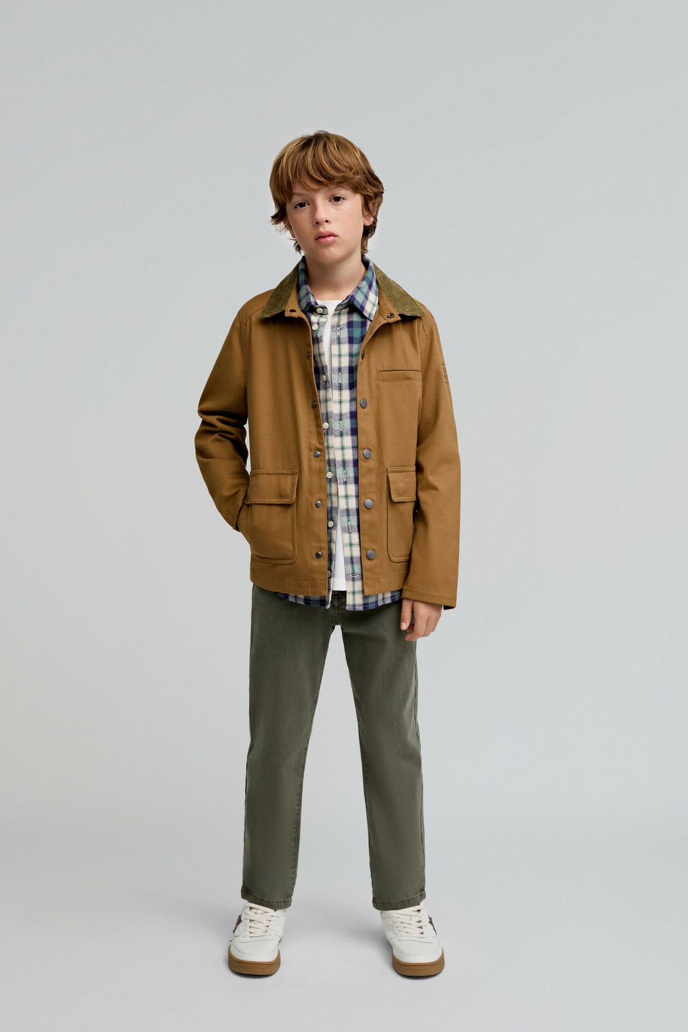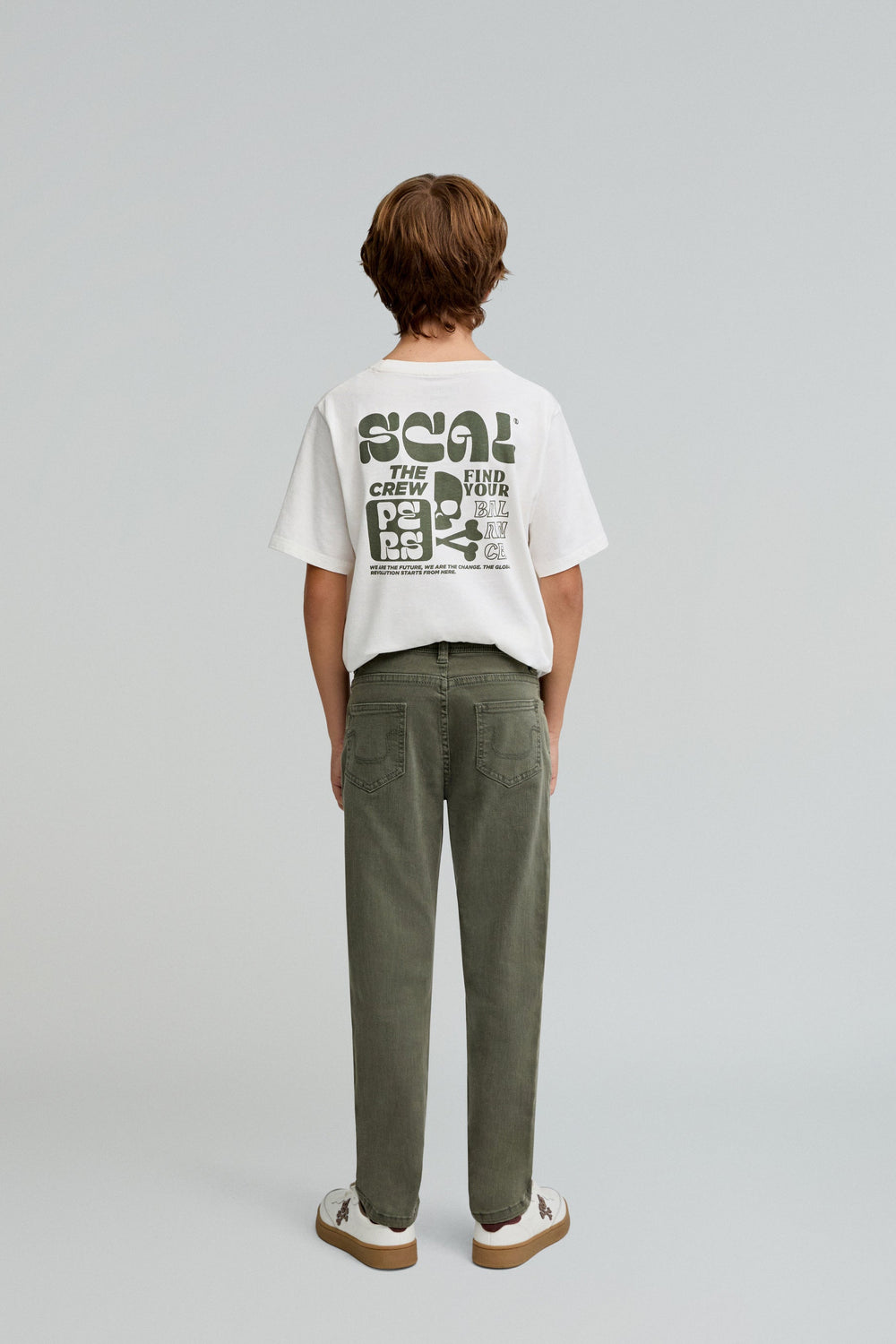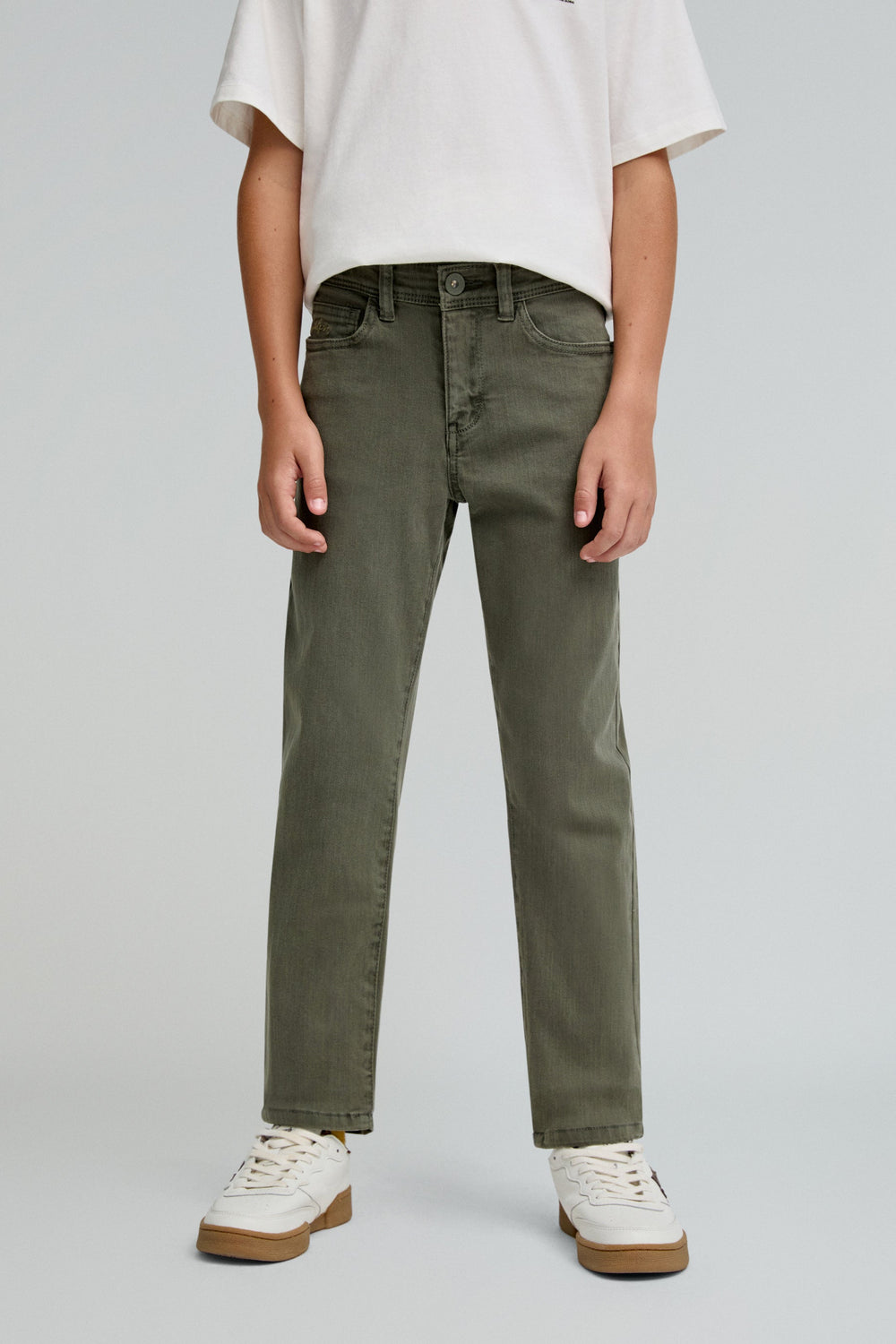 Five-pocket trousers made of slightly stretchy fabric. Button and zip fastening. Regular fit.