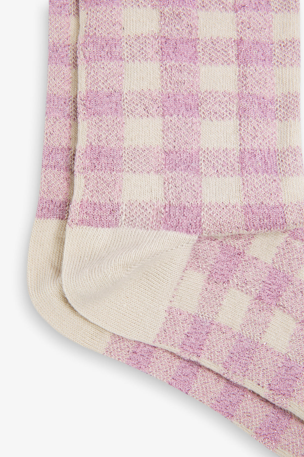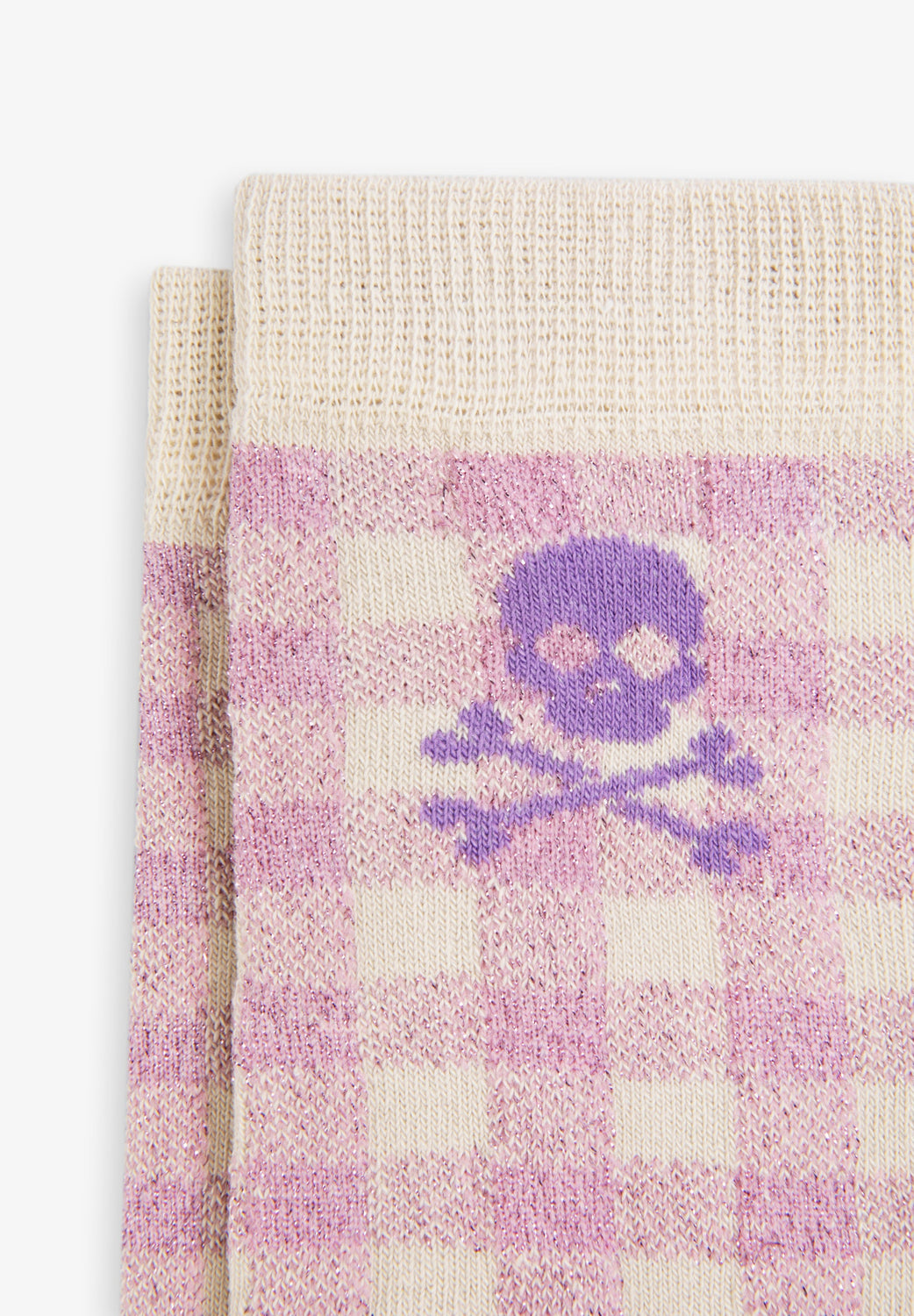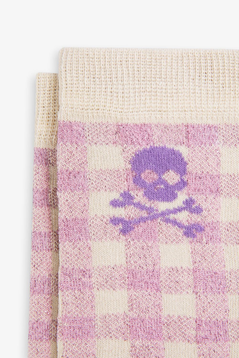 Gingham socks made from slightly stretchy cotton. Mid-calf with a contrast skull.