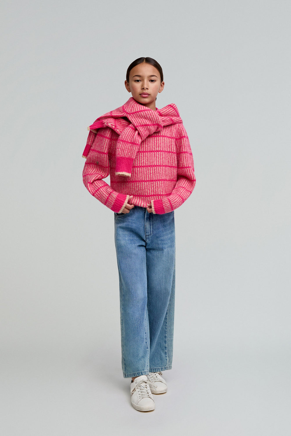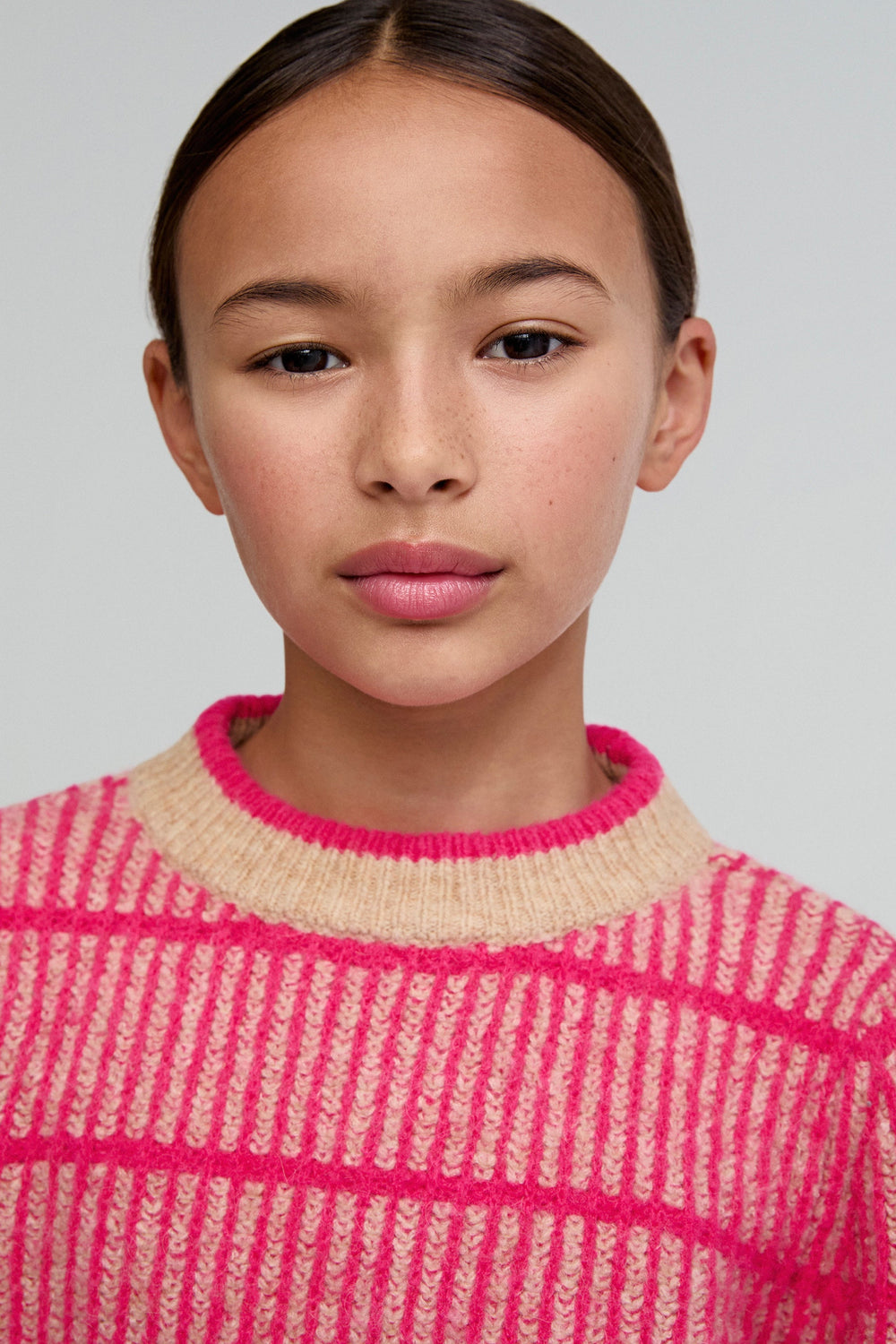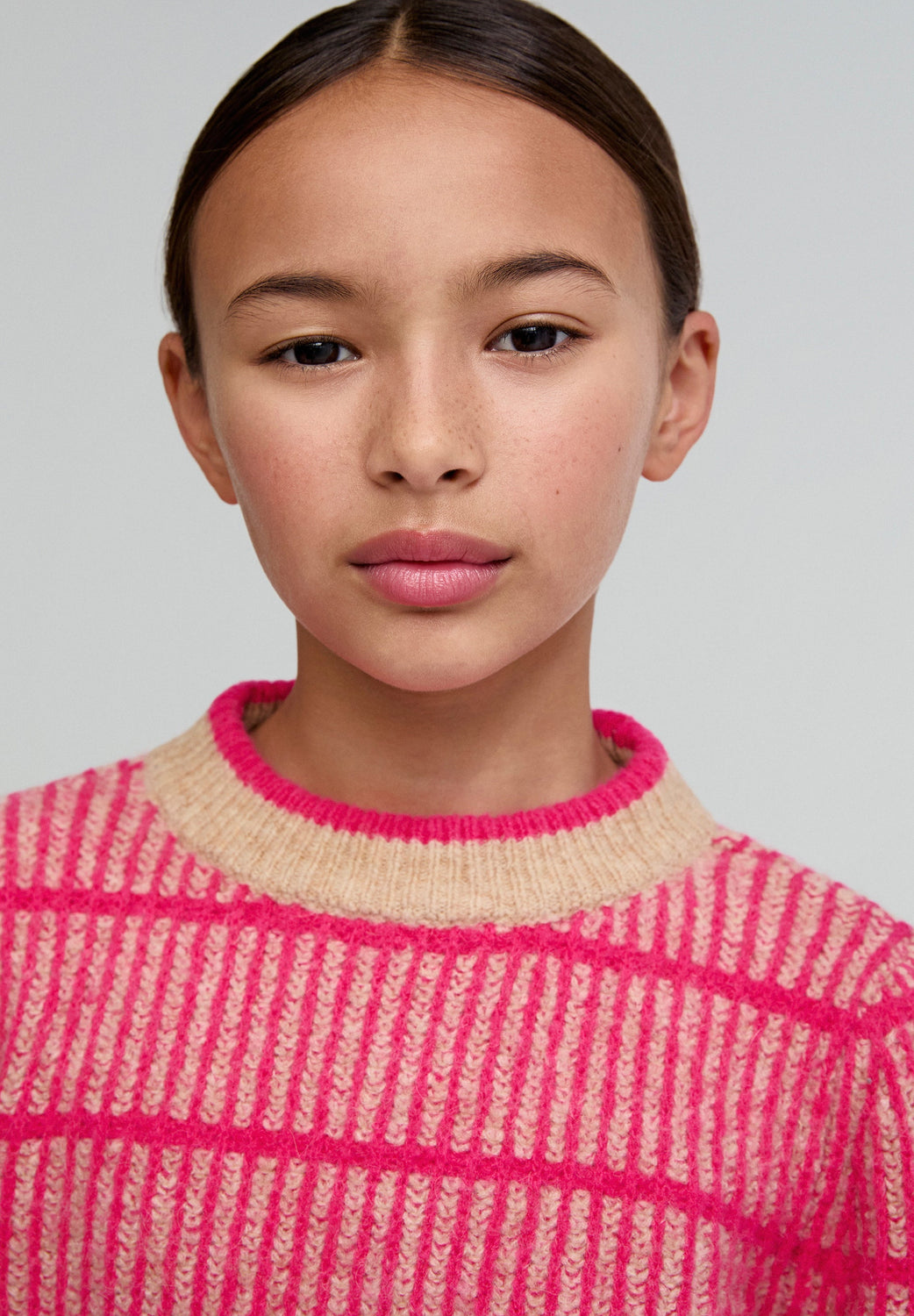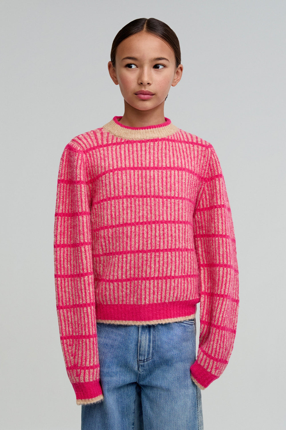 Knit vest with two-tone stripe motifs. Made of a wool blend. Round collar. Regular fit. Long sleeves with ribbed cuffs.