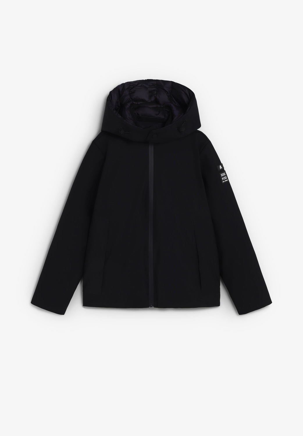 Jacket with detachable hood with button fastening. Long sleeves. Double slider thermo-sealed zip. Two front pockets. Rubber logo patch detail and skull on the sleeve.