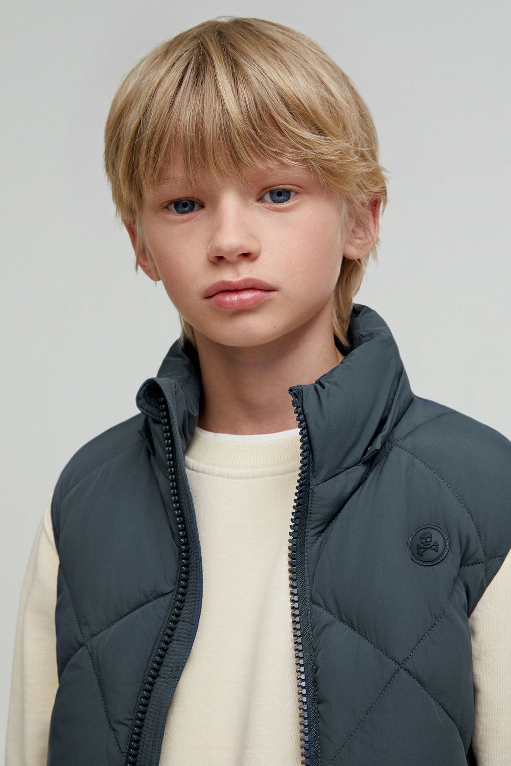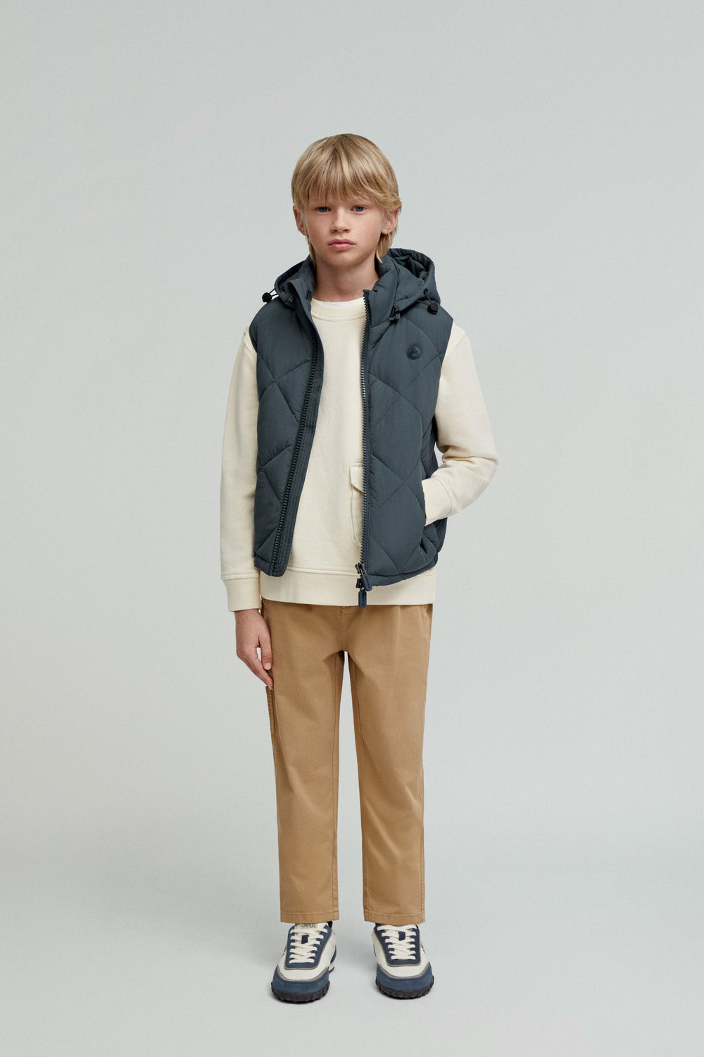 Quilted gilet with detachable hood and adjusters. Made of technical fabric. Regular fit. High collar with chin guard and hood. Double slider zip fastening. Sleeveless design. Side zip pocket and an inner pocket. Matching rubber patch detail on the chest.
