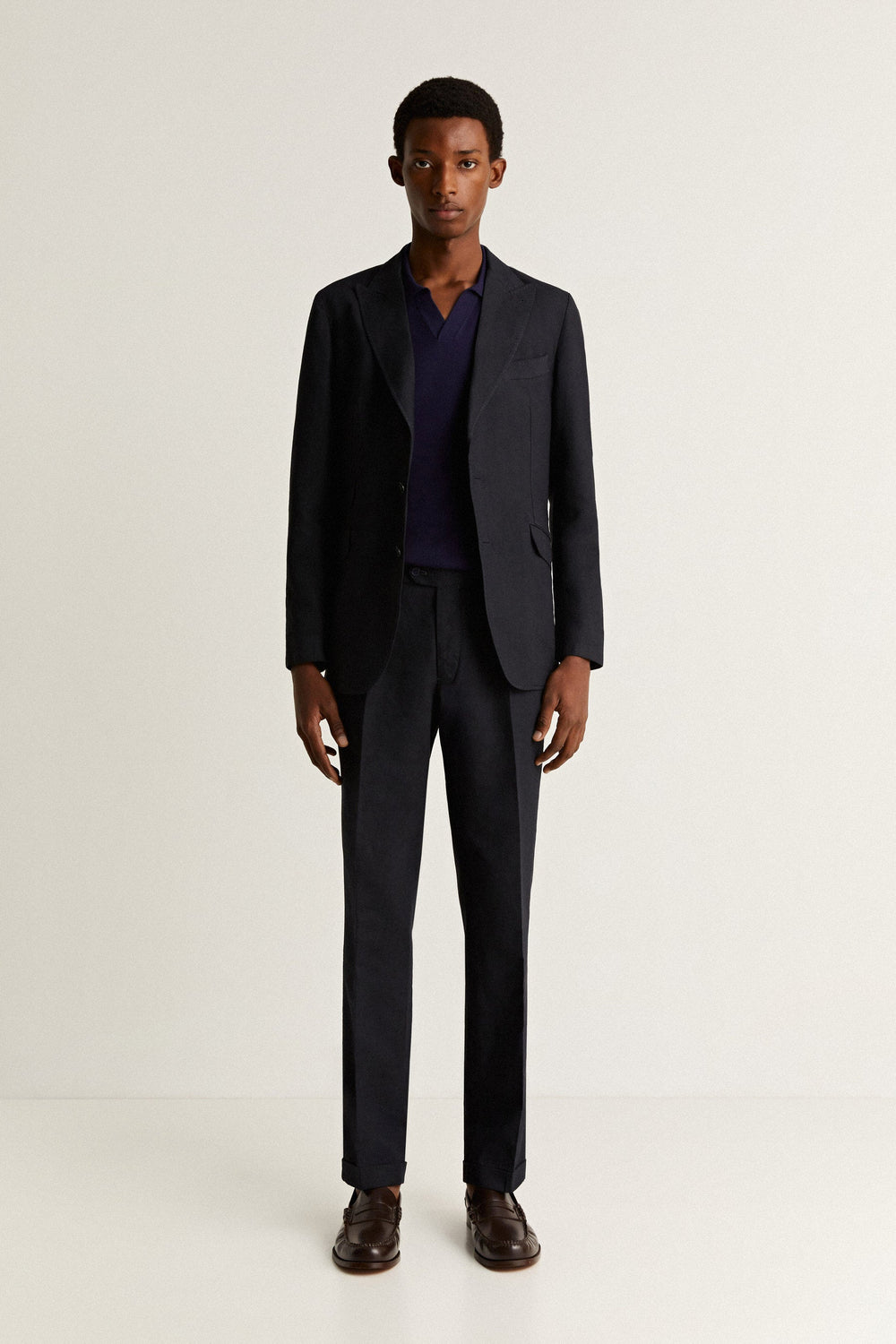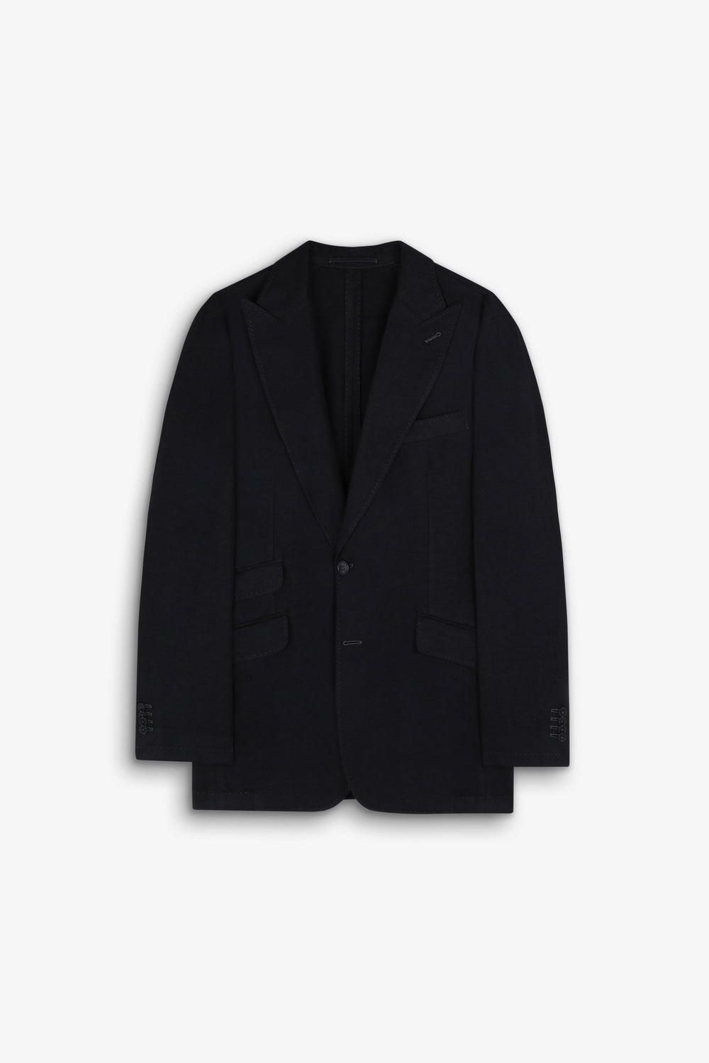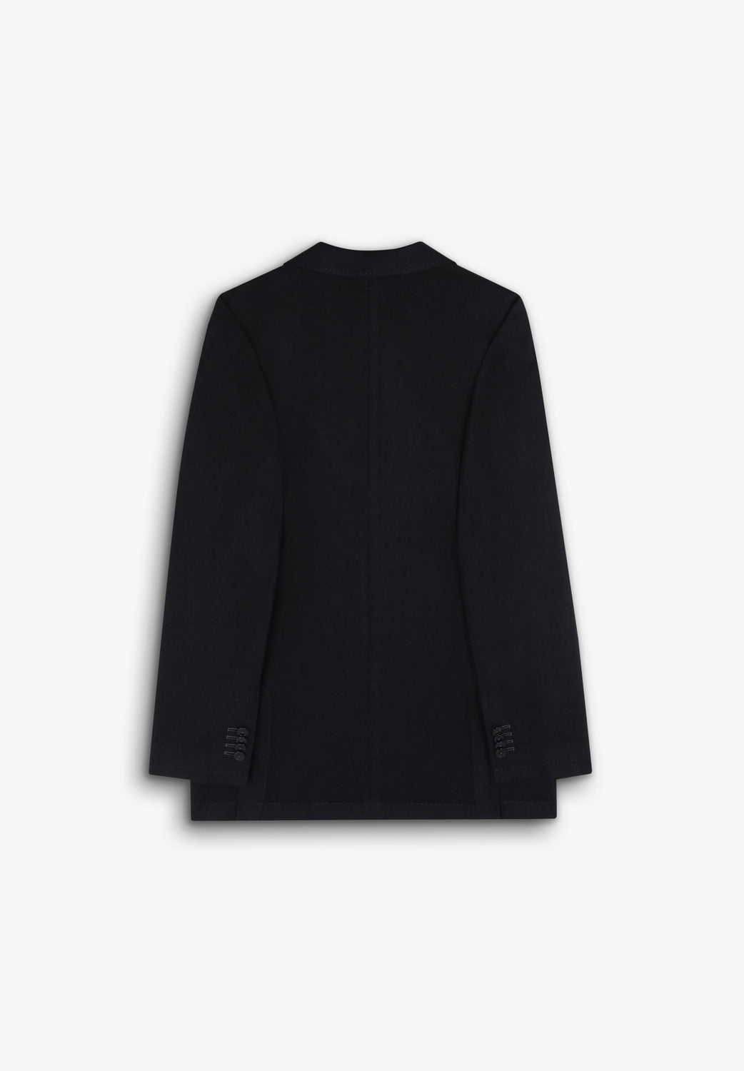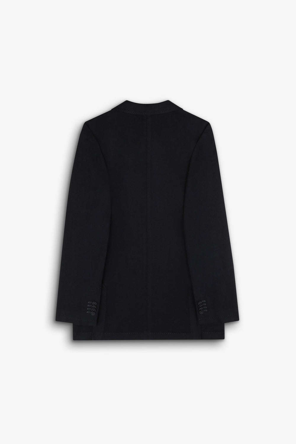 - Blazer: peaked lapel collar, button fastening and side pockets with flaps. Long sleeves with working buttoned cuffs. Semi-structured shoulder pad. Unlined