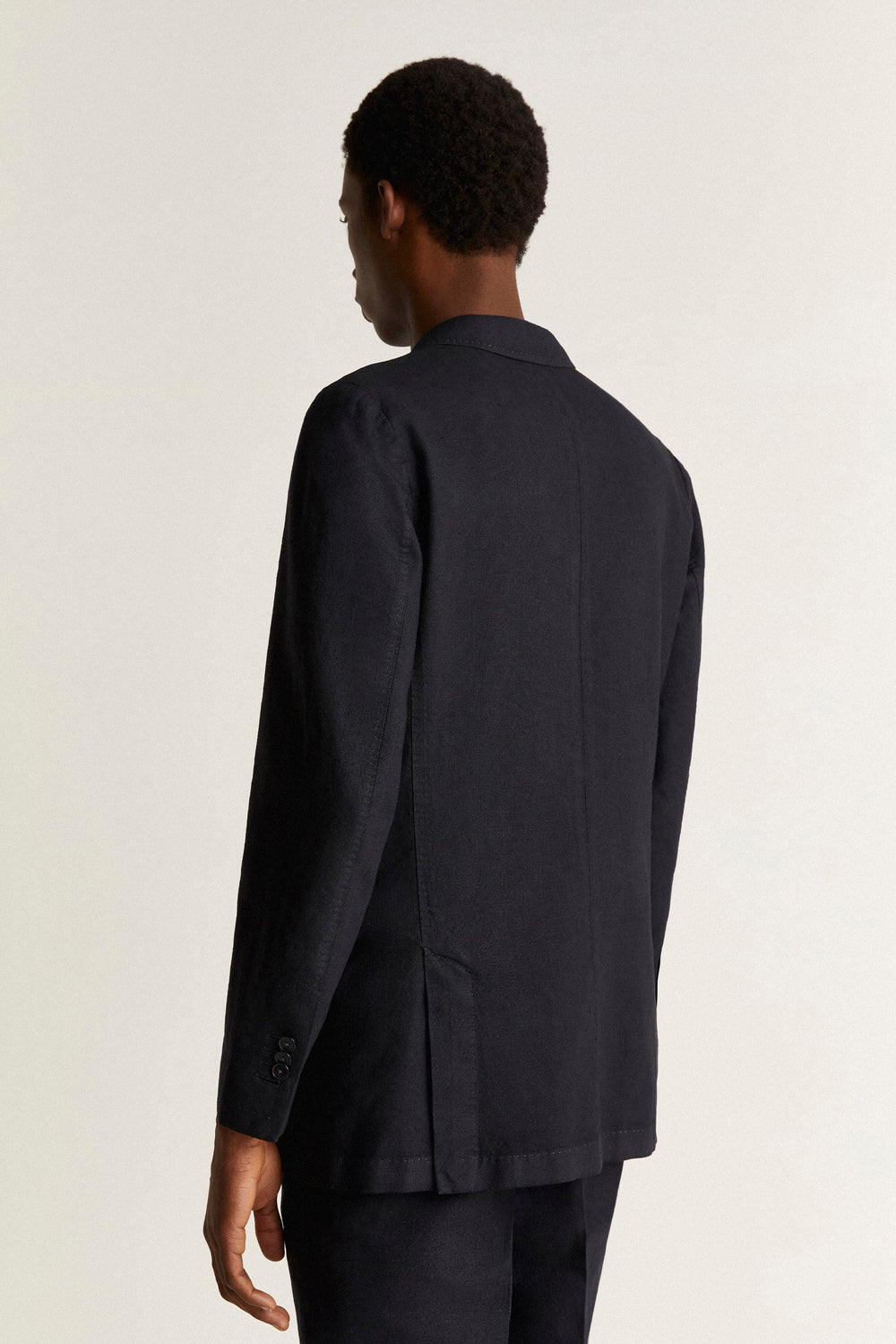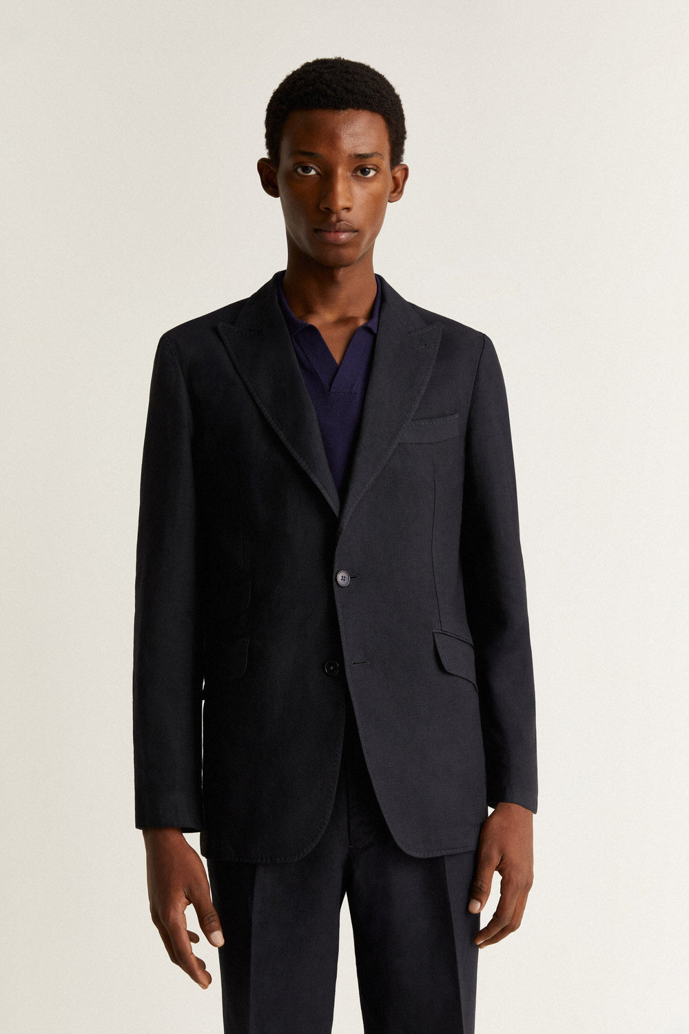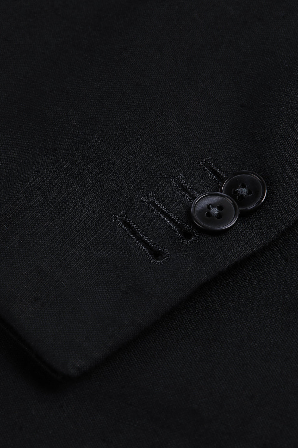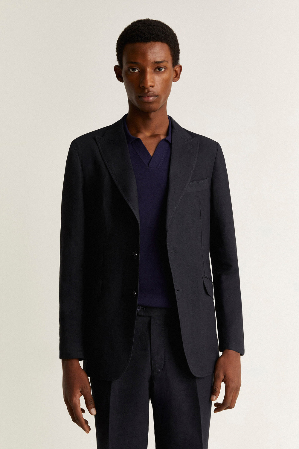 - Blazer: peaked lapel collar, button fastening and side pockets with flaps. Long sleeves with working buttoned cuffs. Semi-structured shoulder pad. Unlined