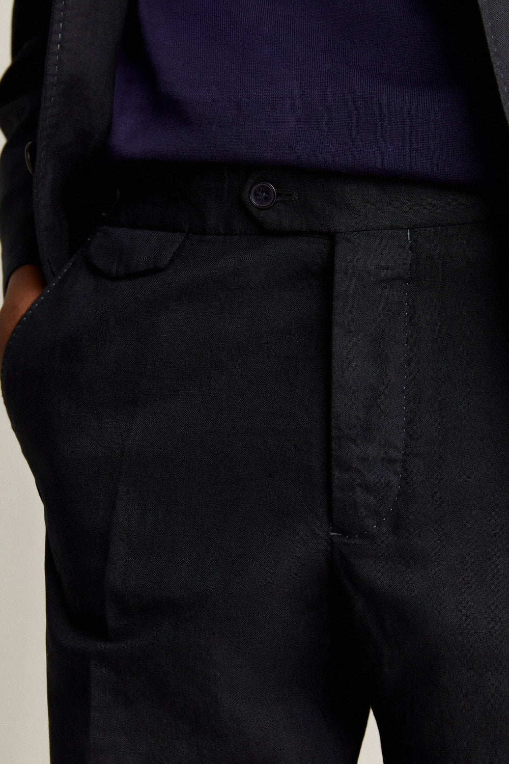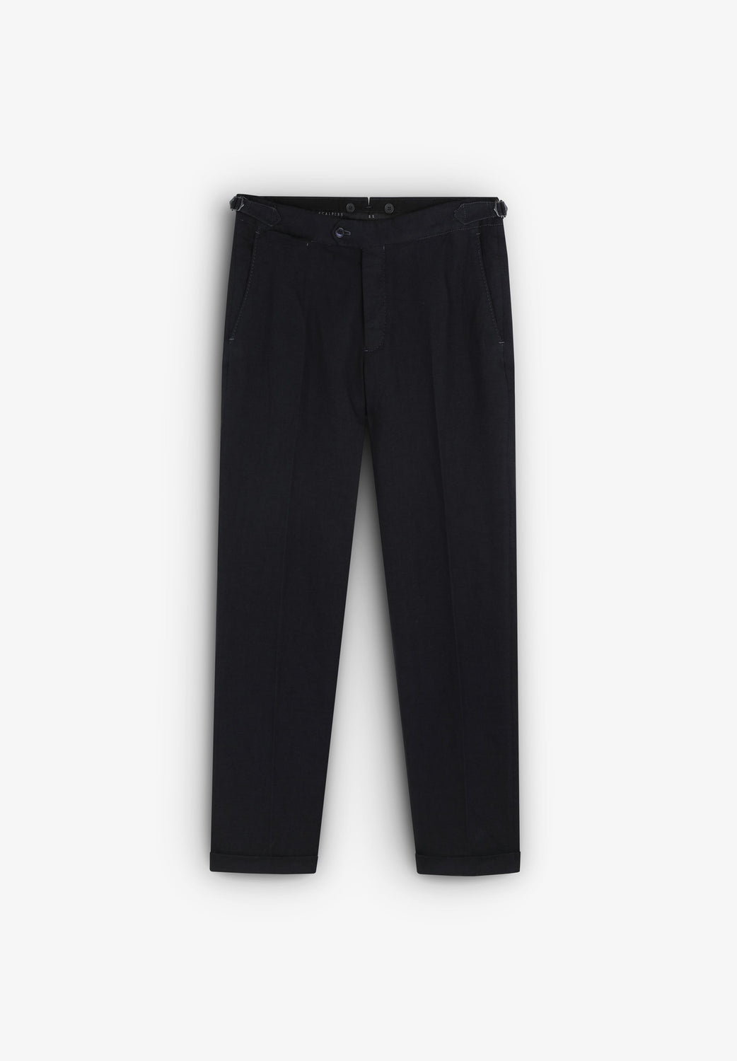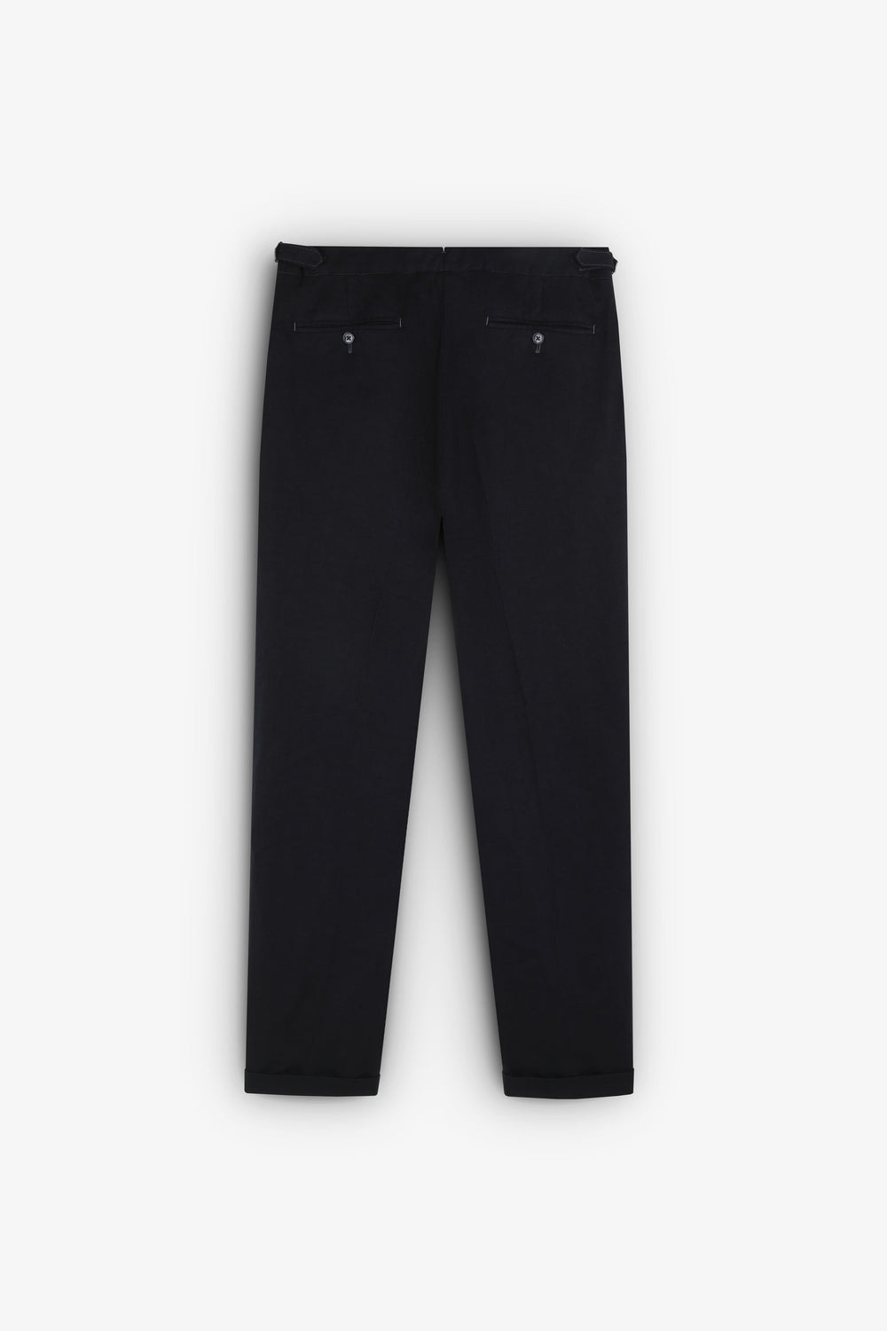 - Trousers: hook-and-eye fastening with buttoned placket, side pockets, and a ticket pocket with flap. Turn-up hem. Includes inner button for shoulder straps