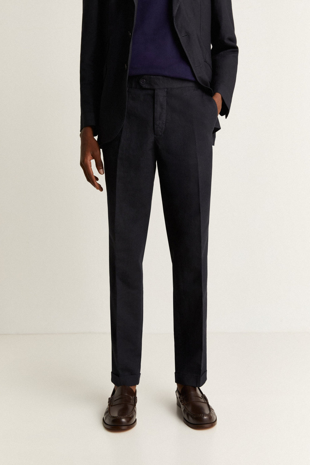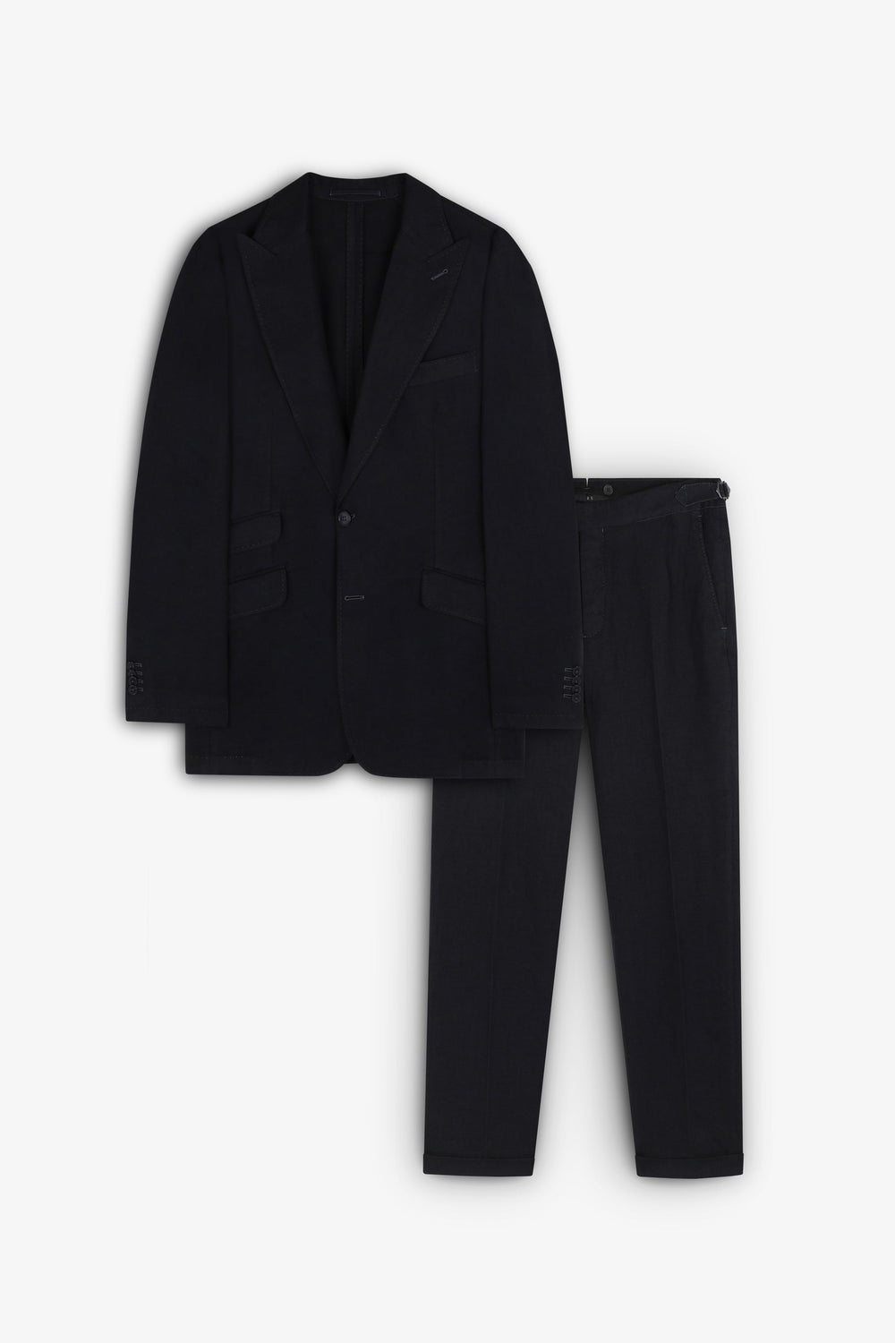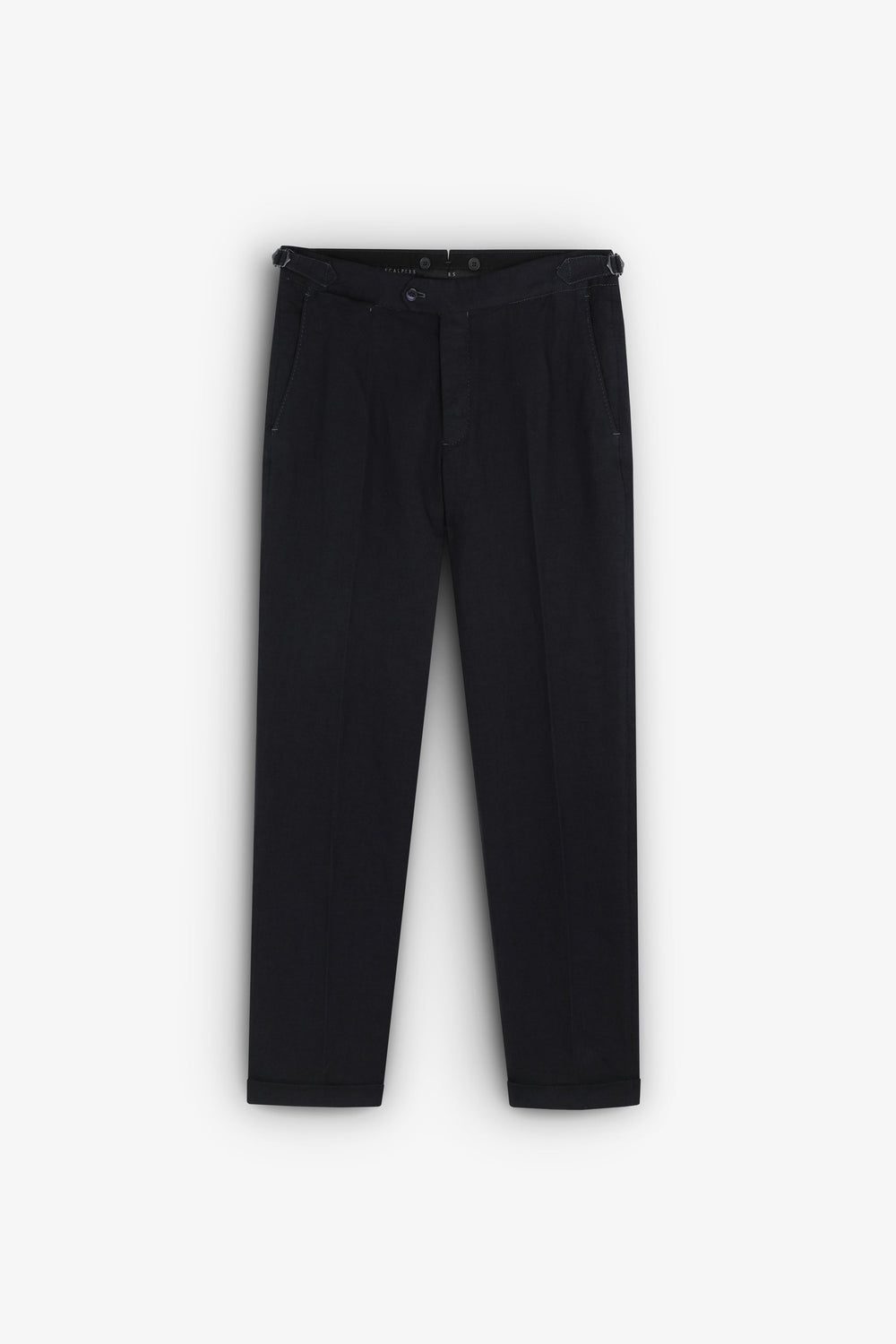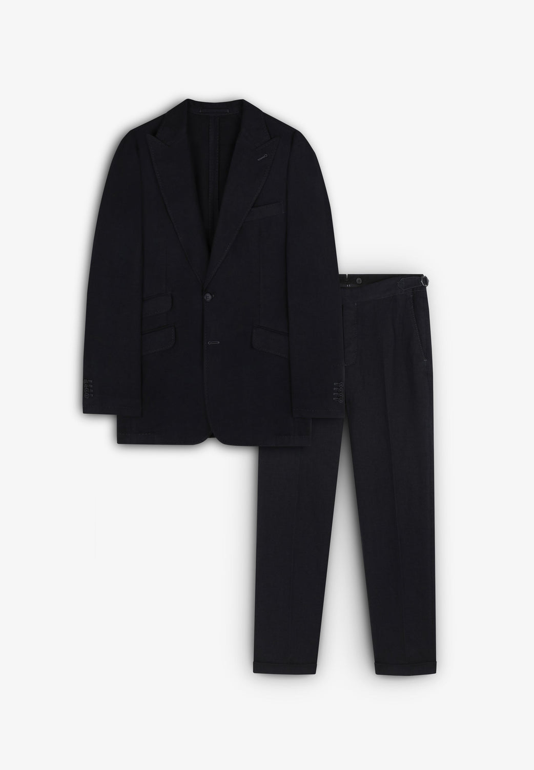 - Trousers: hook-and-eye fastening with buttoned placket, side pockets, and a ticket pocket with flap. Turn-up hem. Includes inner button for shoulder straps