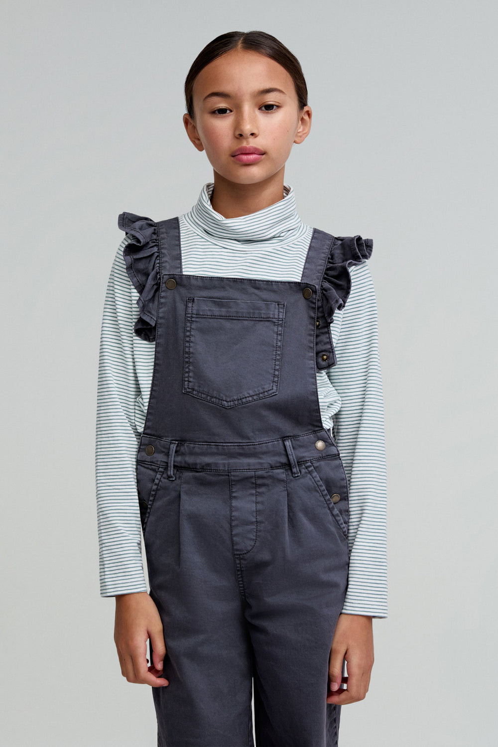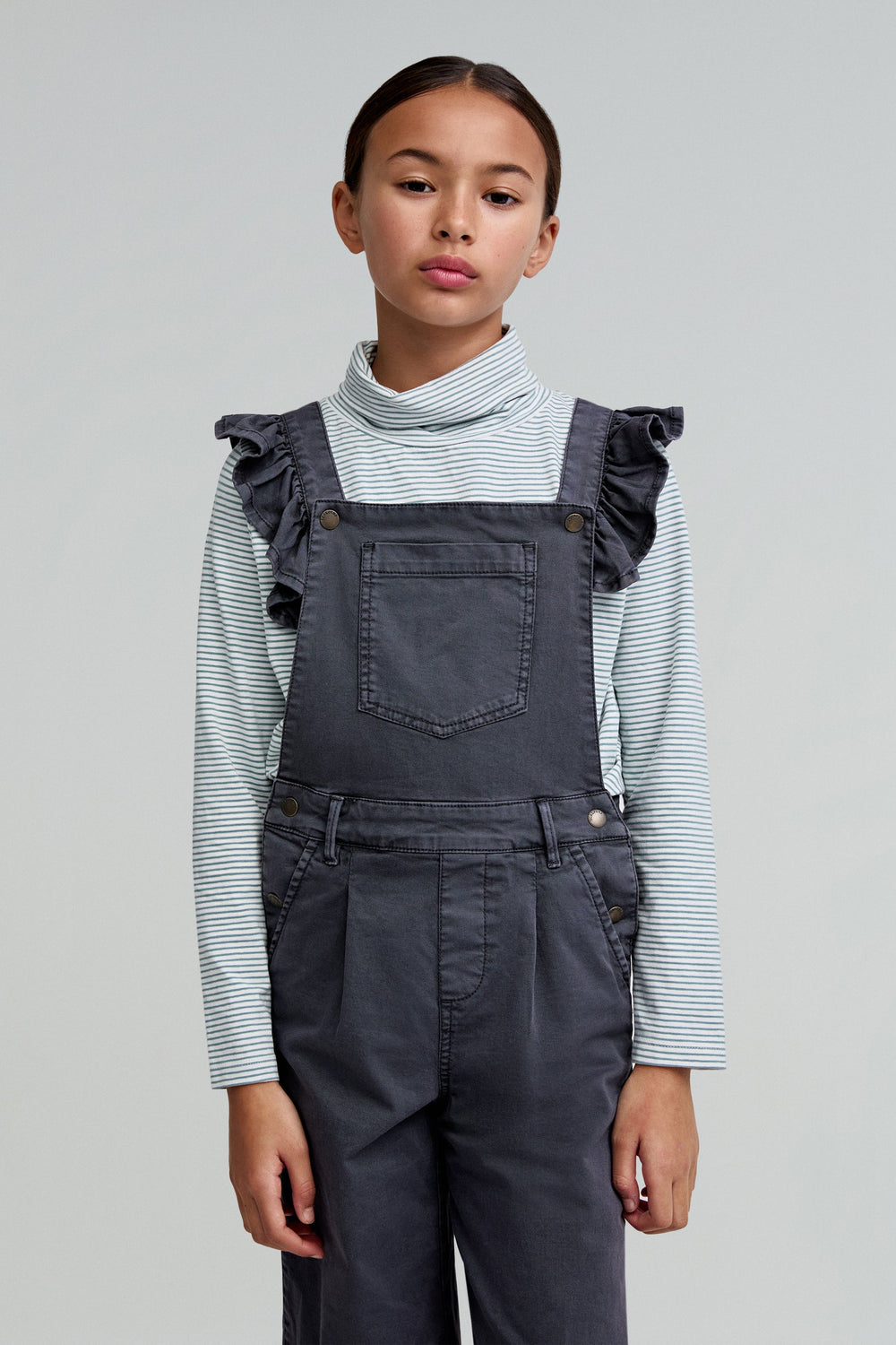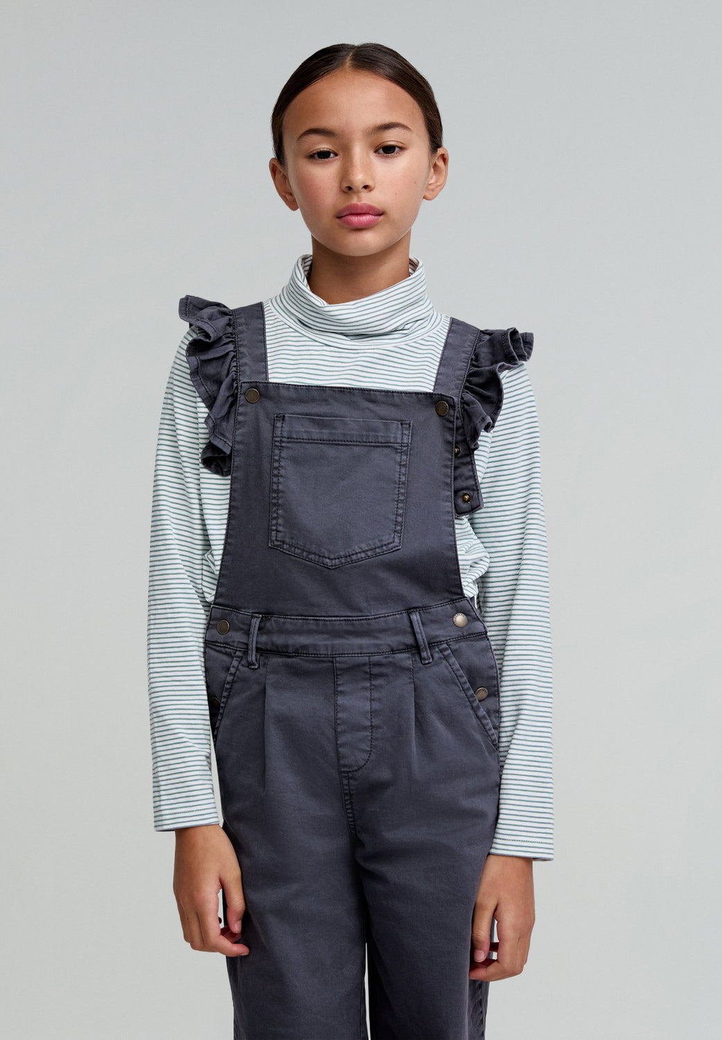 Dungarees made of slightly stretchy cotton. Regular fit with a flared cut, side button fastenings. Straps with back button and side pockets.
