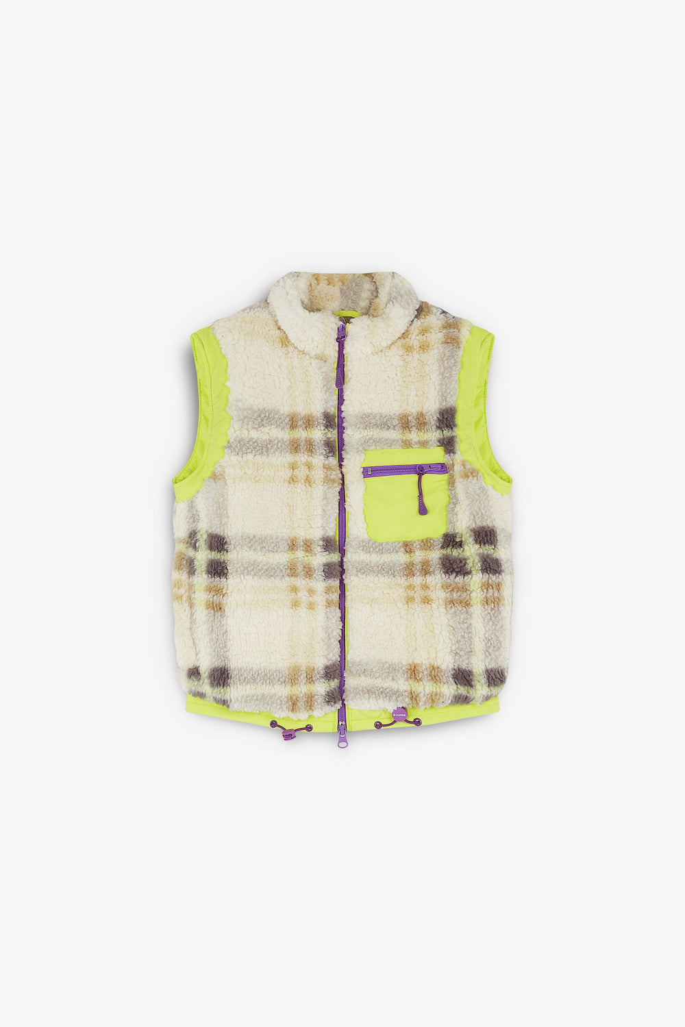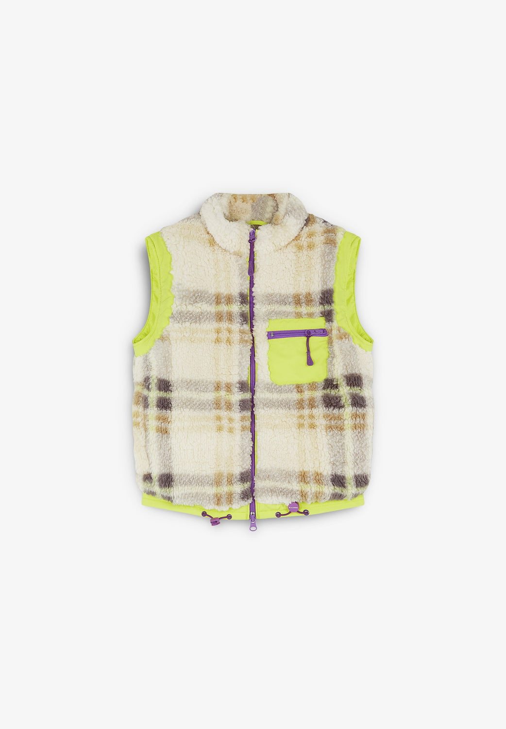 Checked fleece vest. Regular fit, high collar and zip fastening. Sleeveless, adjustable hem and side pockets. Chest pocket with zip.