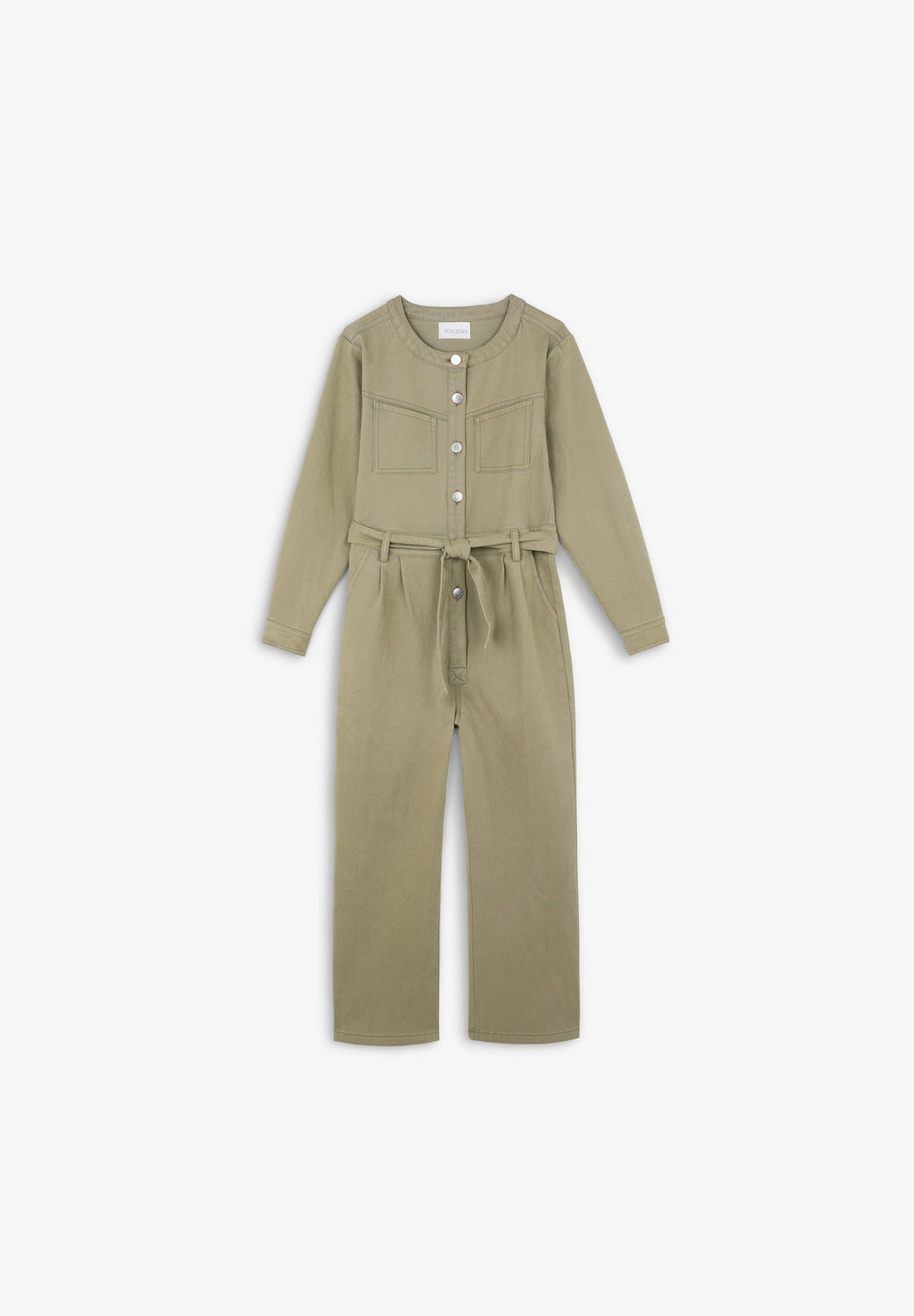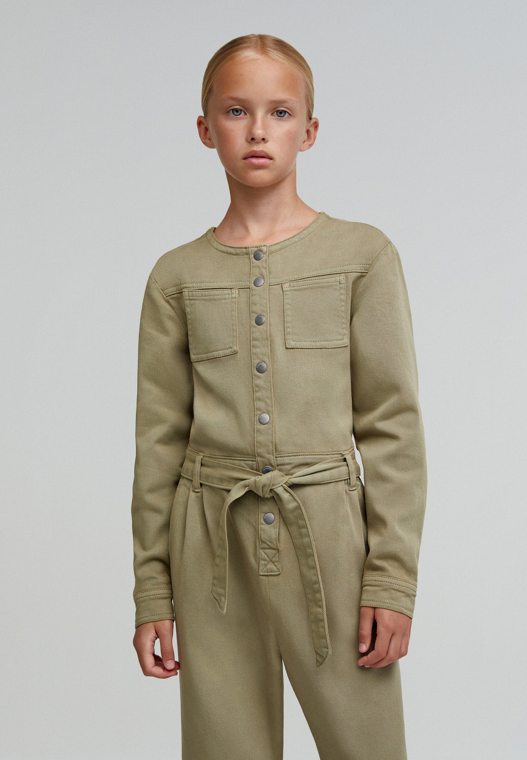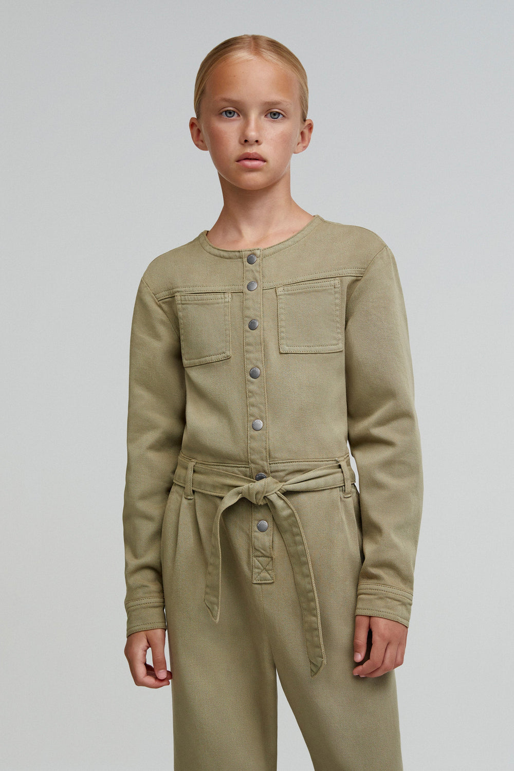 Jumpsuit made of slightly stretchy cotton. Regular fit, full length, round neck and snap button and tie fastening. Long sleeves and pockets.