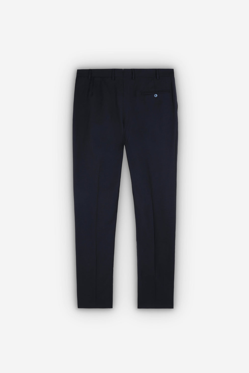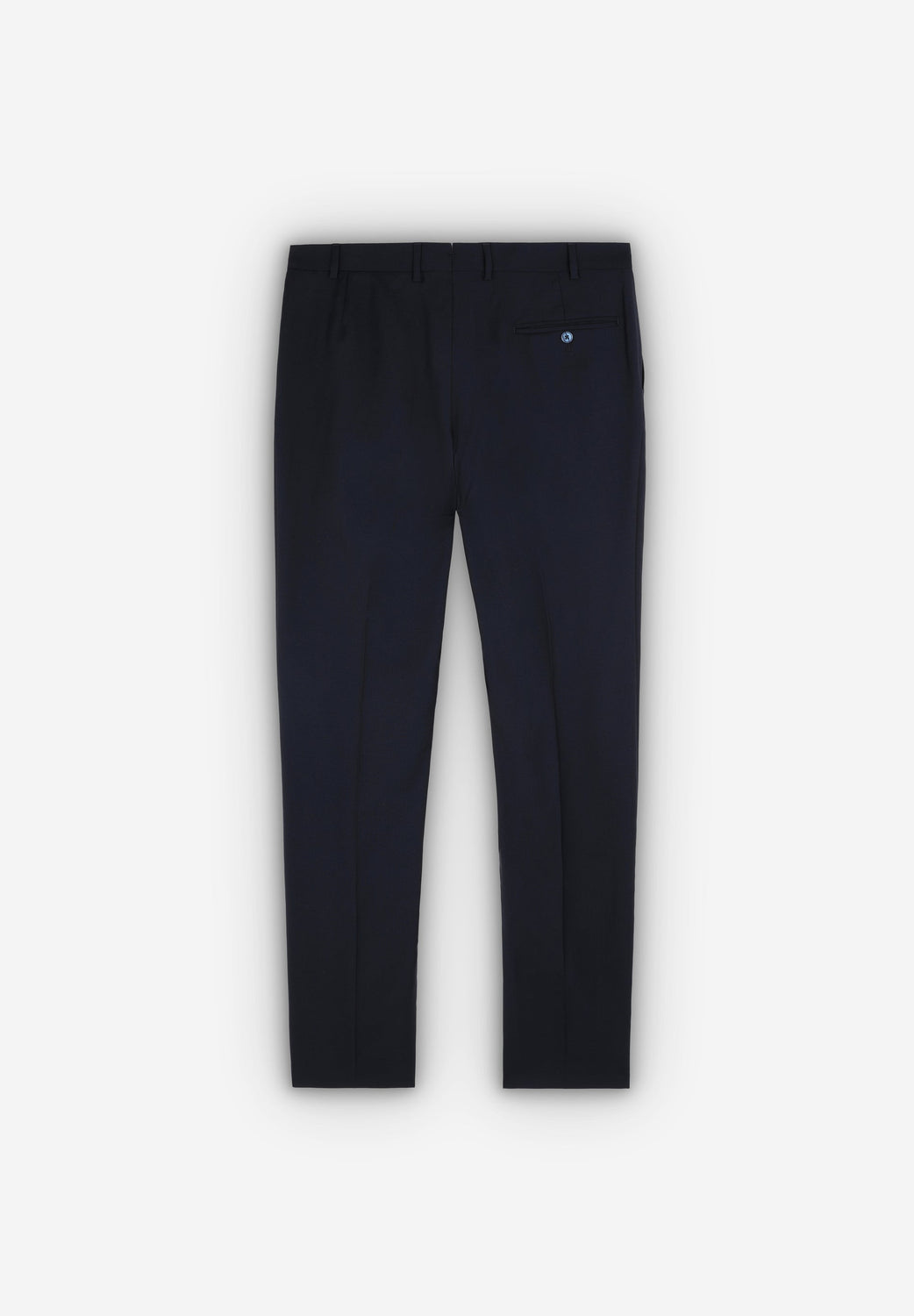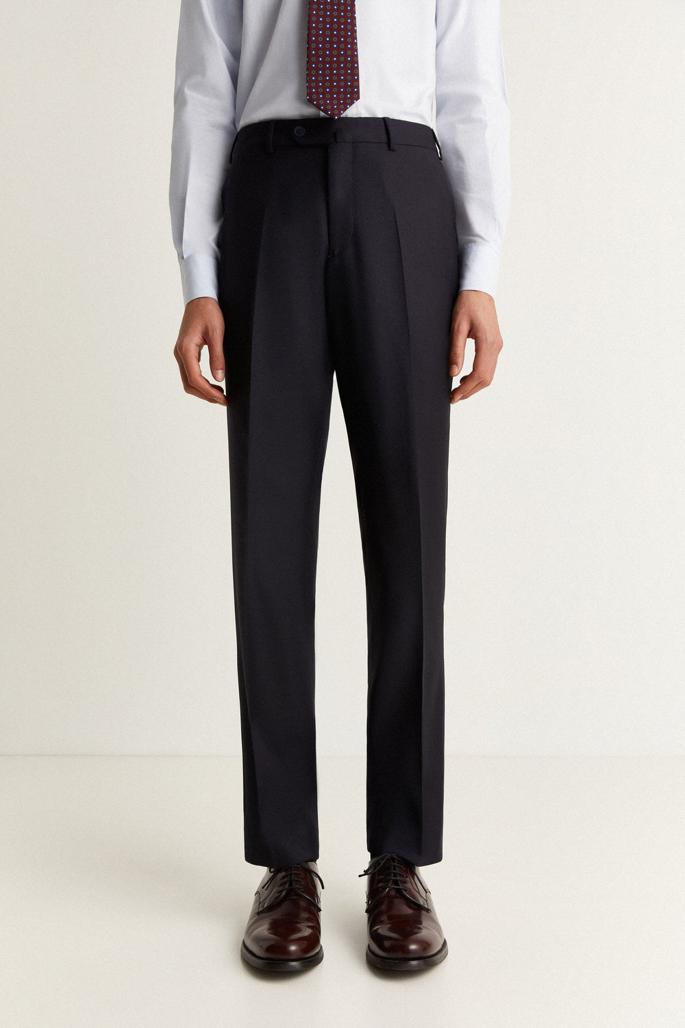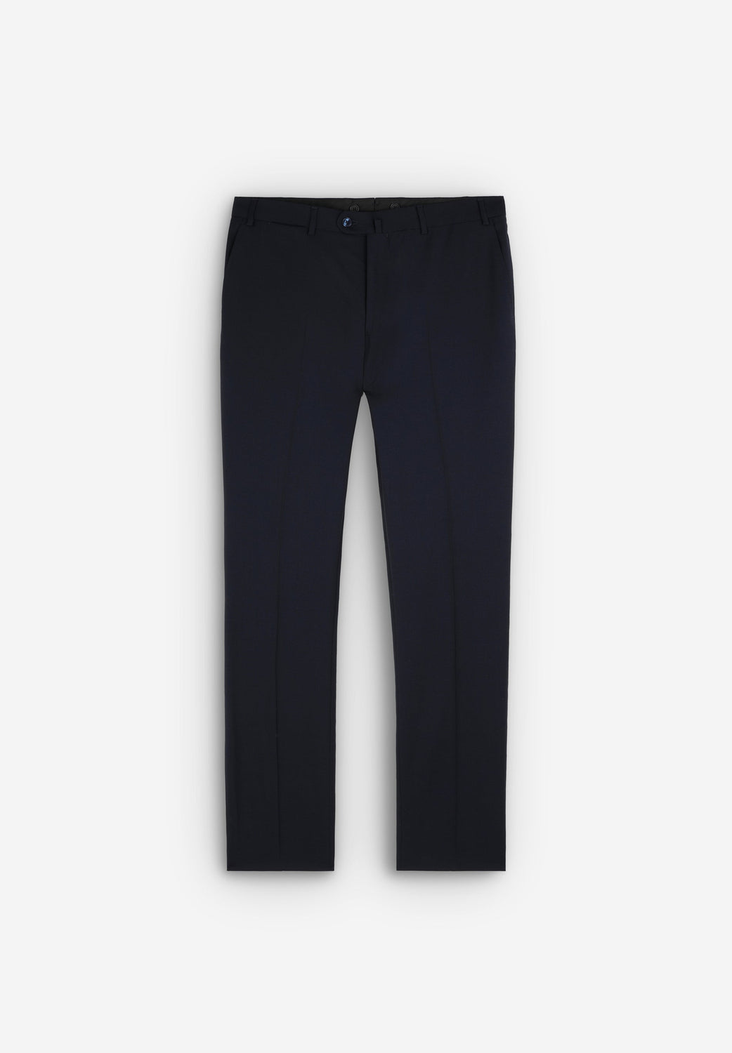 - Straight trousers with an extended button-up fastening at the waist and a zip. Inner button for braces. Belt loops at the waist. Simple hem without turn-up
