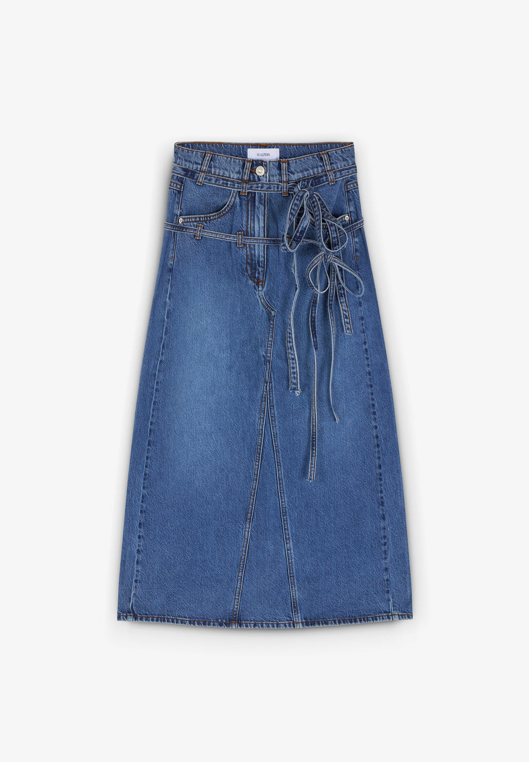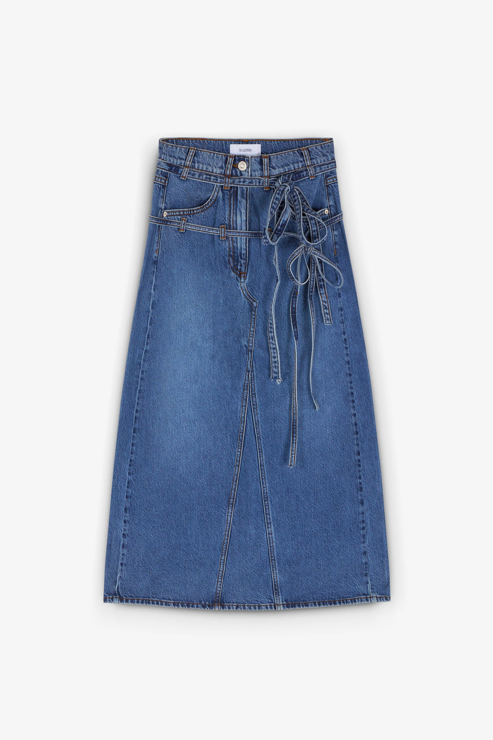 Denim midi skirt. Regular fit, button and zip fastening and belt loops at waist. Back and front pockets. Back vent and bow details.