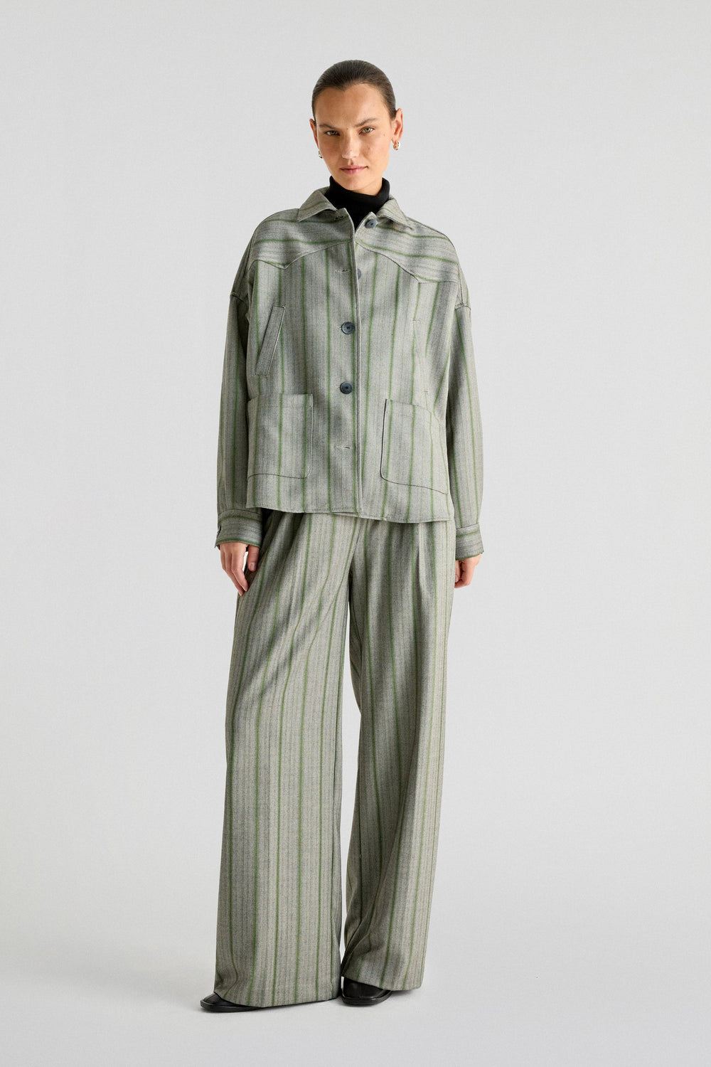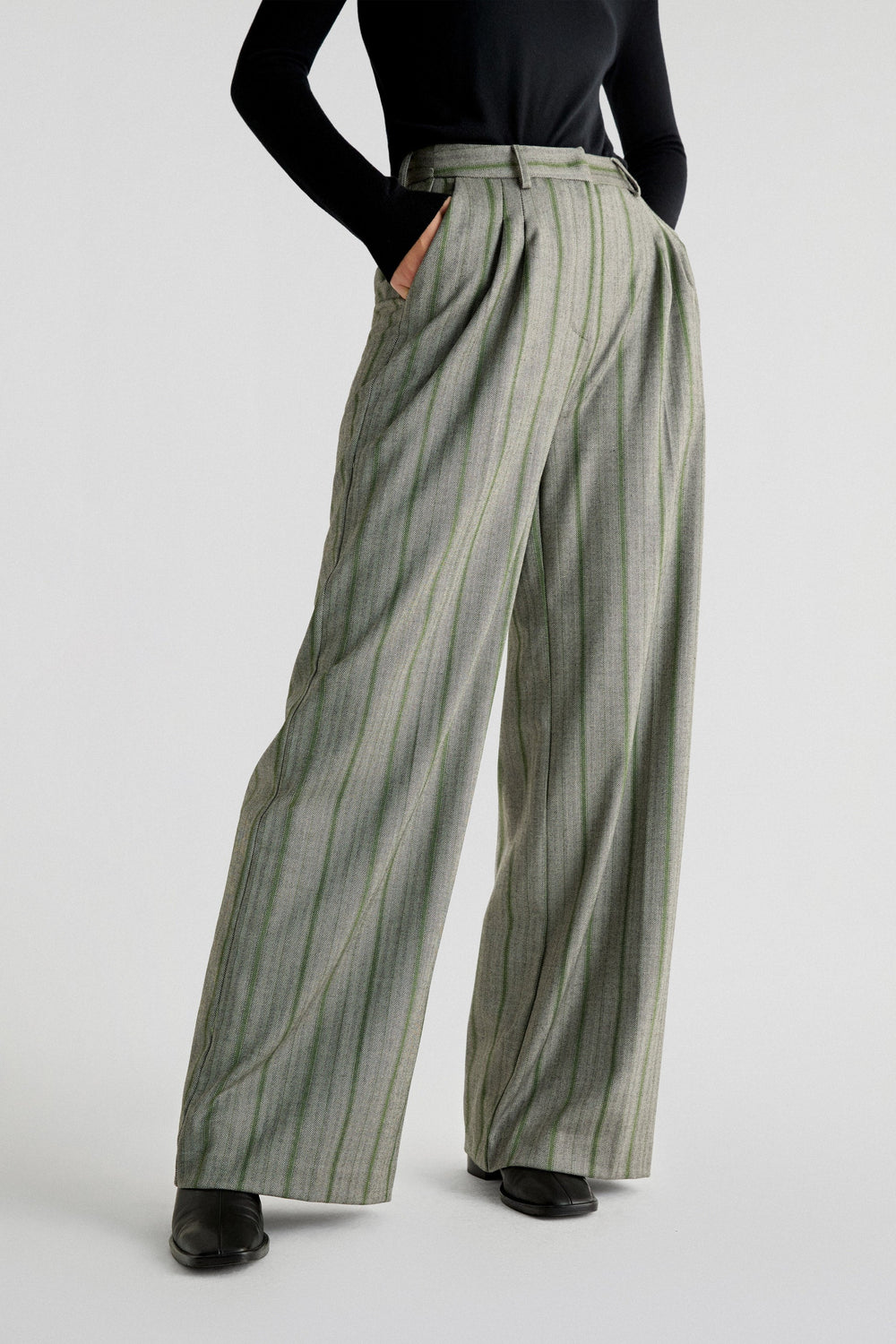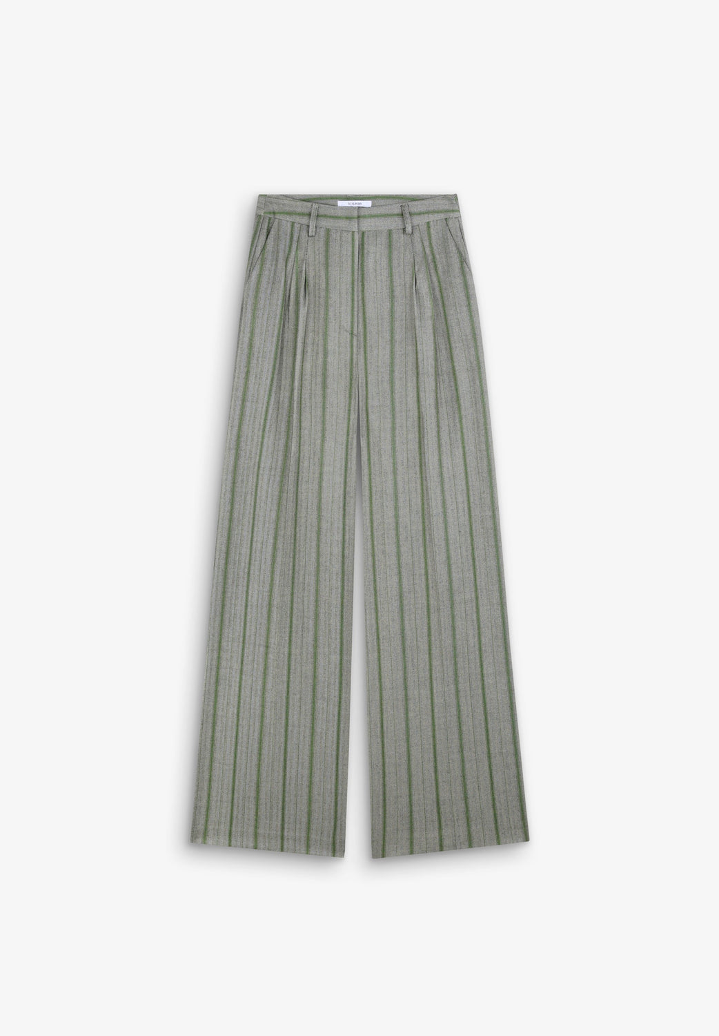 Trousers made of striped fabric. Wide-leg fit with darts, hook and zip fastening with side pockets. Belt loops and side pockets.