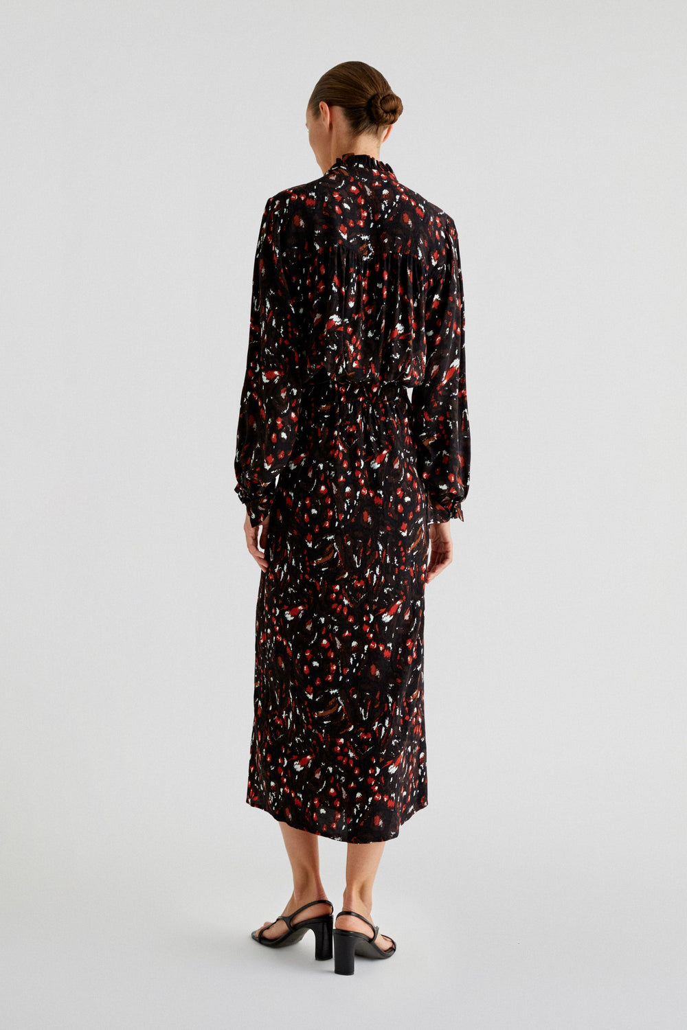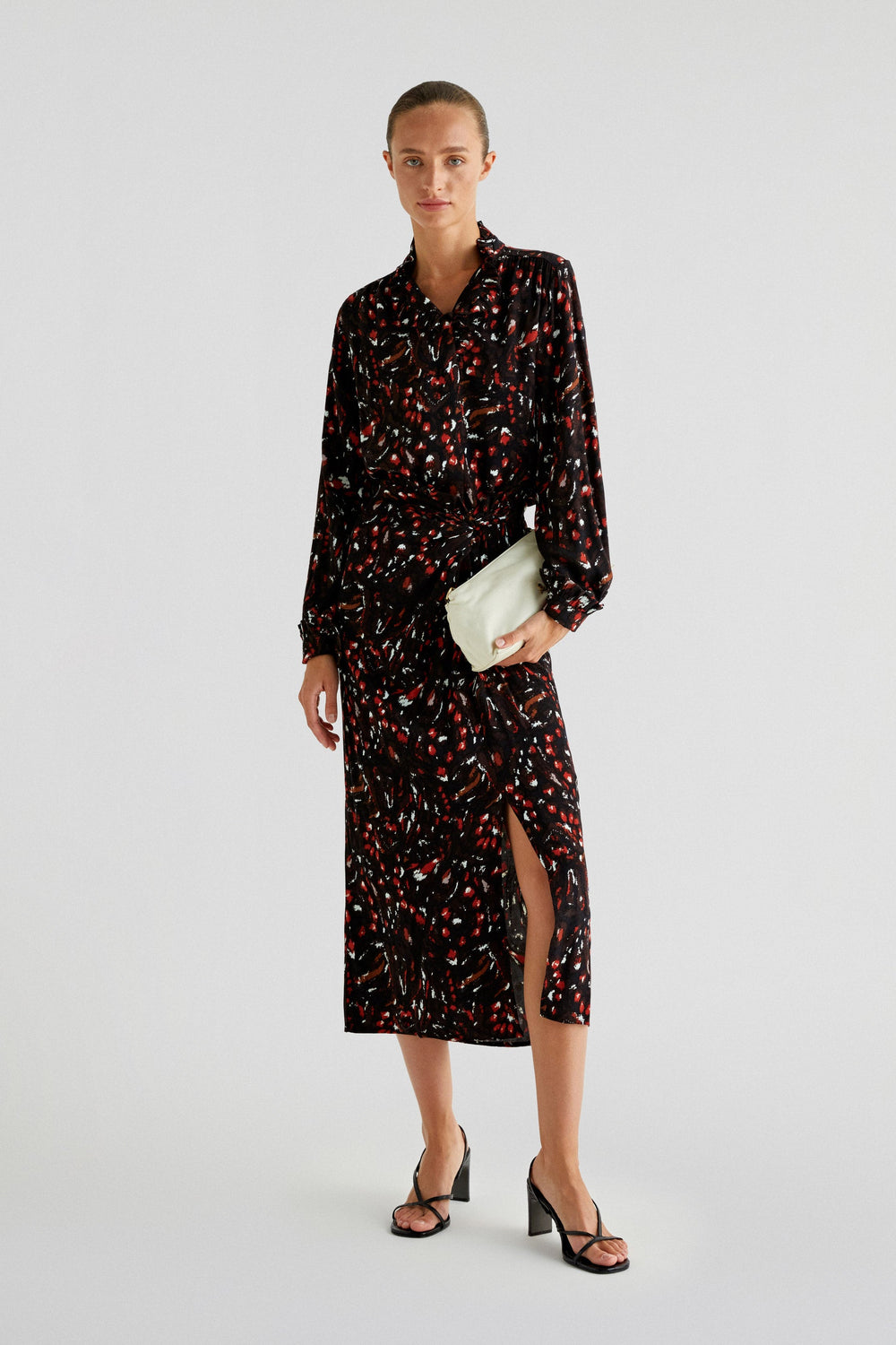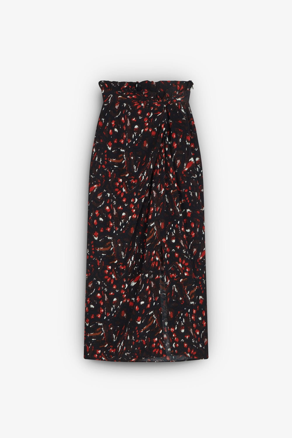 Printed skirt made of flowing fabric. Regular fit with a high waist, zip fastening and a draped front. Slit on the hem.
