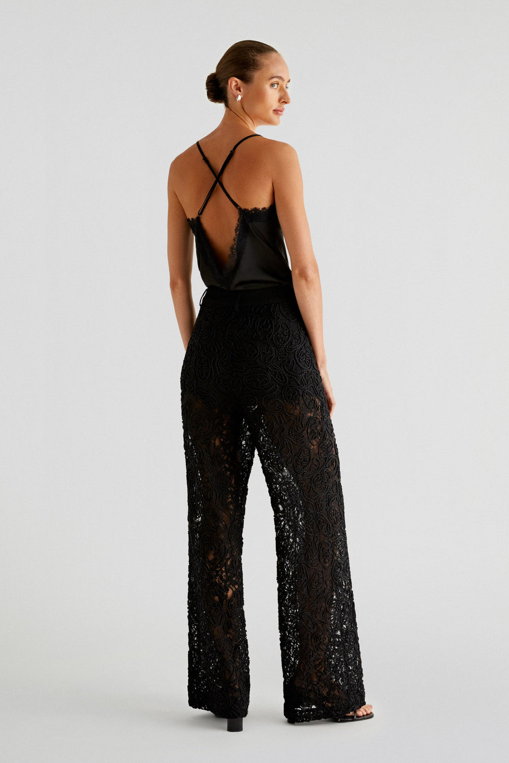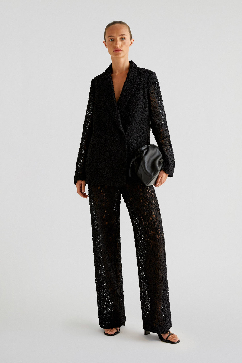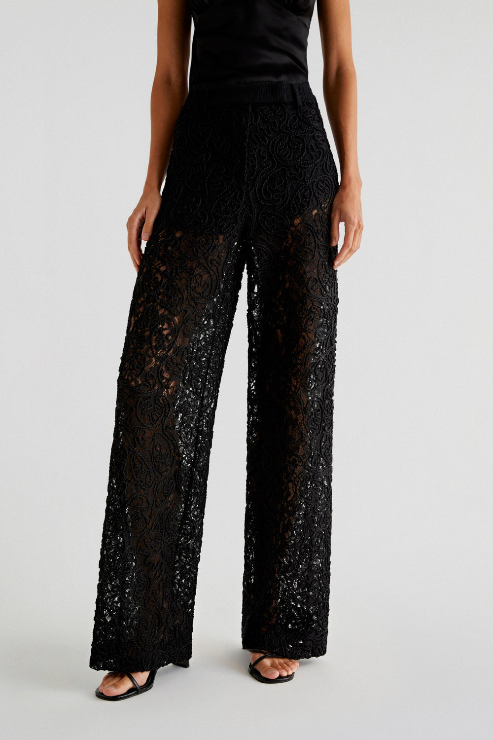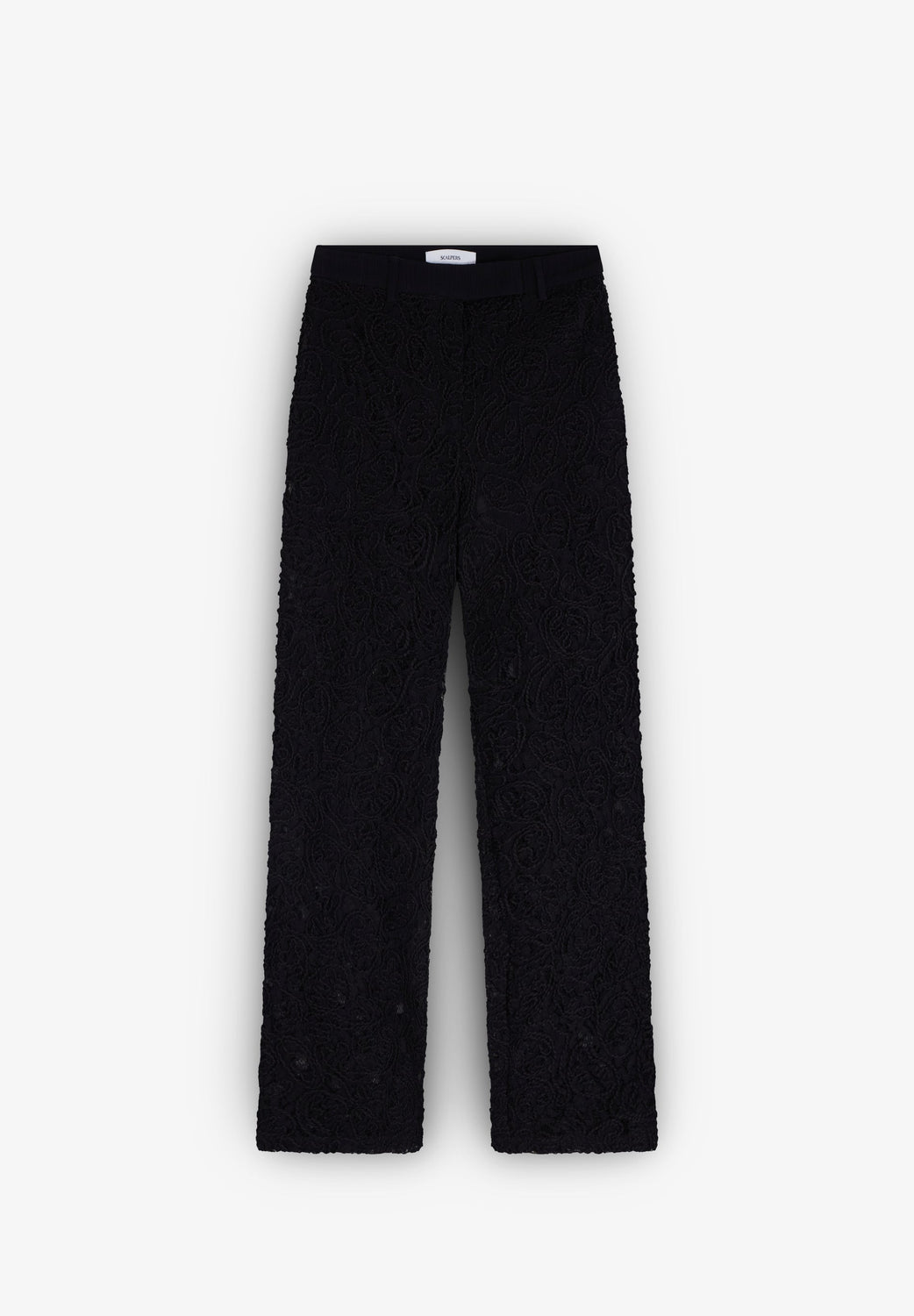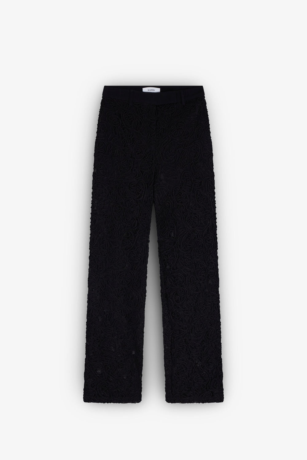 Trousers made of embroidered lace fabric. Straight fit with a high waist, hook and zip fastening. Belt loops at the waist.