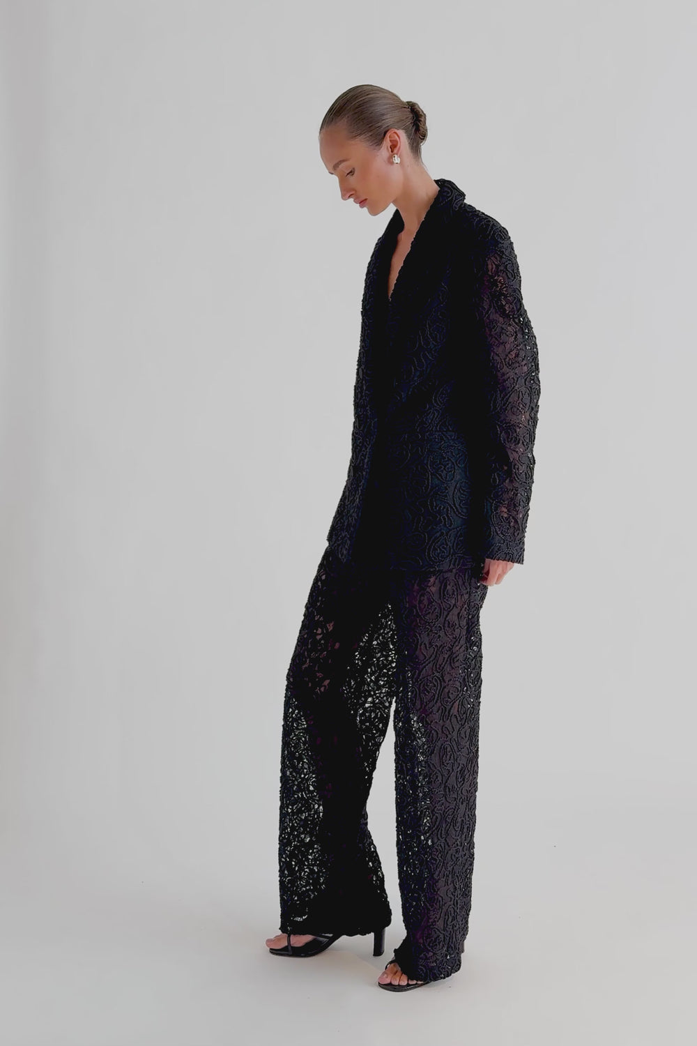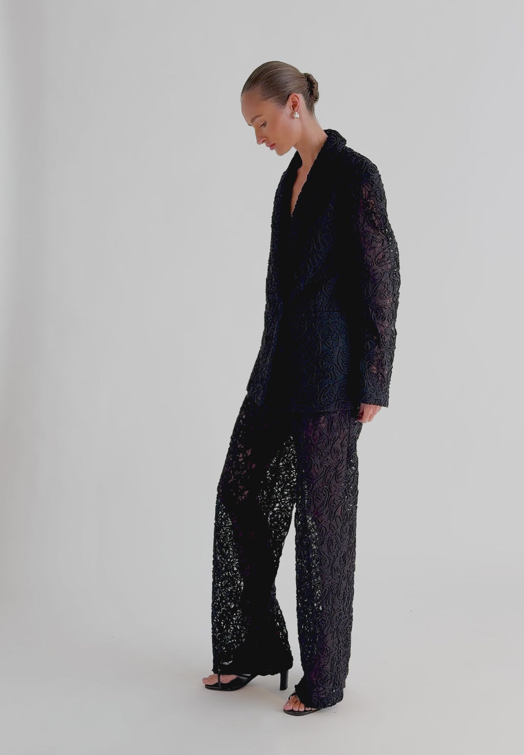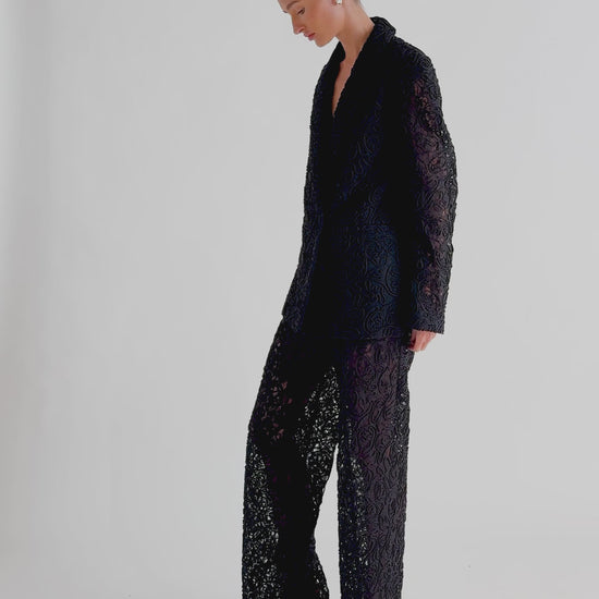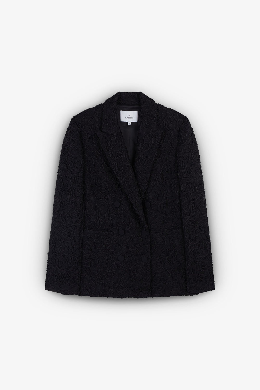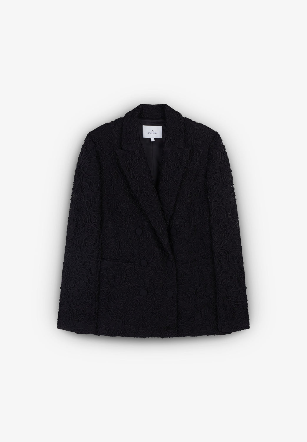 Embroidered lace blazer made of nylon and cotton. Regular fit, double-breasted button fastening and long sleeves. Side pockets.