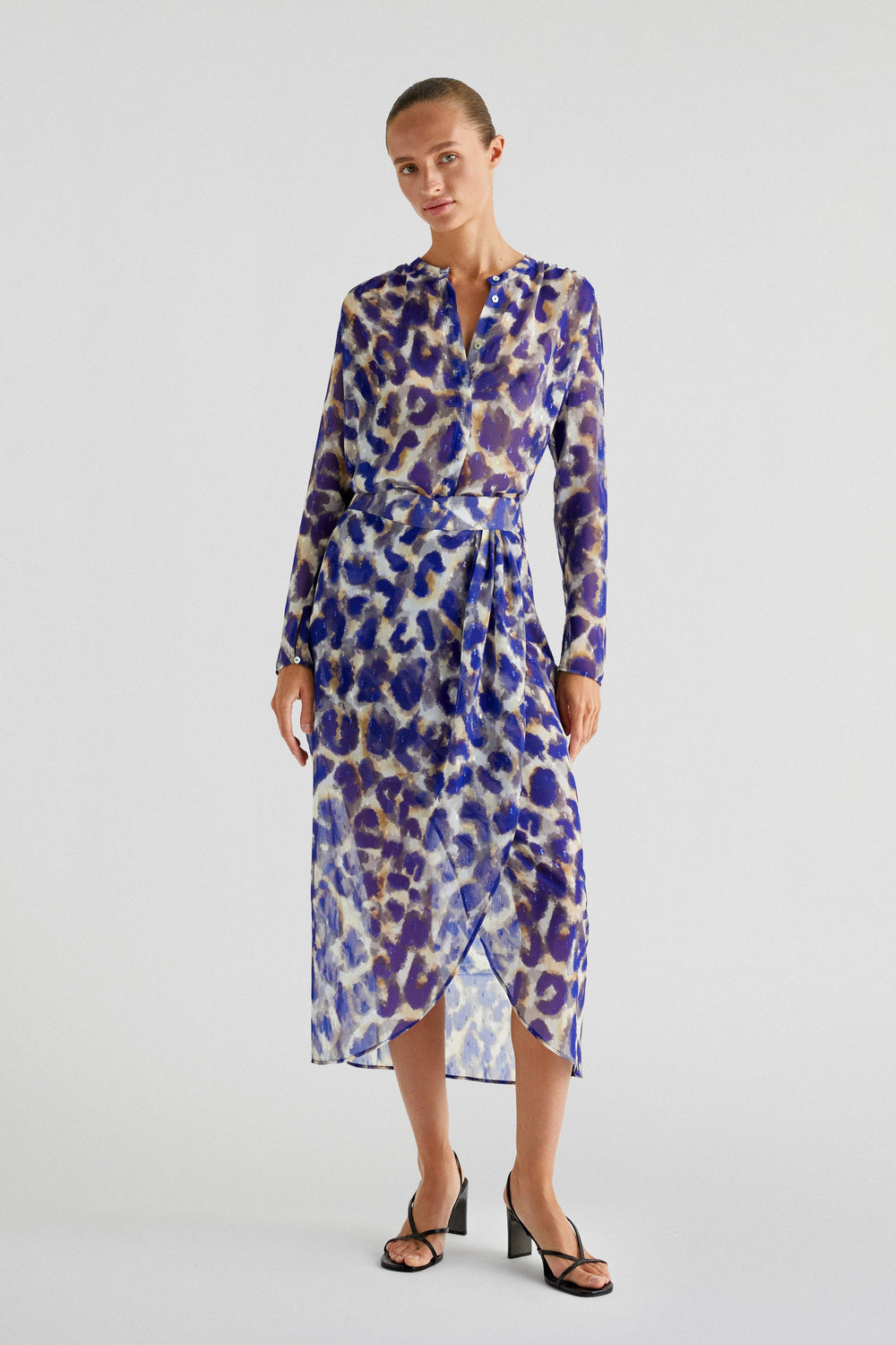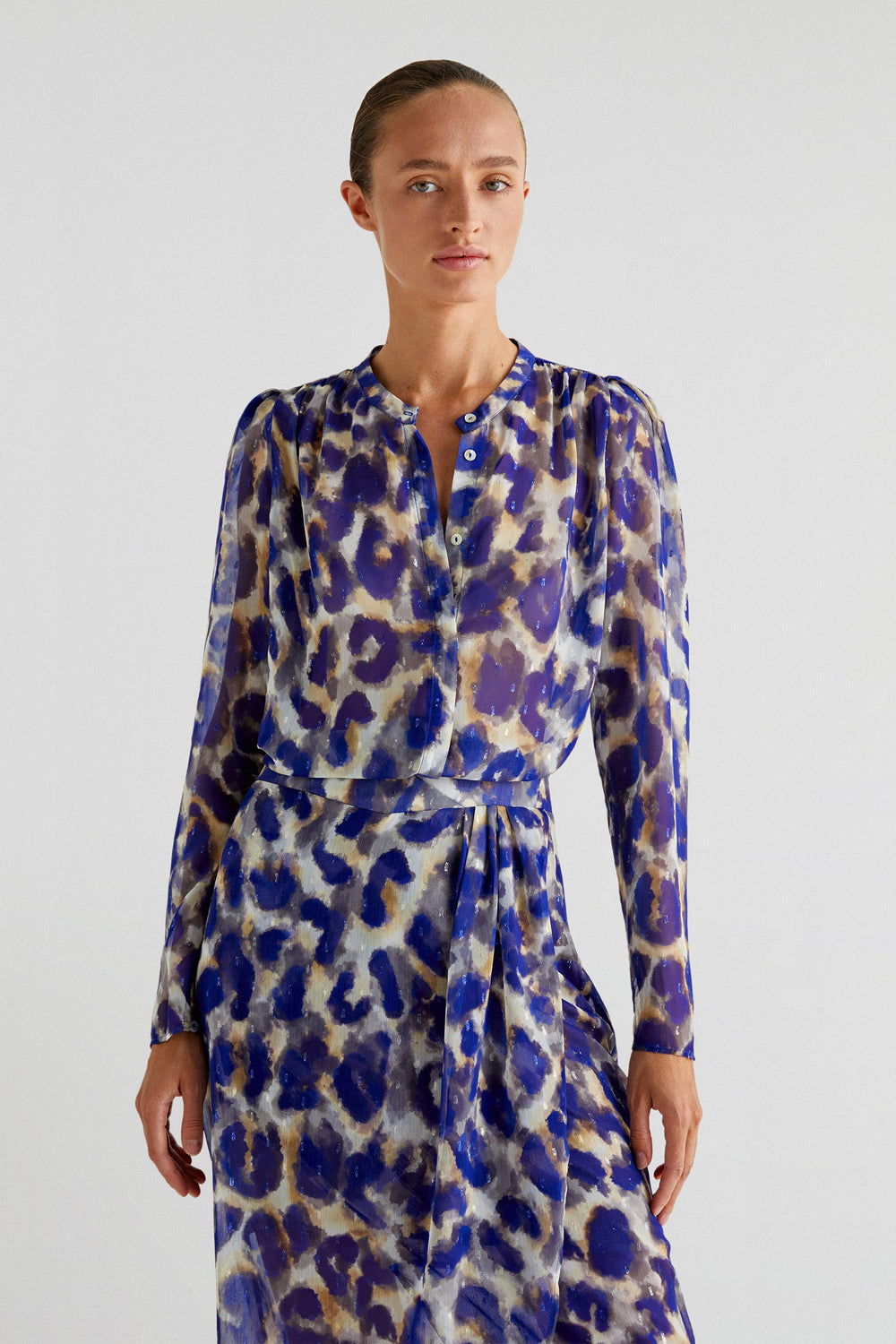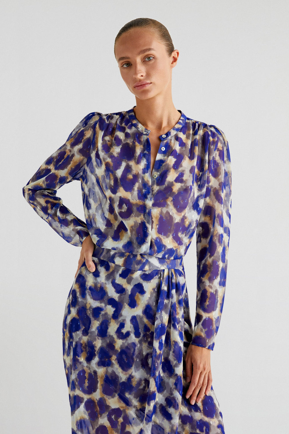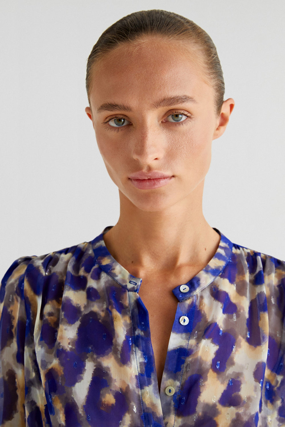 Animal print blouse made of flowing fabric. Regular fit, stand-up collar and button fastening. Slightly puffed long sleeves.