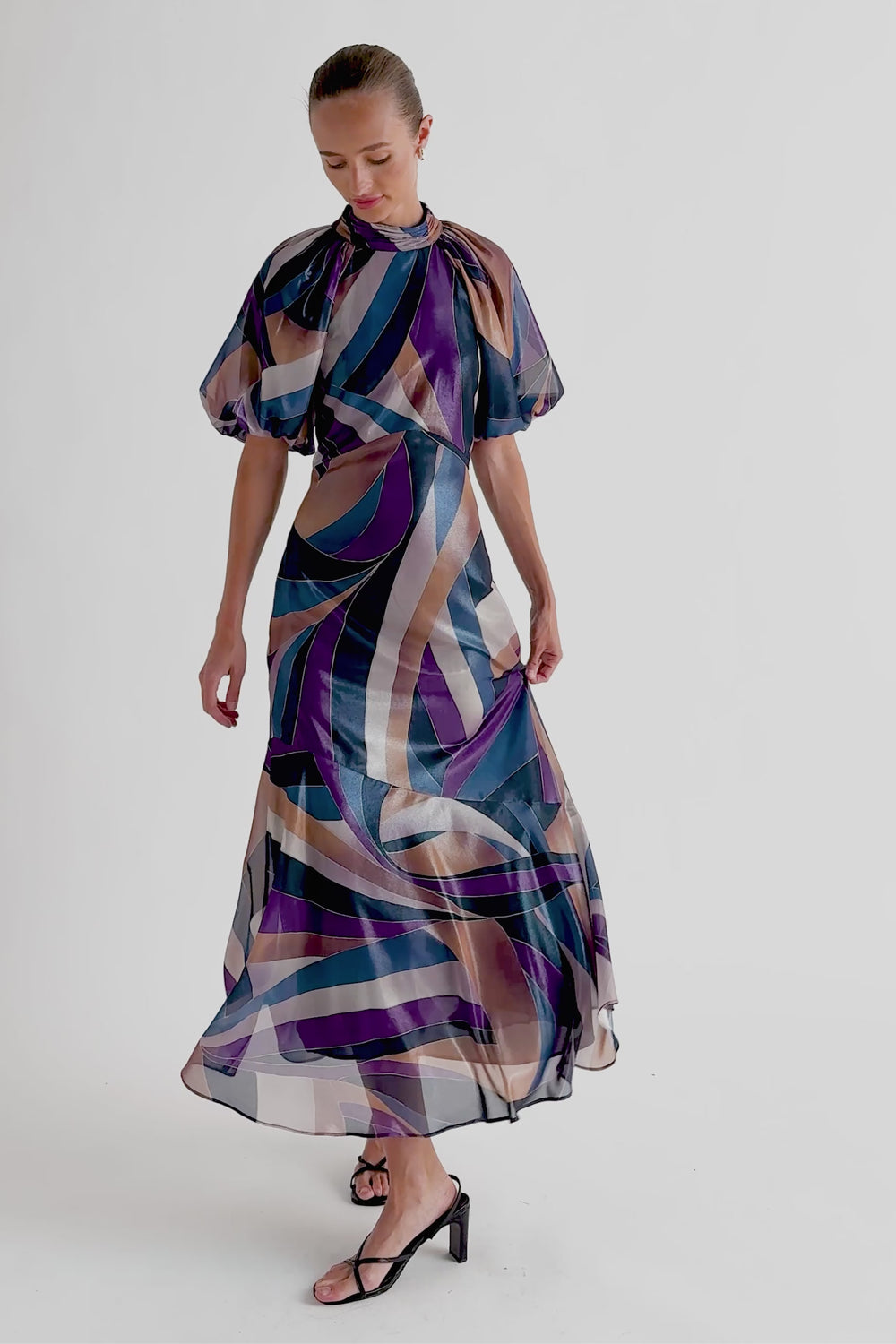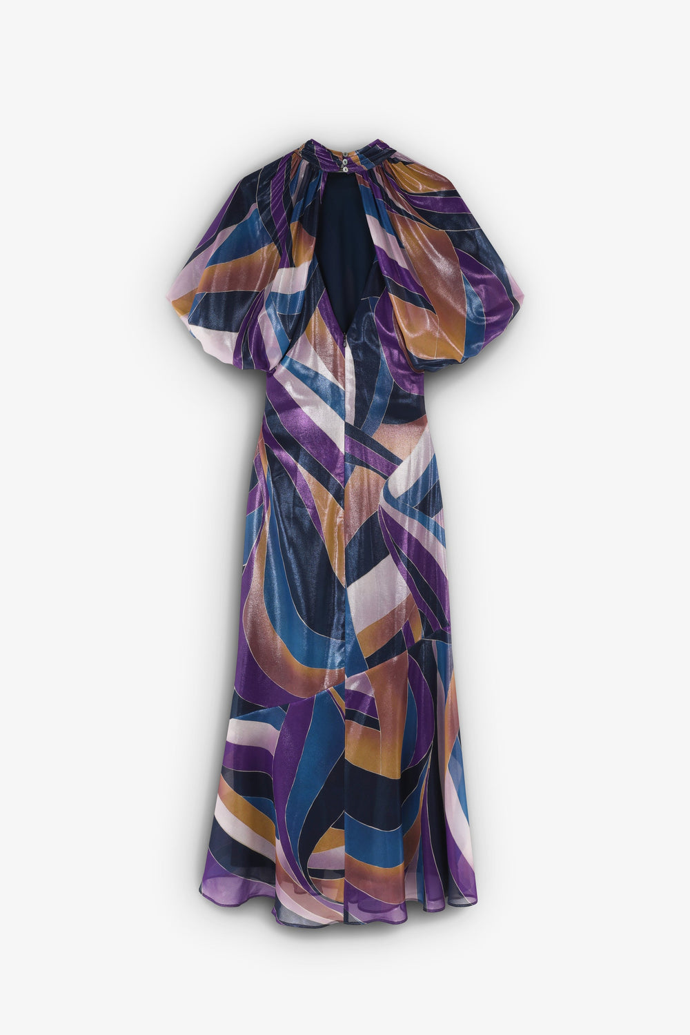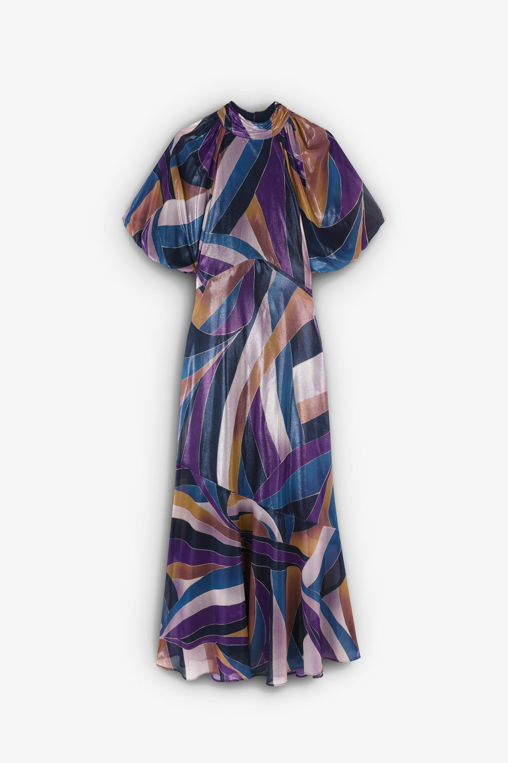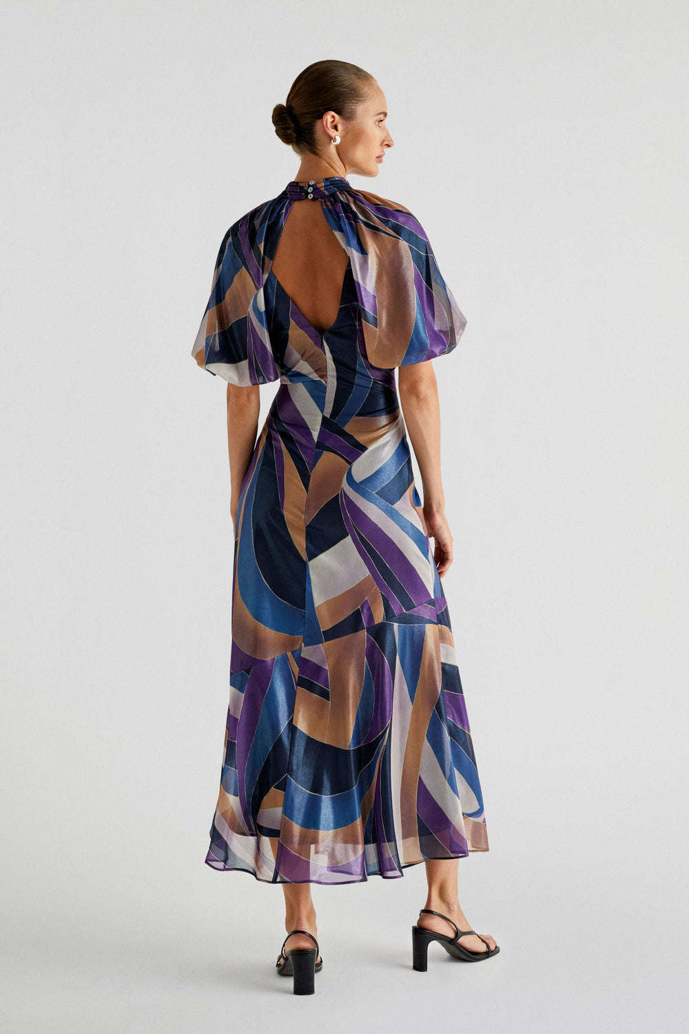 Printed midi dress made of flowing fabric. Regular fit, stand-up collar and open back with buttons. Short puffed sleeves. Frill detail on the hem.