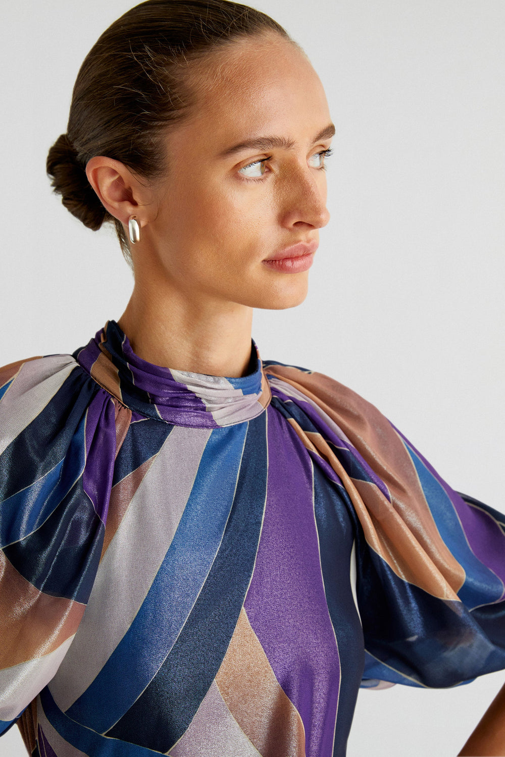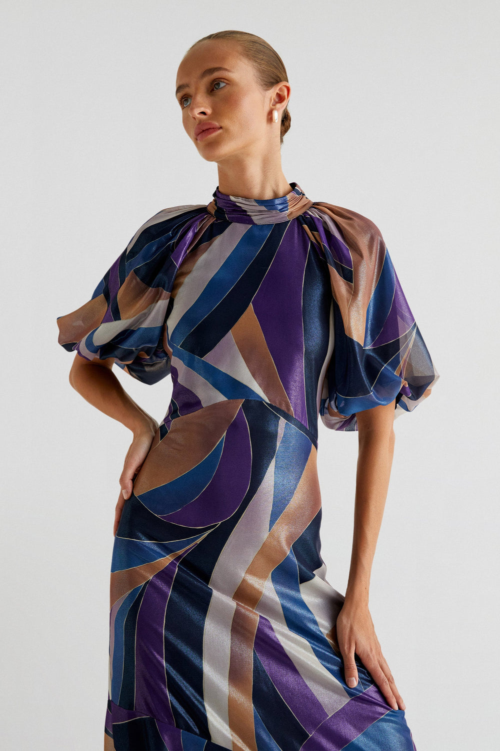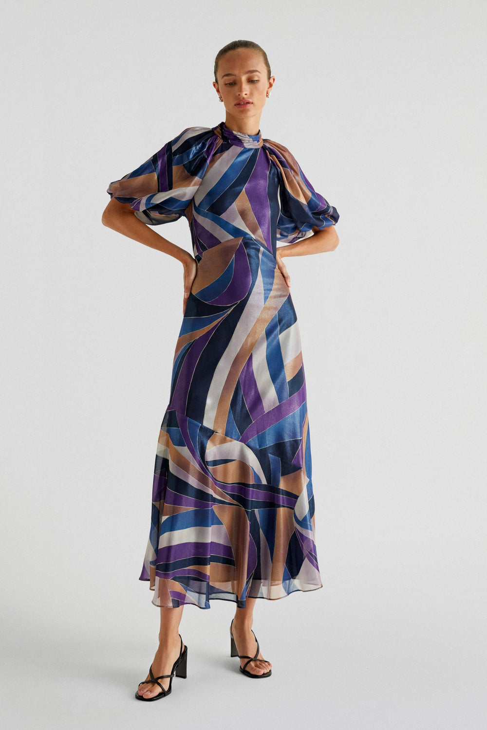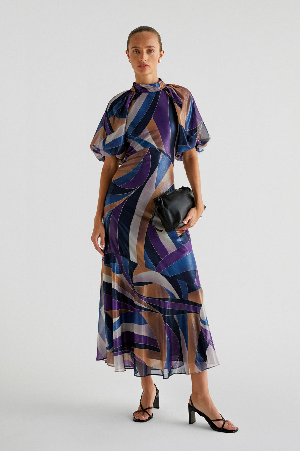 Printed midi dress made of flowing fabric. Regular fit, stand-up collar and open back with buttons. Short puffed sleeves. Frill detail on the hem.