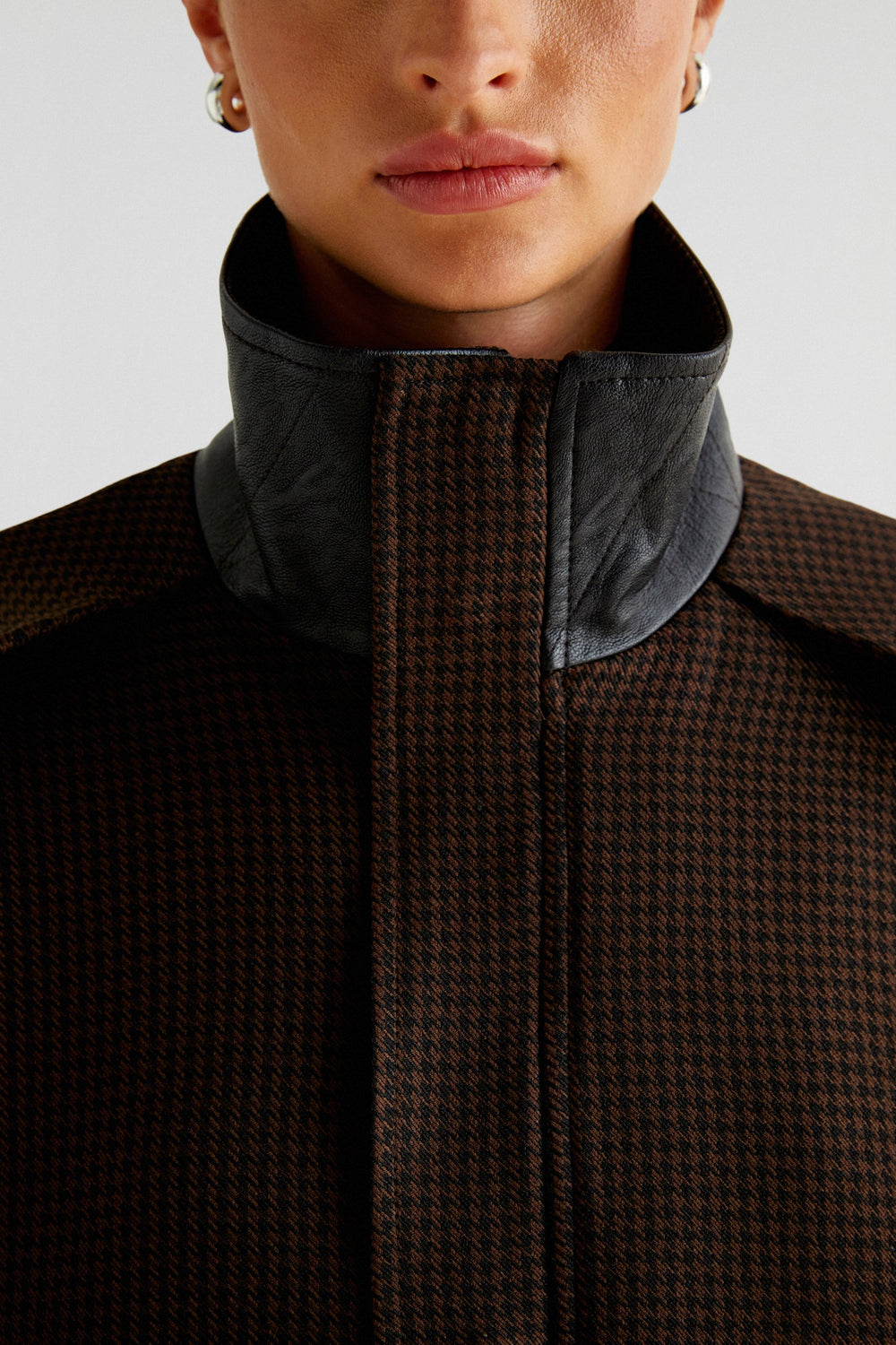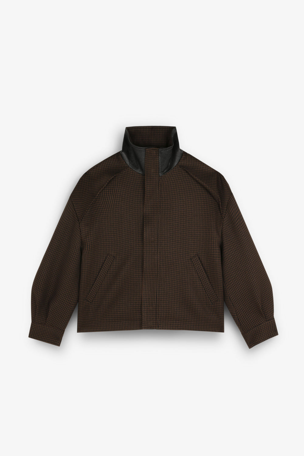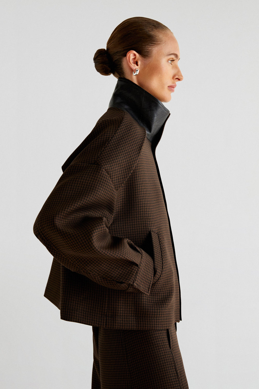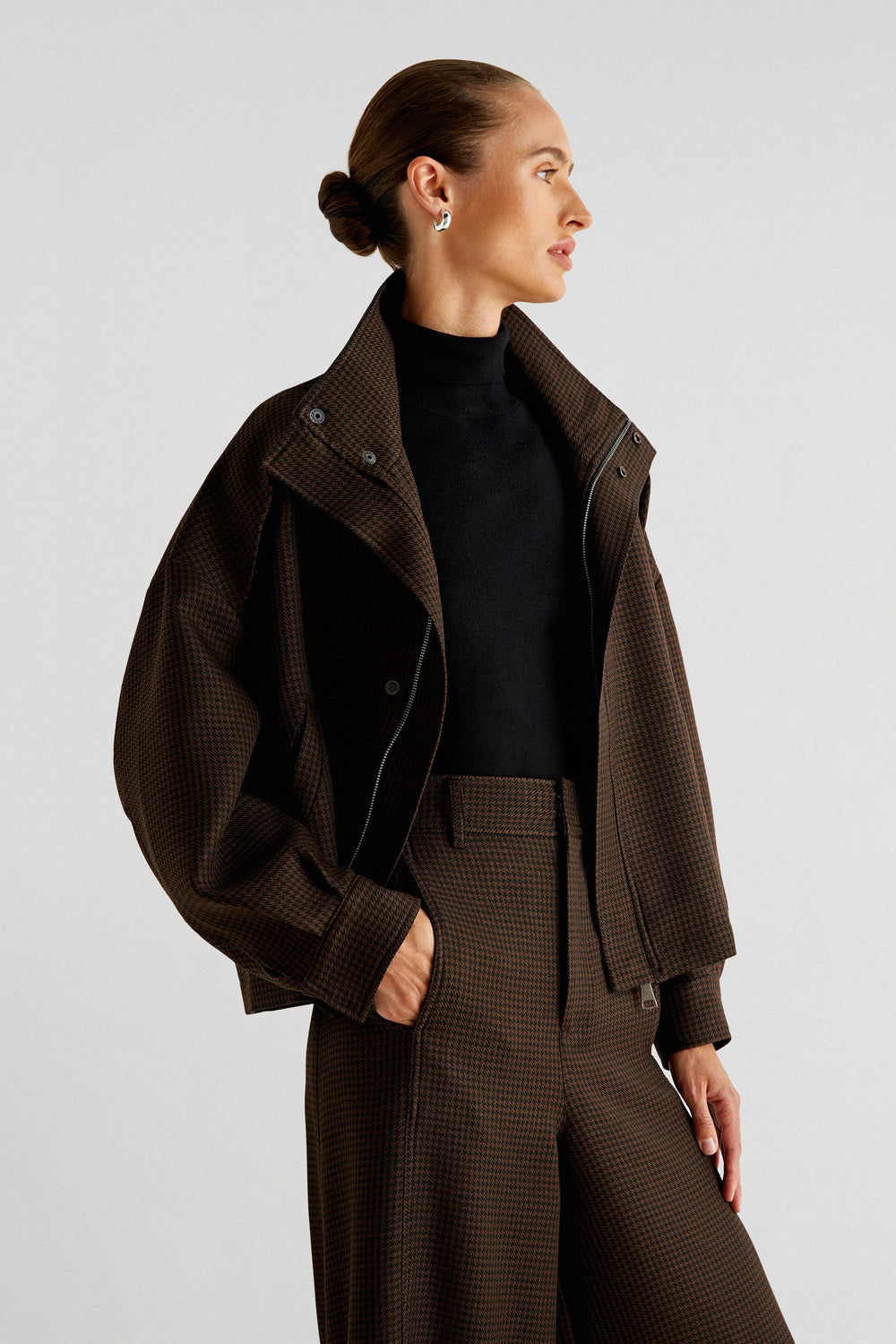 Bomber jacket made of houndstooth fabric. Slightly oversize, zip fastening and high collar with leather detail. Long raglan sleeves with button cuffs and side pockets.