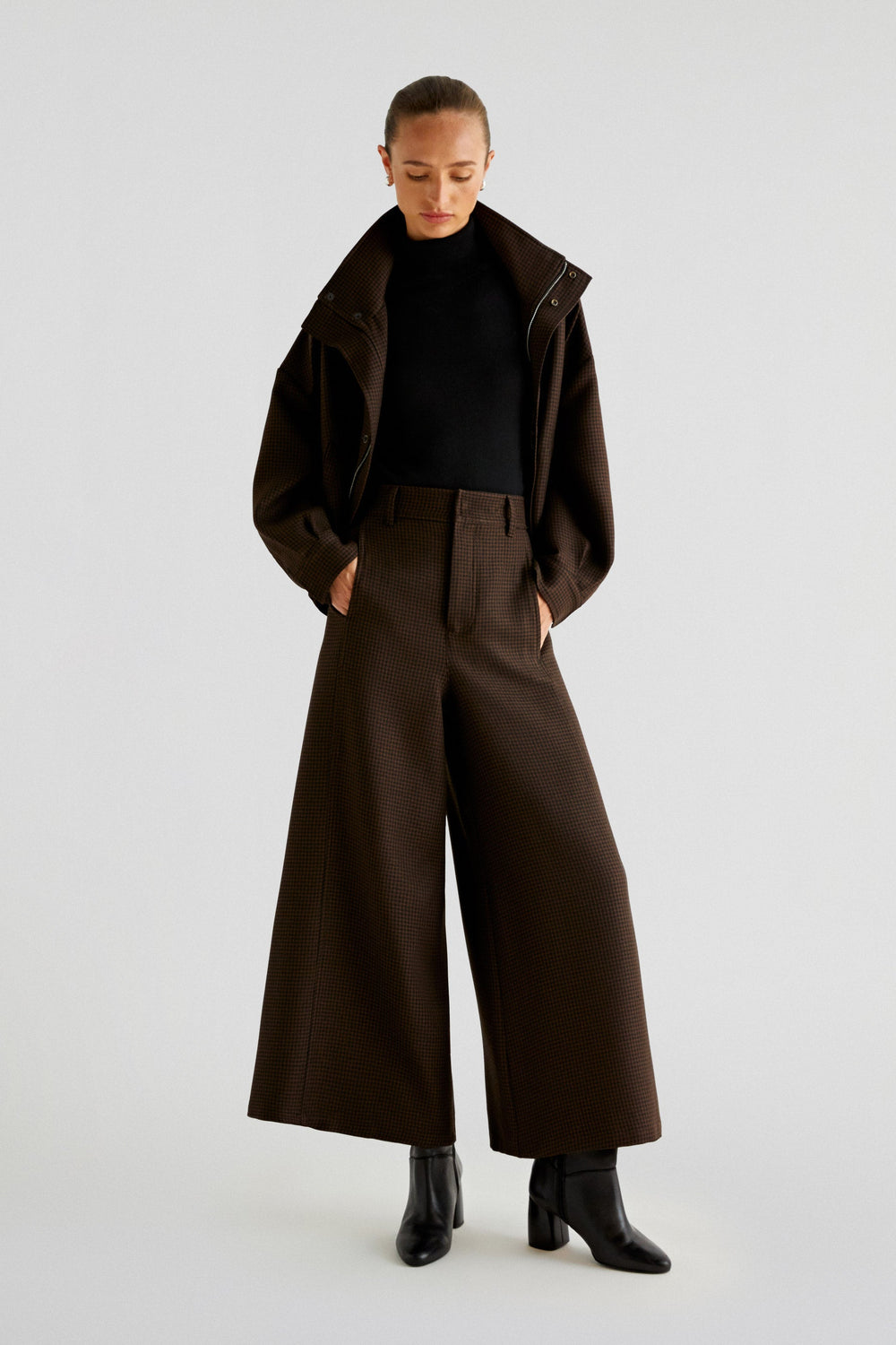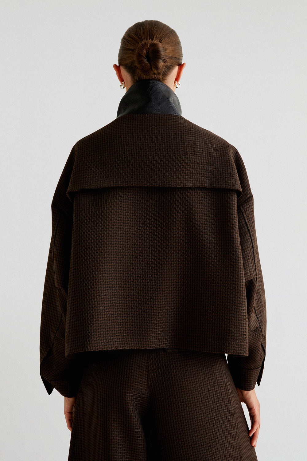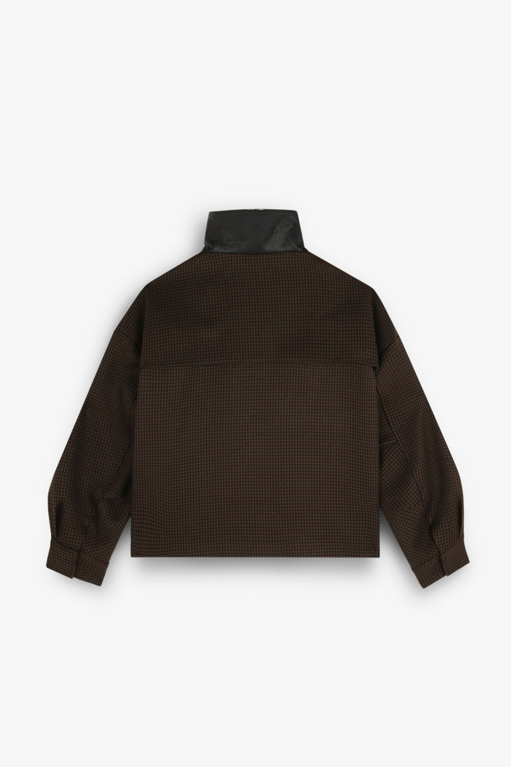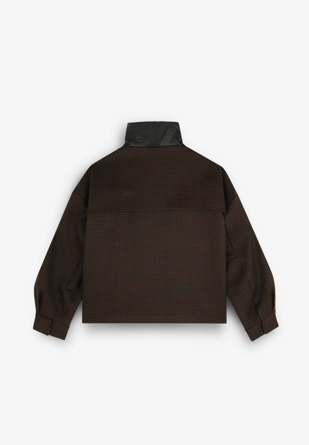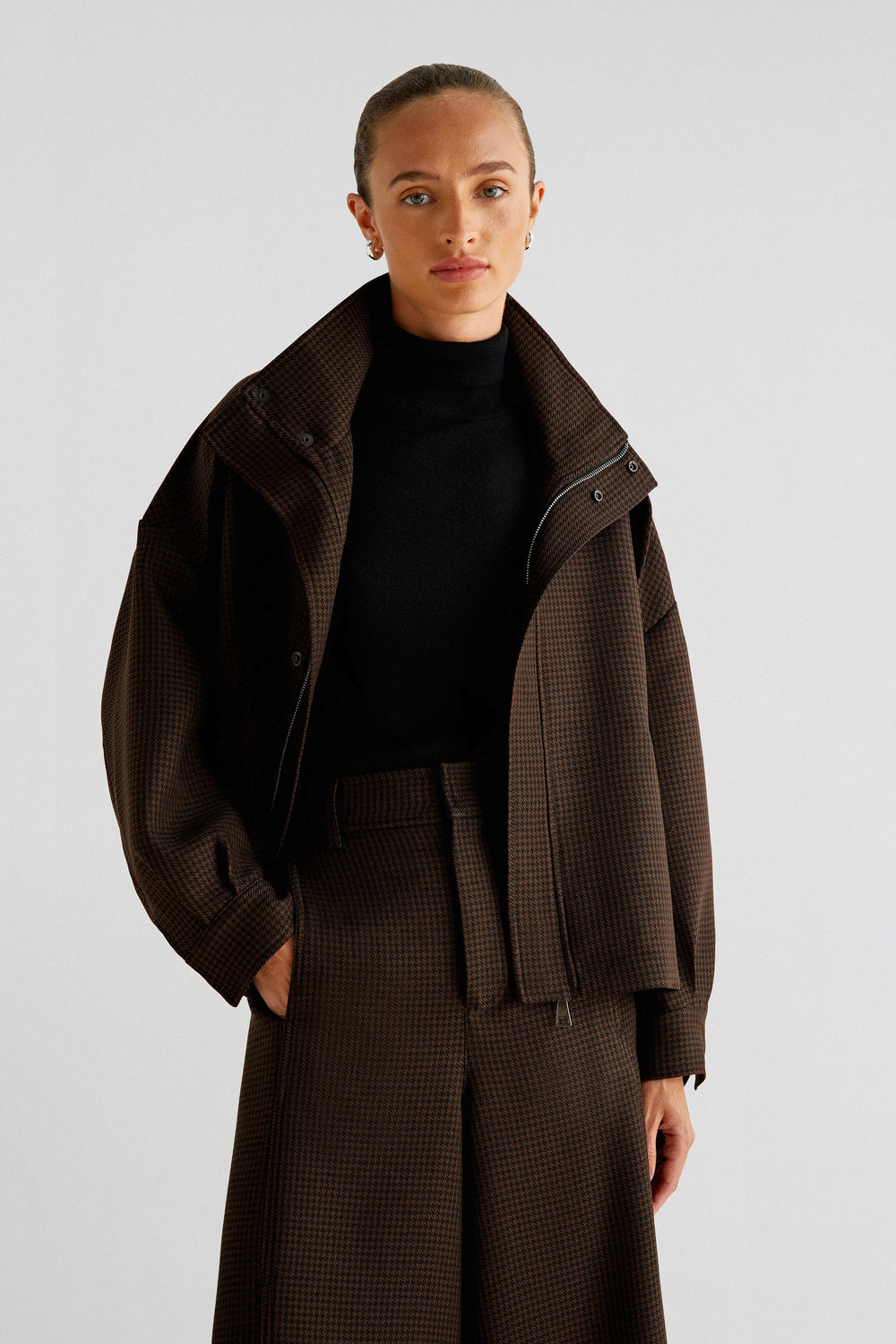 Bomber jacket made of houndstooth fabric. Slightly oversize, zip fastening and high collar with leather detail. Long raglan sleeves with button cuffs and side pockets.
