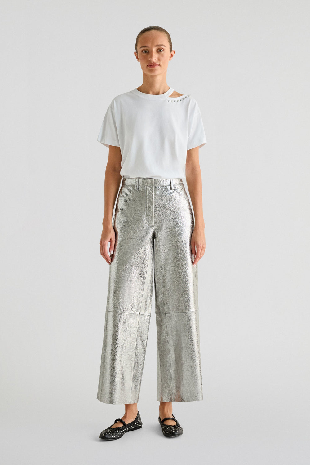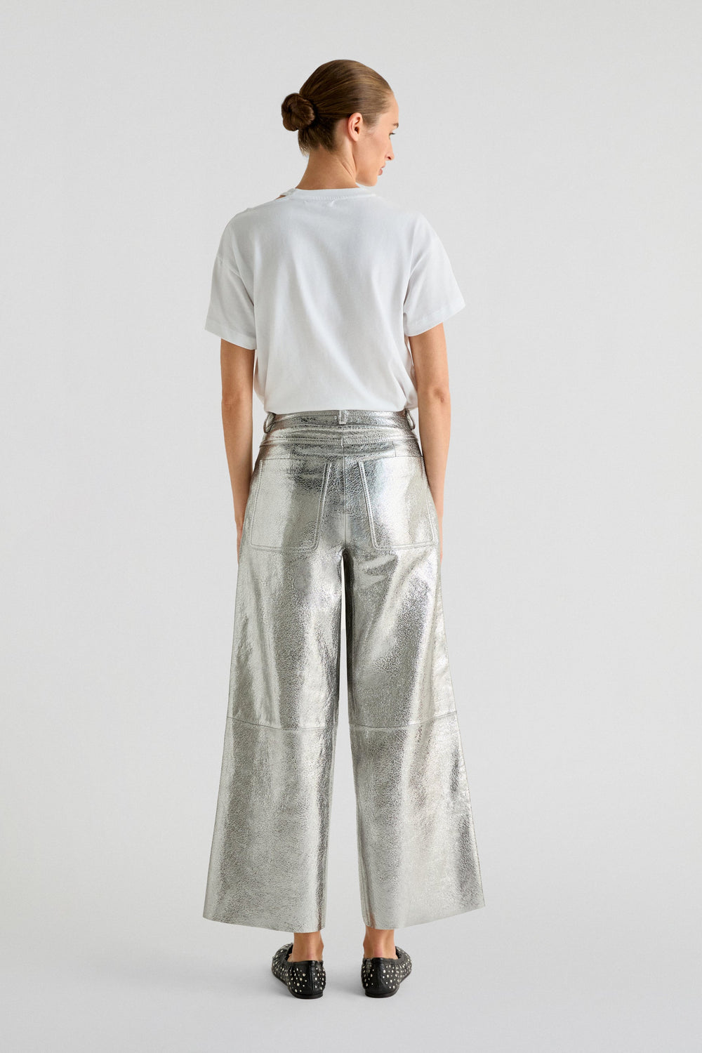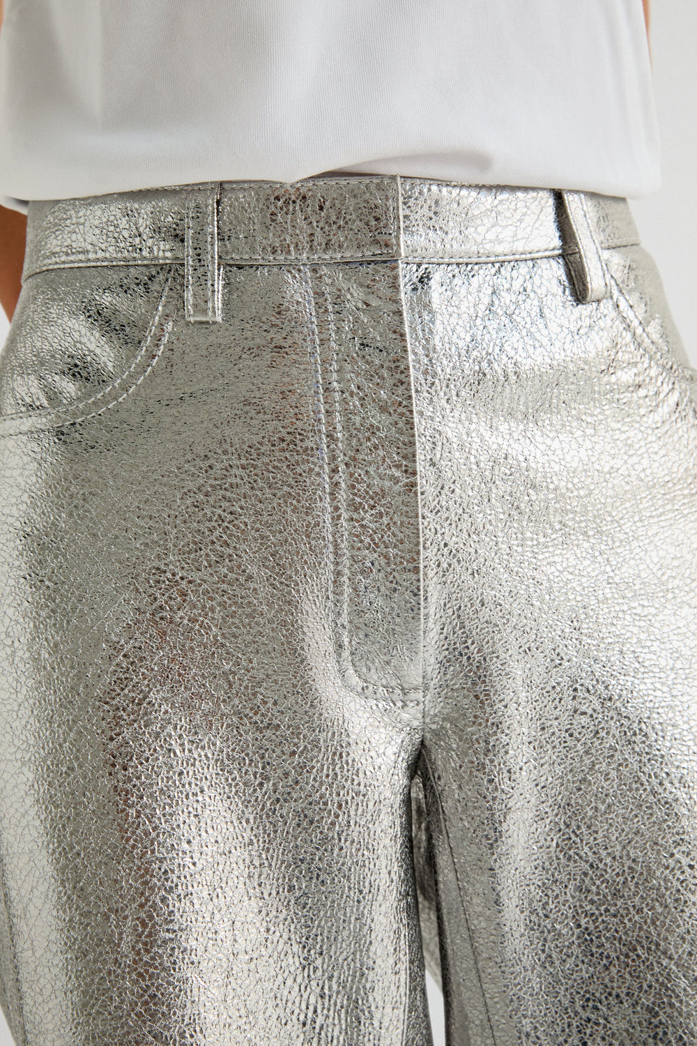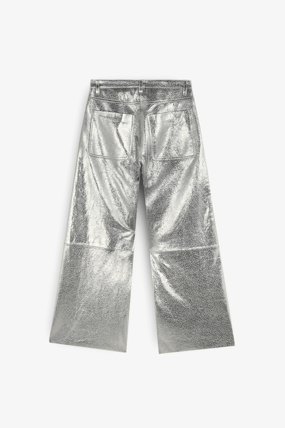 Metallic trousers made of 100% crackled leather . Ankle flare fit, mid-rise, zip fly and button fastening and side and back pockets. Belt loops and seam detail on the leg.