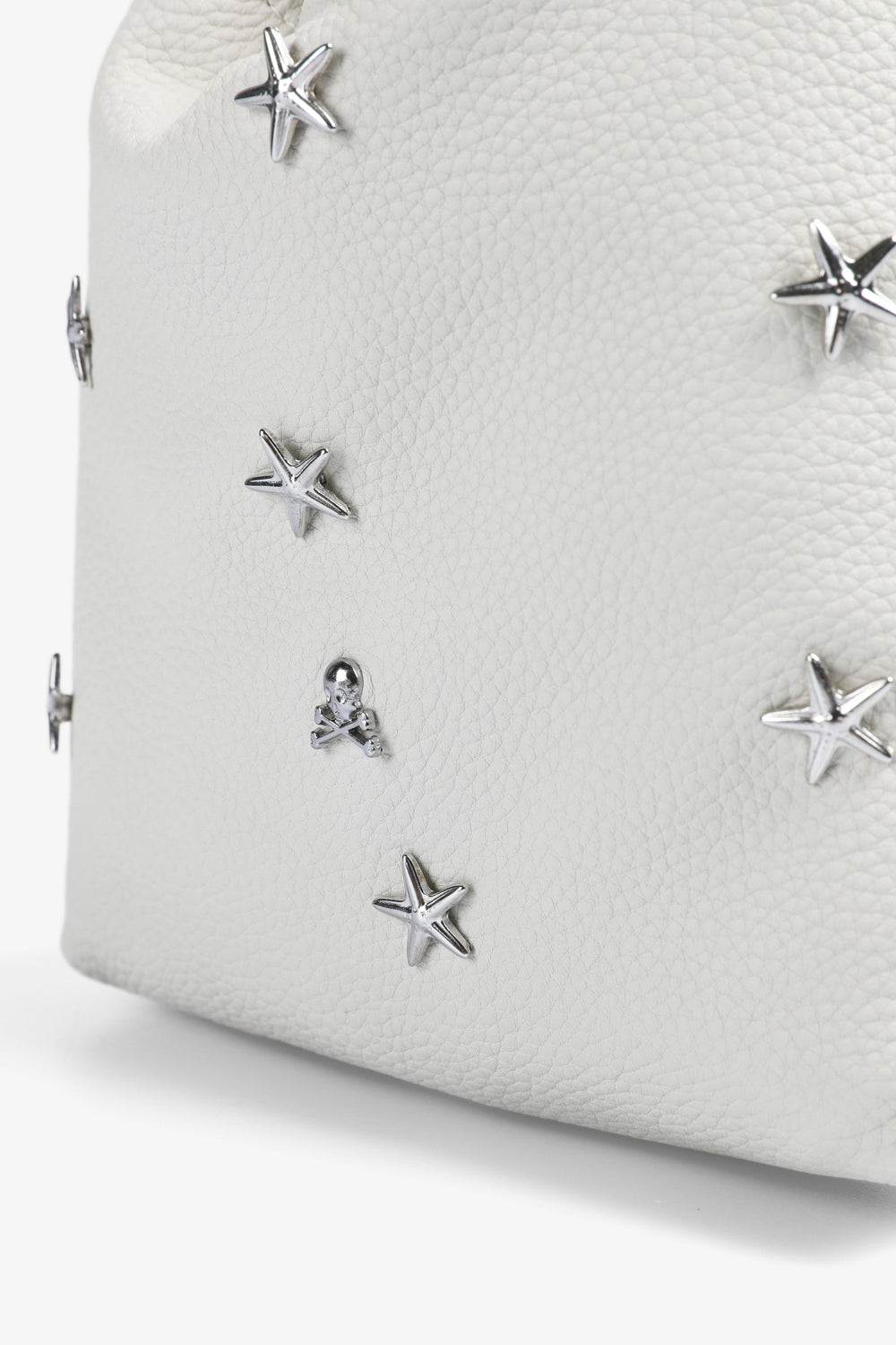 Small crossbody bucket bag. Made from 100% leather. Adjustable strap closure. Long double handle. Logo engraved on the back. Skull studs and stars detail on the front.