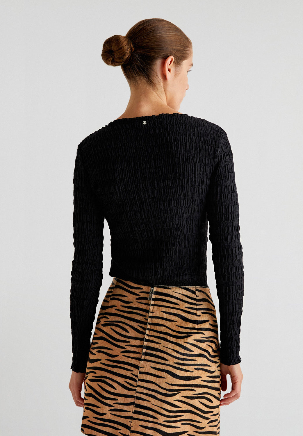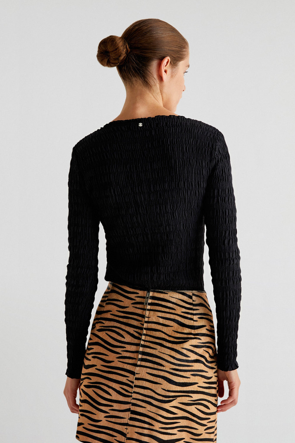Gathered T-shirt made of a cotton blend. Regular fit, boat neck and long sleeves.
