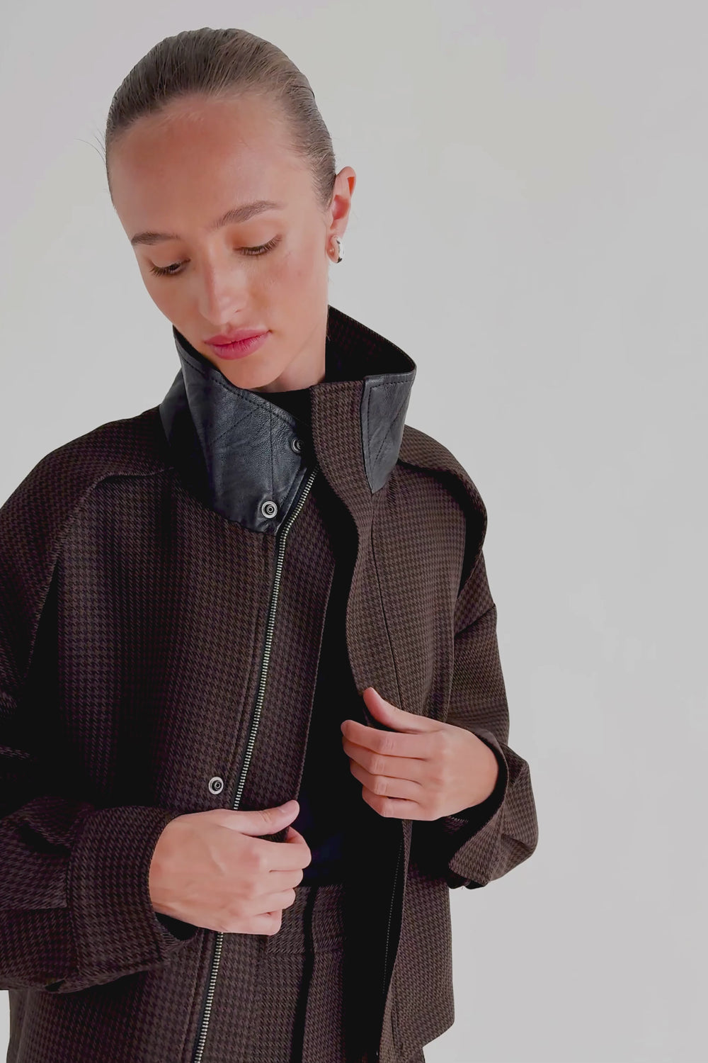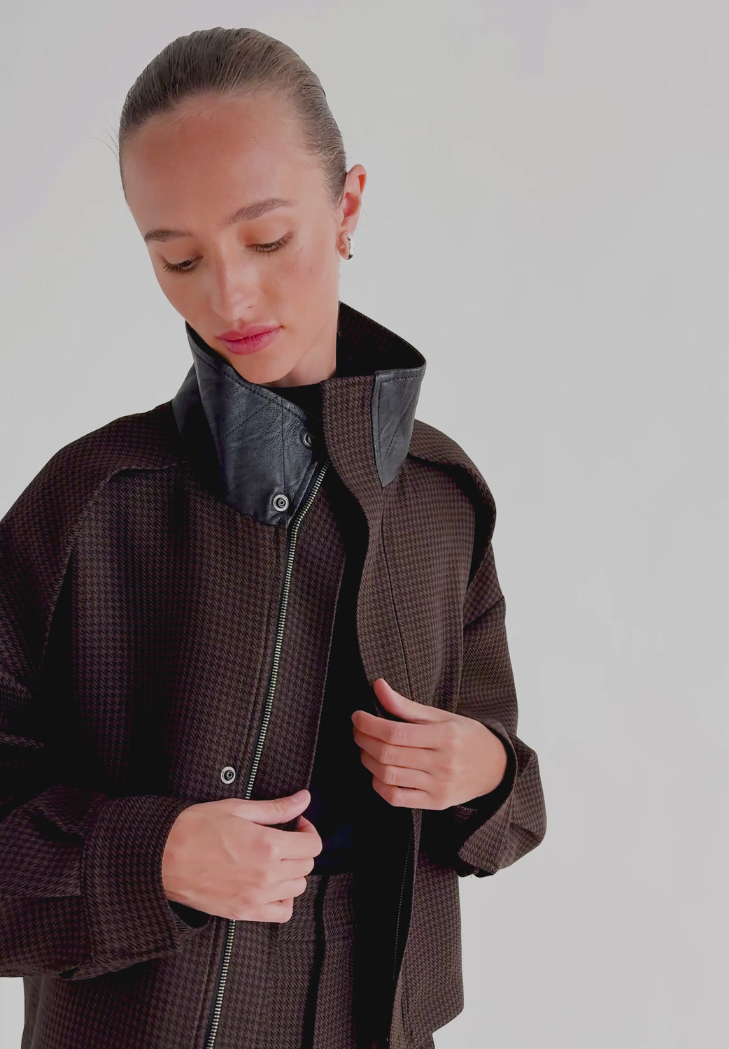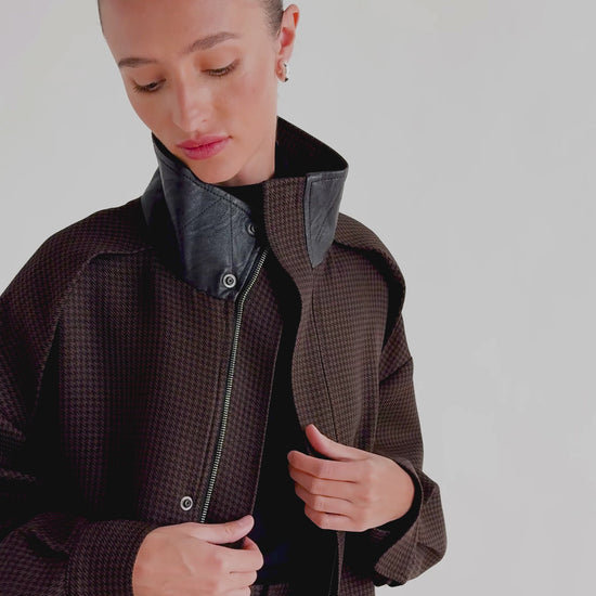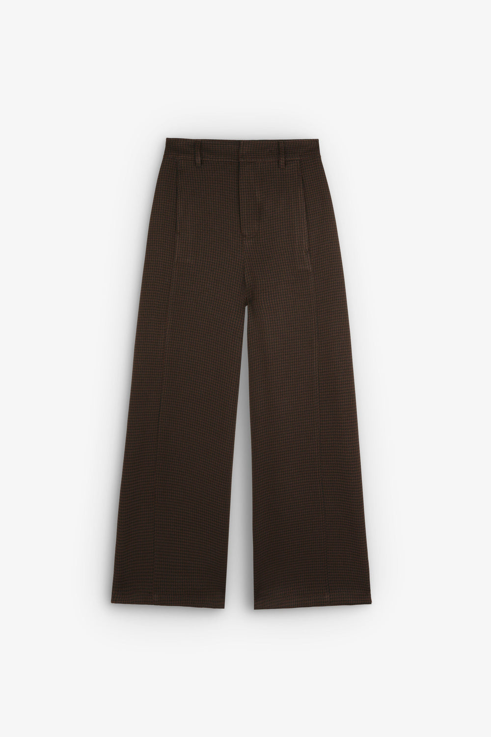 Trousers made of houndstooth fabric. Wide culottes, hook and zip fastening and belt loops at the waist. Side pockets.