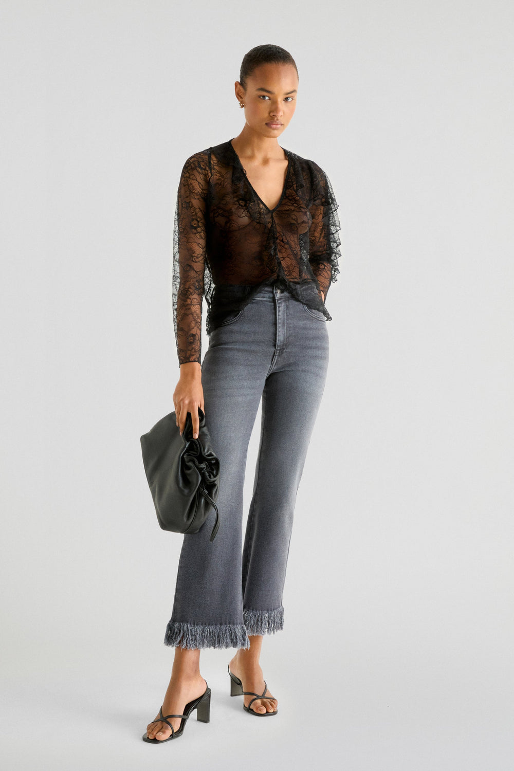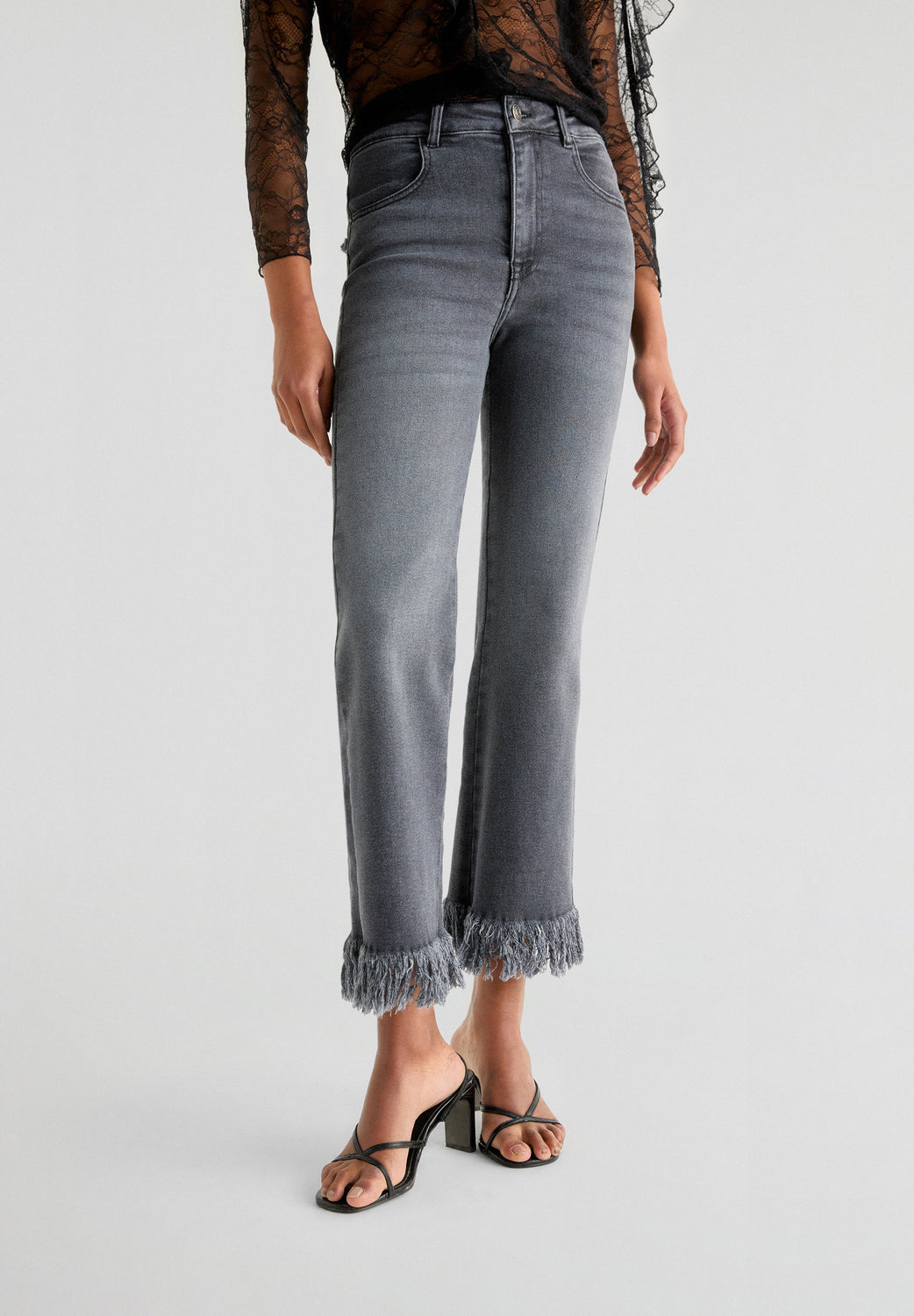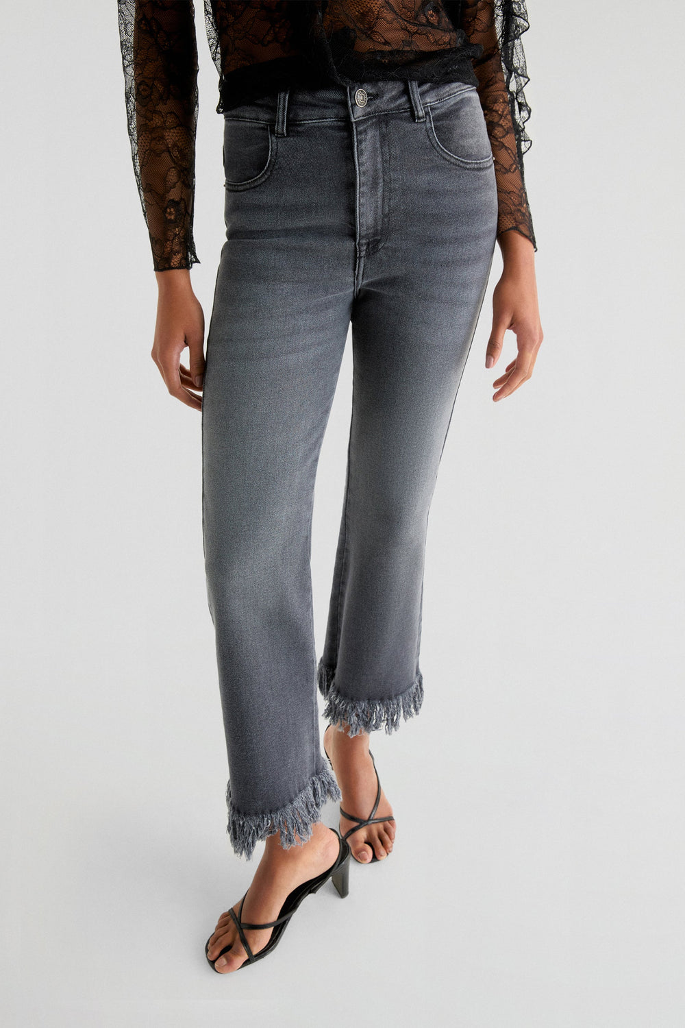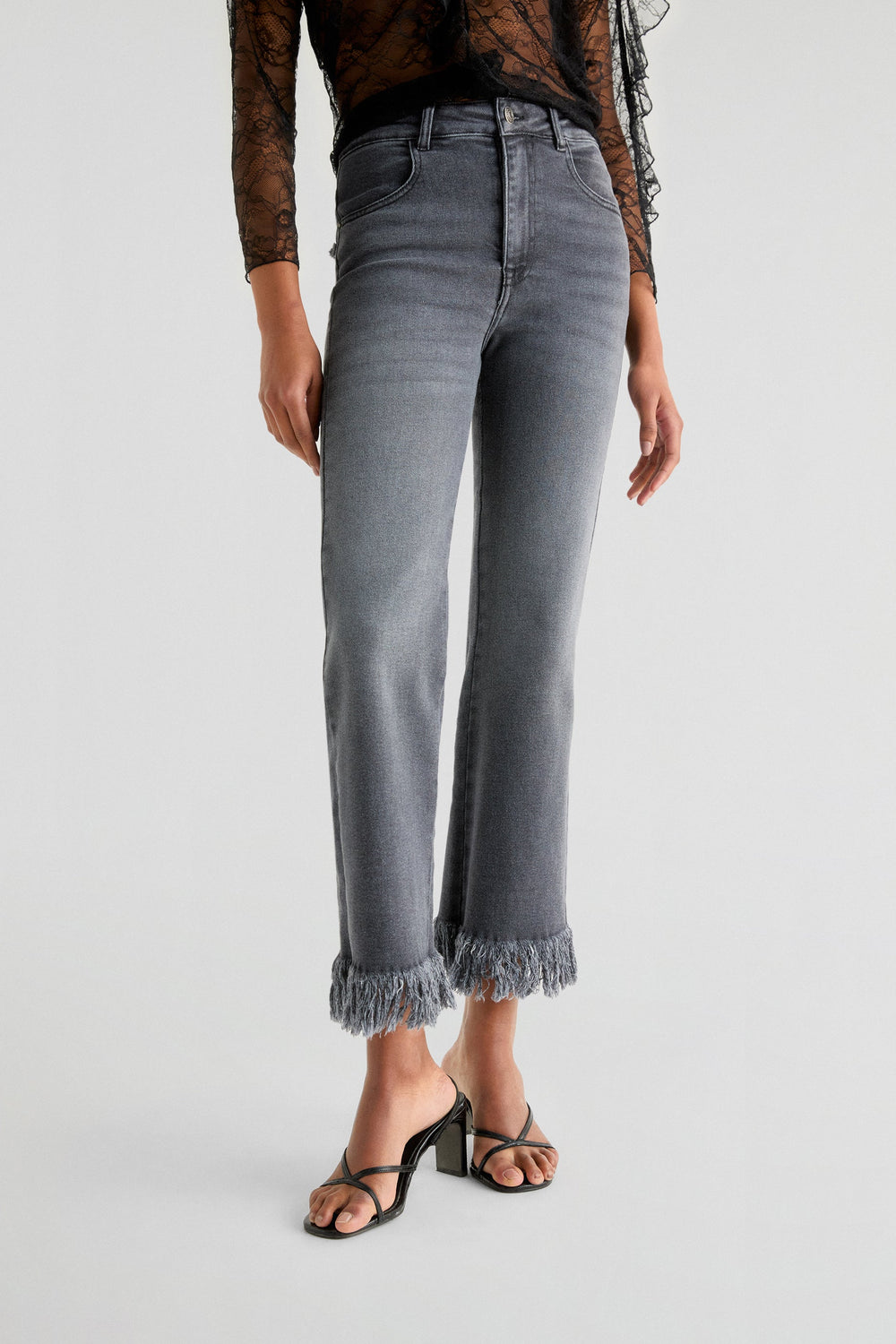 Culotte jeans. Button and zip fly fastening pockets and frayed edge hems. Features belt loops.