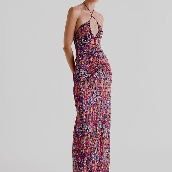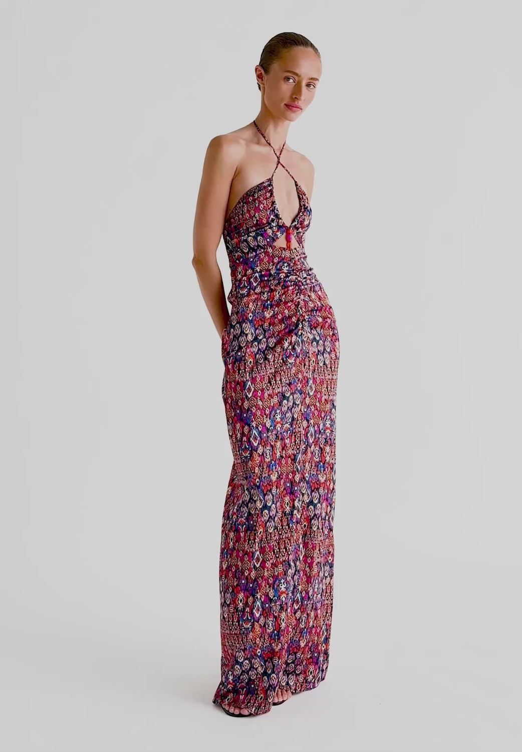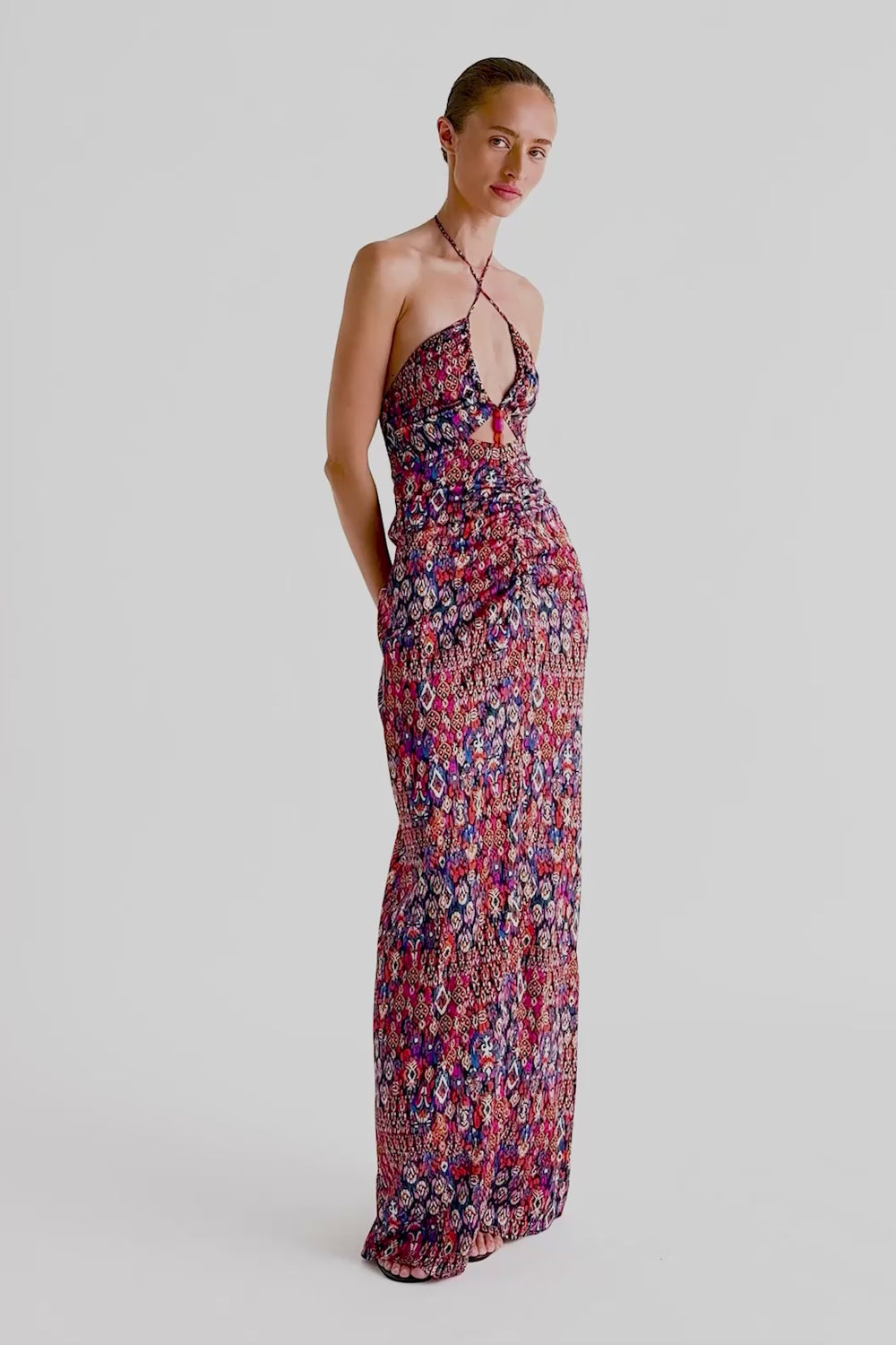 Long dress with a patterned fabric. Slim fit with gathered front, open neck with straps. Elastic smocking on the back.