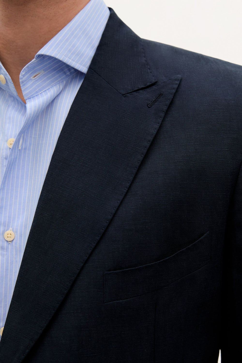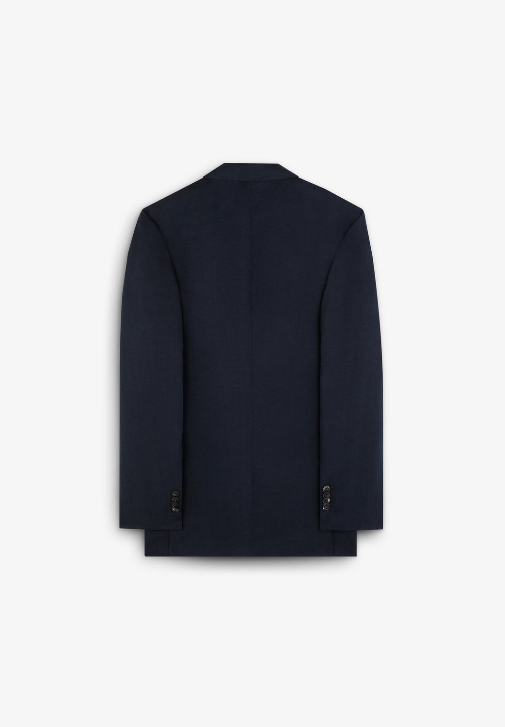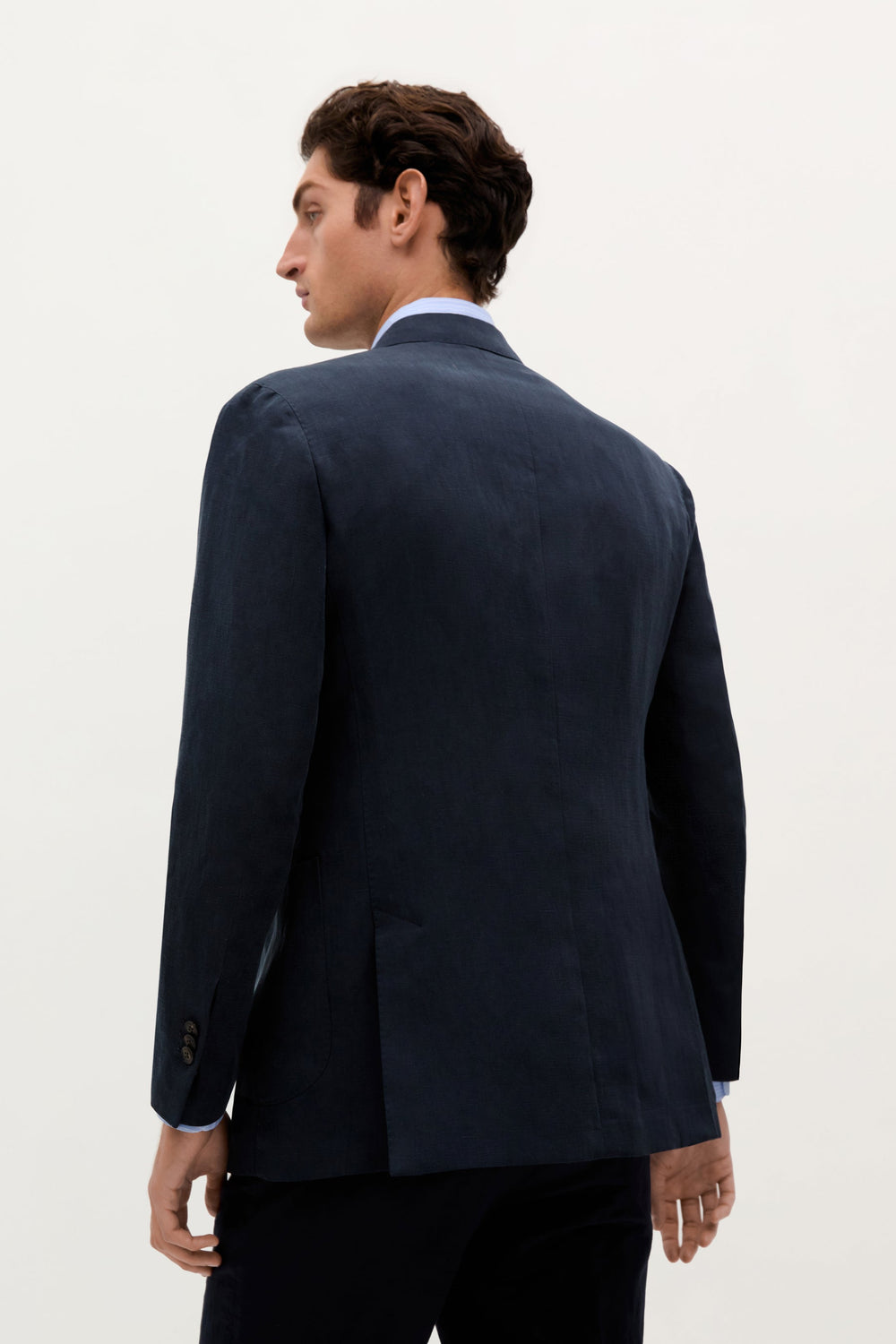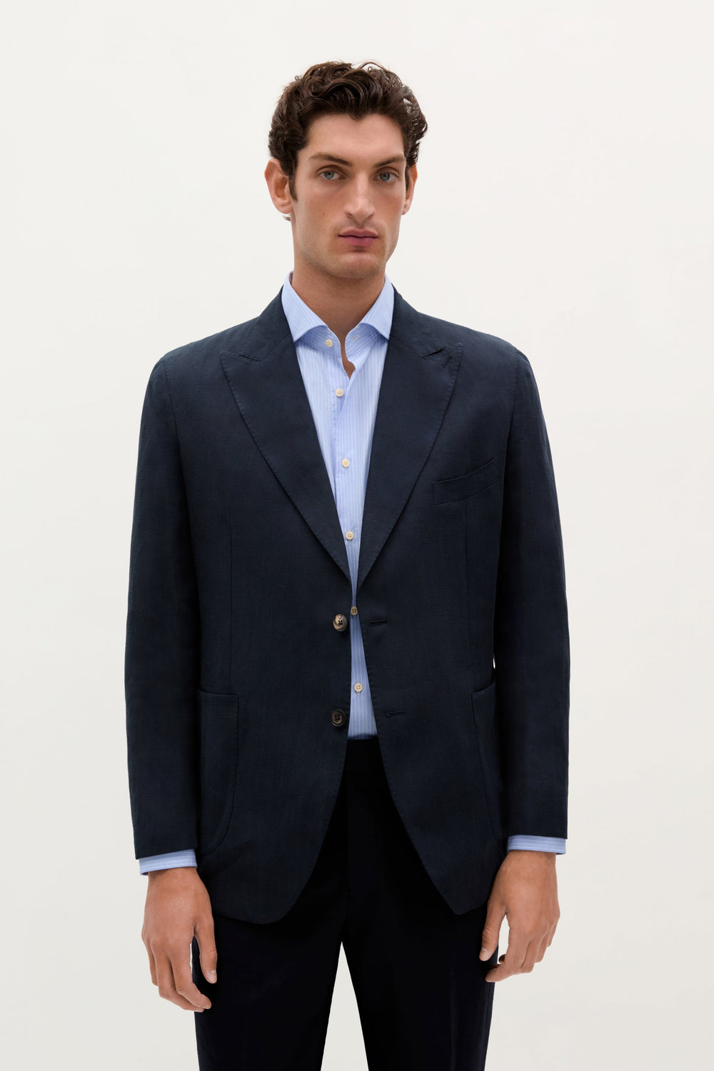 Chaqueta confeccionada en Lino de corte entallado sport. Cierre de botonadura simple. Solapas de muesca. Bolsillo de ojal en el pecho, bolsillos de solapa laterales. Abertura trasera. Forro interior.