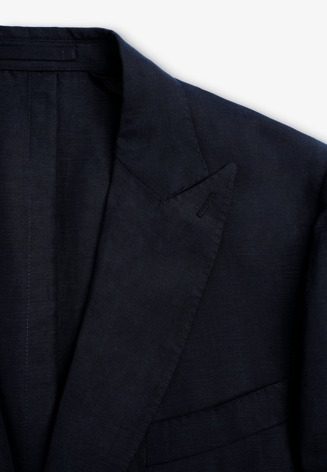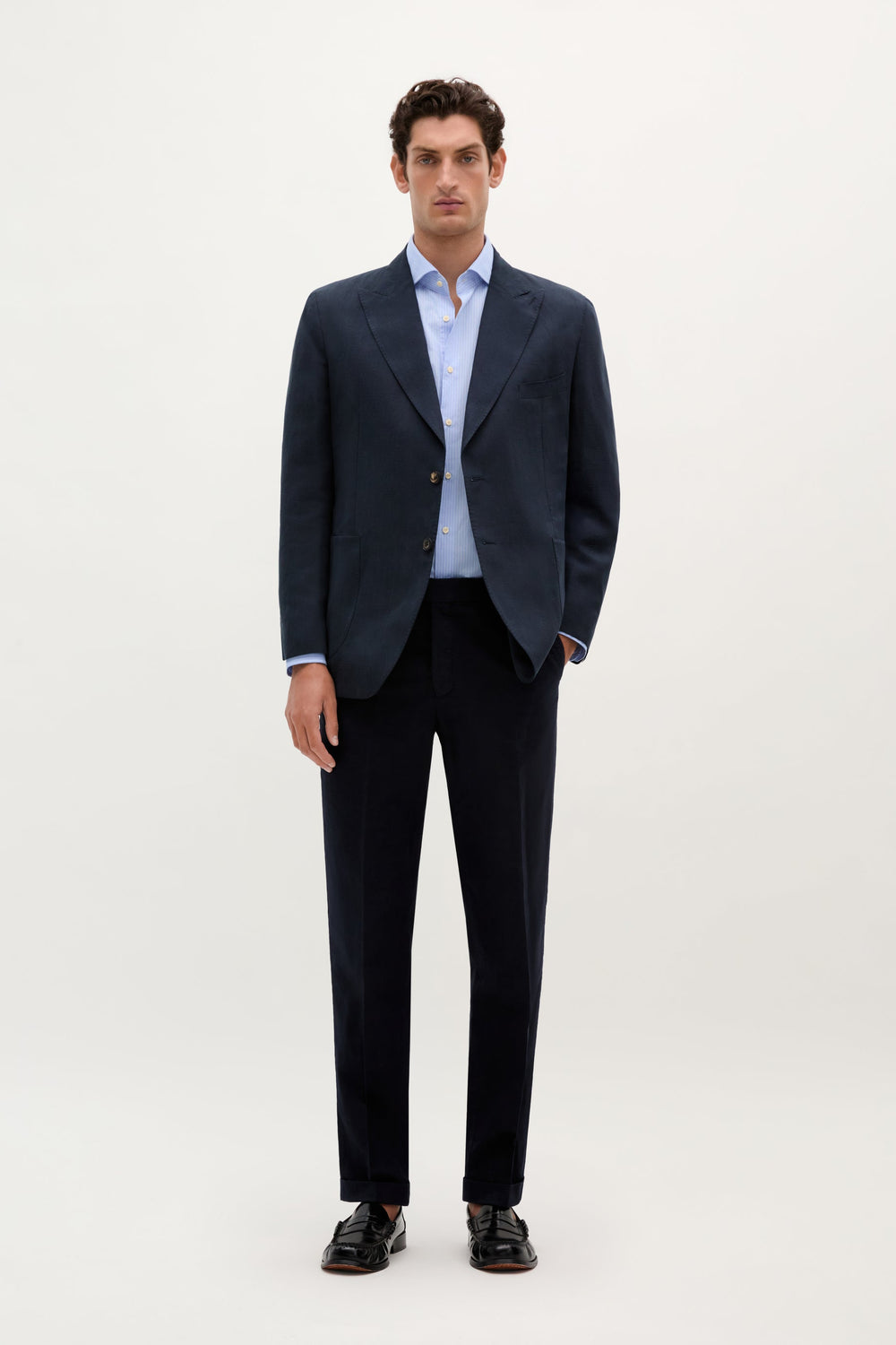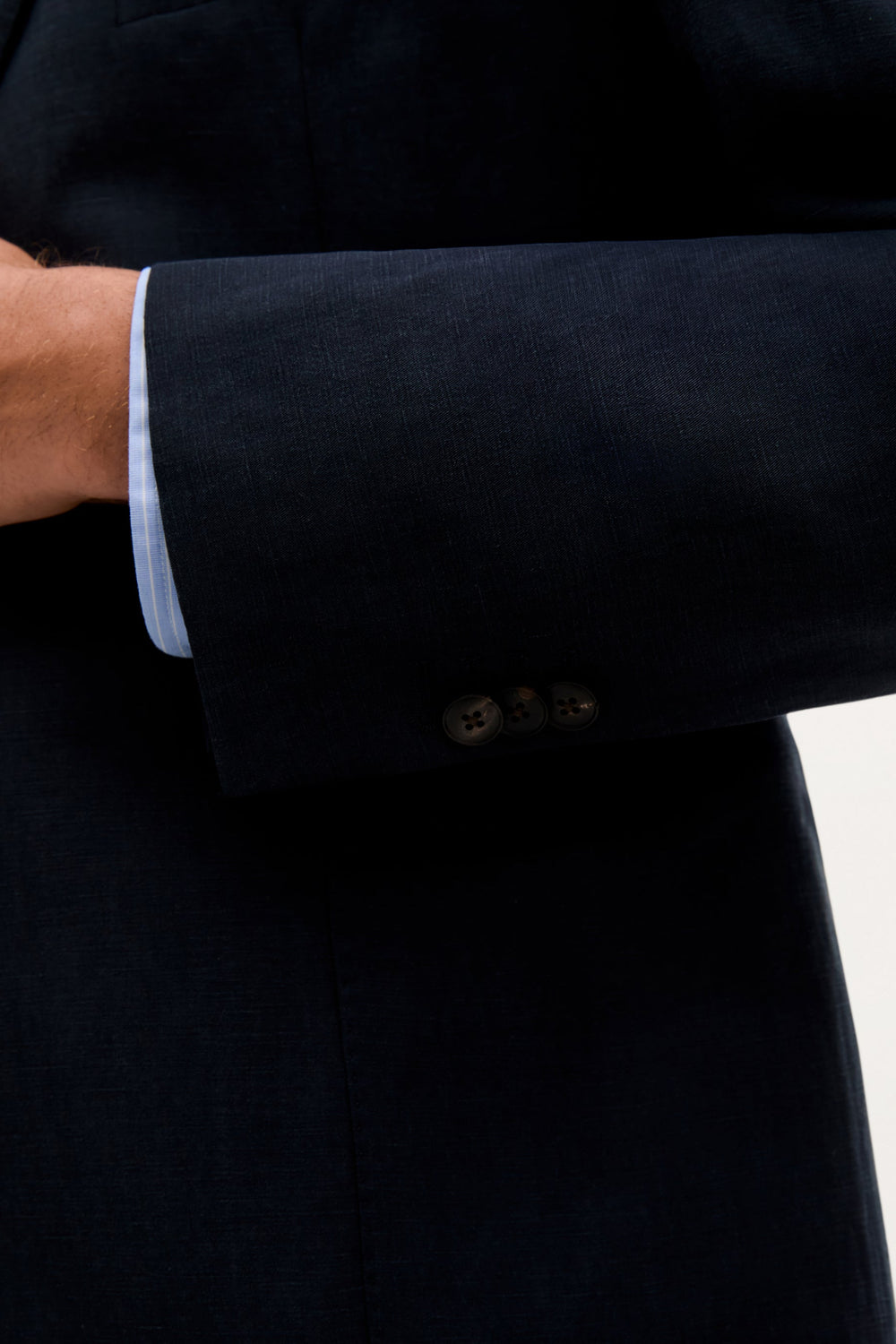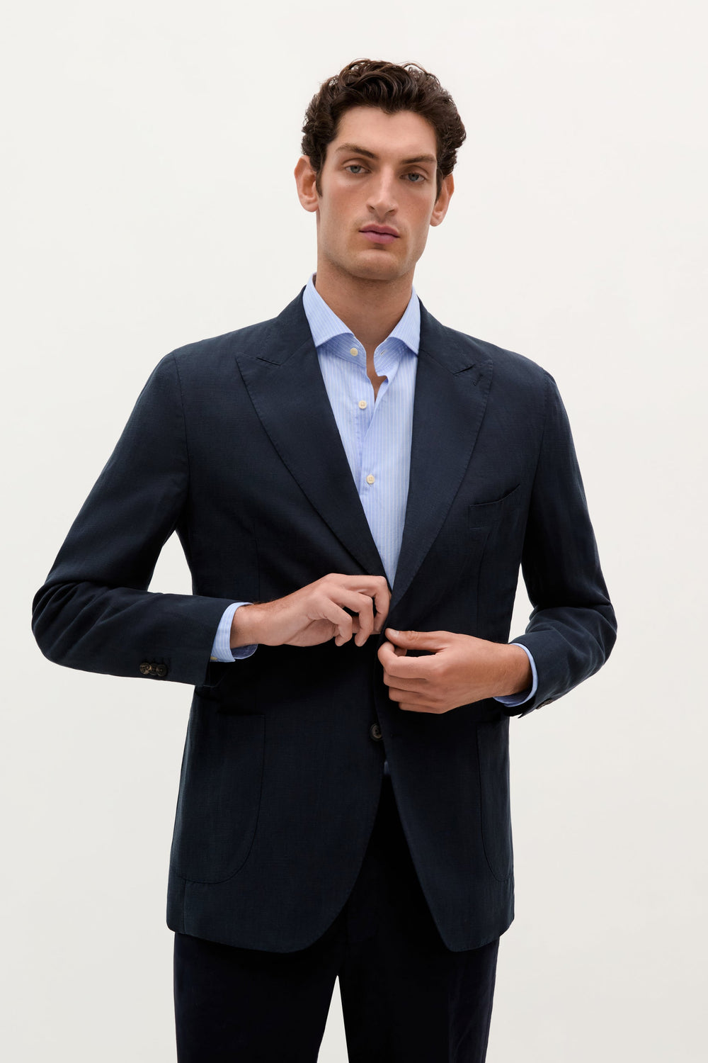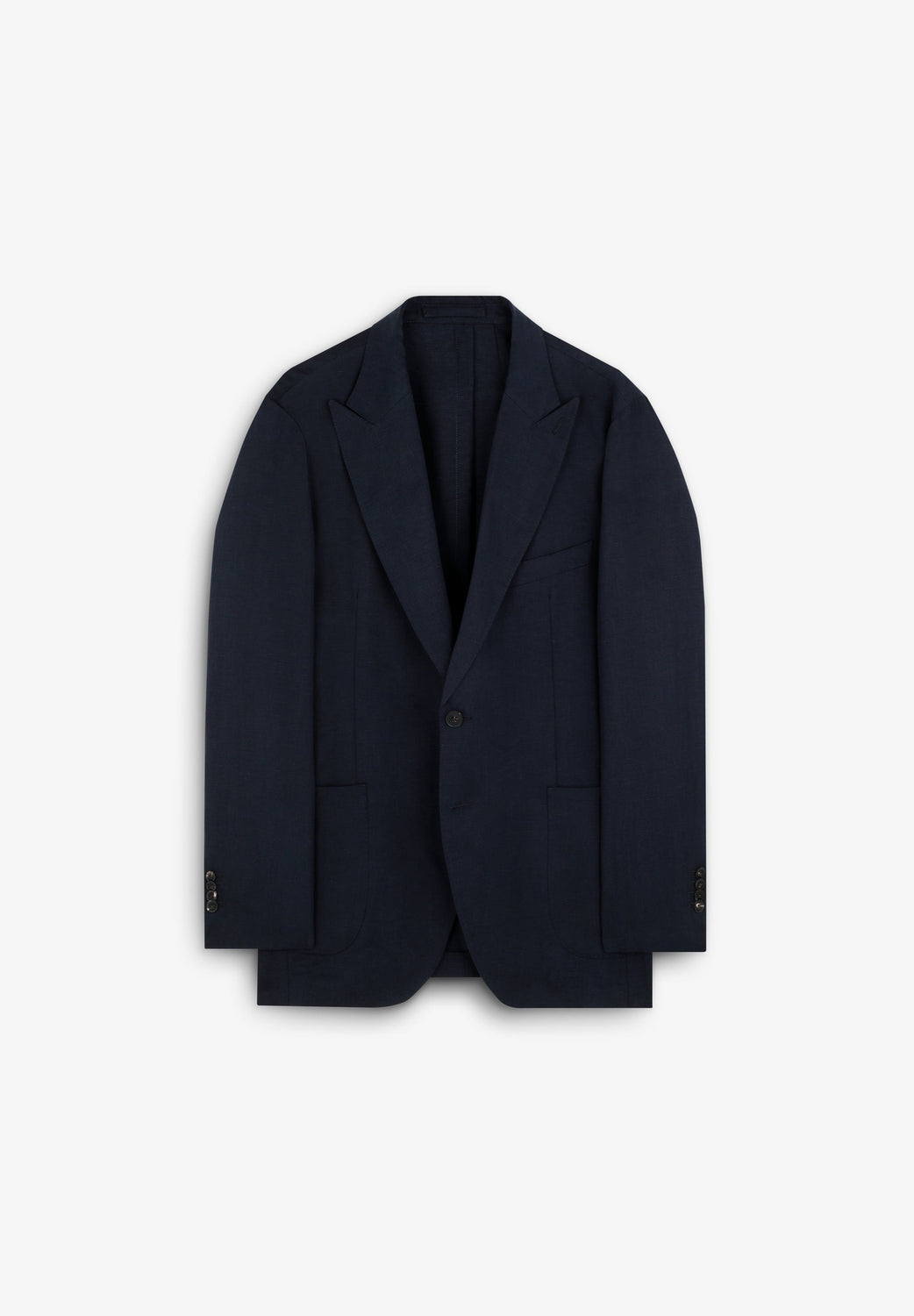 Chaqueta confeccionada en Lino de corte entallado sport. Cierre de botonadura simple. Solapas de muesca. Bolsillo de ojal en el pecho, bolsillos de solapa laterales. Abertura trasera. Forro interior.
